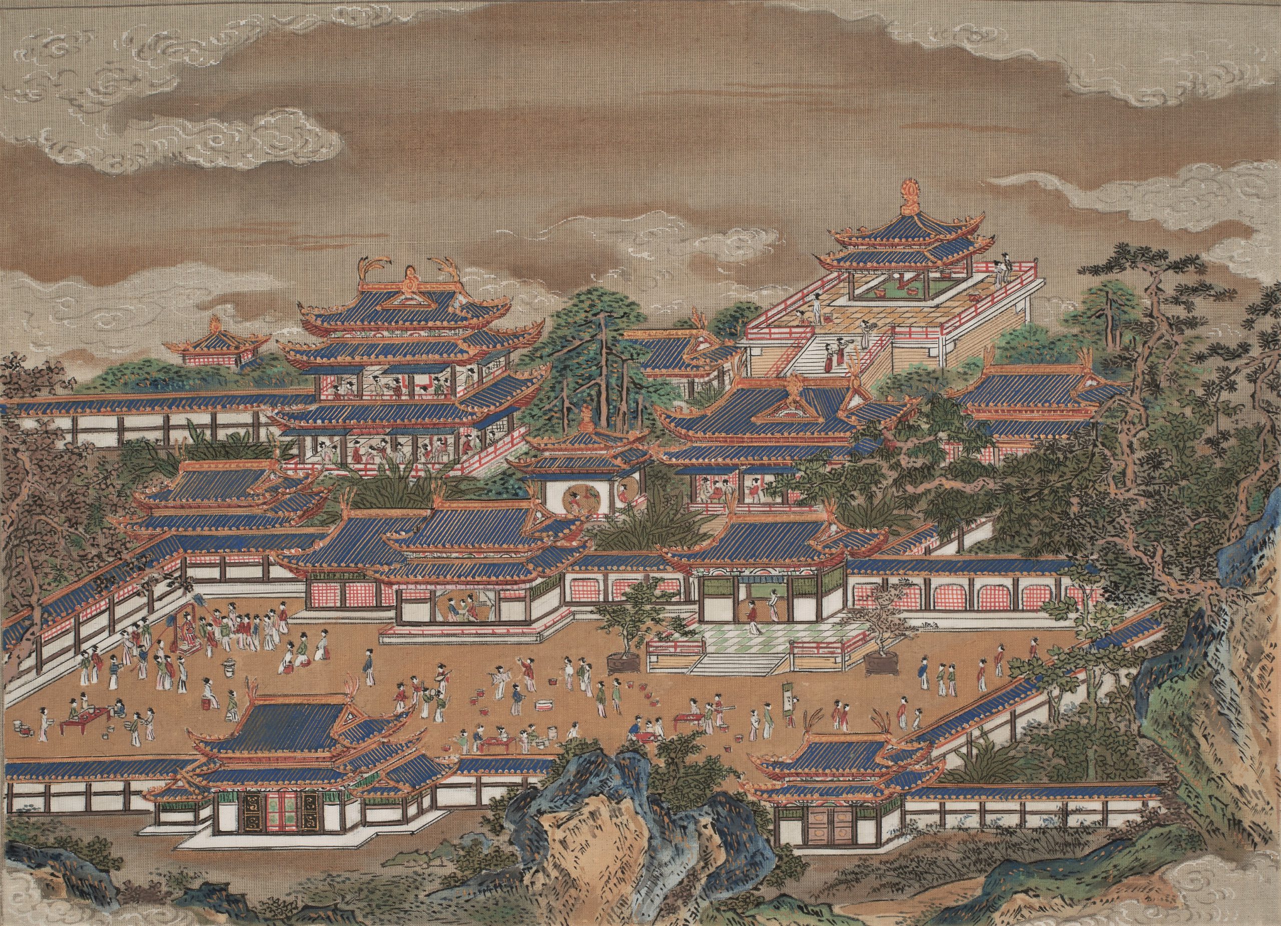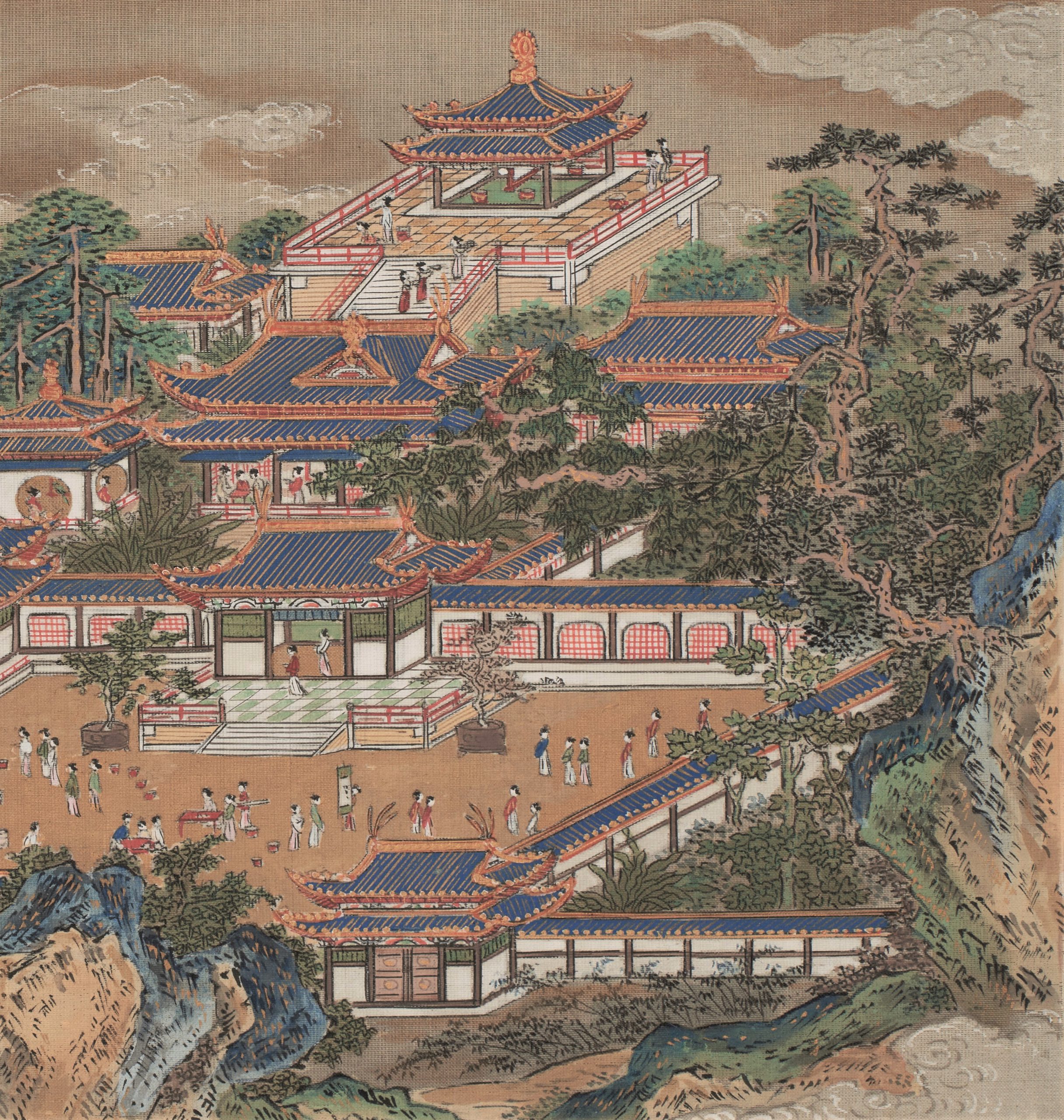 Within a small frame in the center of the screen, a huge Chinese-style building is depicted. Surrounded by trees, this tower is very glittering, using red, blue, and gold as its base color. A close inspection of the women playing there reveals that some are dancing in the garden, others are playing musical instruments, and still others are admiring calligraphy and paintings. In the circular window painted in the center of the building is a woman facing a green parrot.