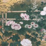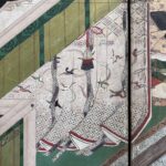 The scene depicted on the left screen is from the 28th chapter, “Nowaki ”.The morning after a violent typhoon(Nowaki)blew through the capital, Prince Hikaru Genji, accompanied by his son Yugiri, went to Rokujo-in Temple to visit Empress Akikonomu.