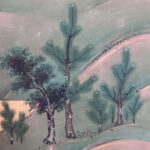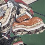 In the New Year, Hikaru Genji visits Rokujoin Temple to visit the Princess of Akashi. The festive atmosphere of the scene depicts the wives celebrating the New Year in their own ways: one makes a Kagamimochi, another pulls a twig from a pine tree to wish for a long life.