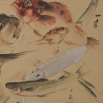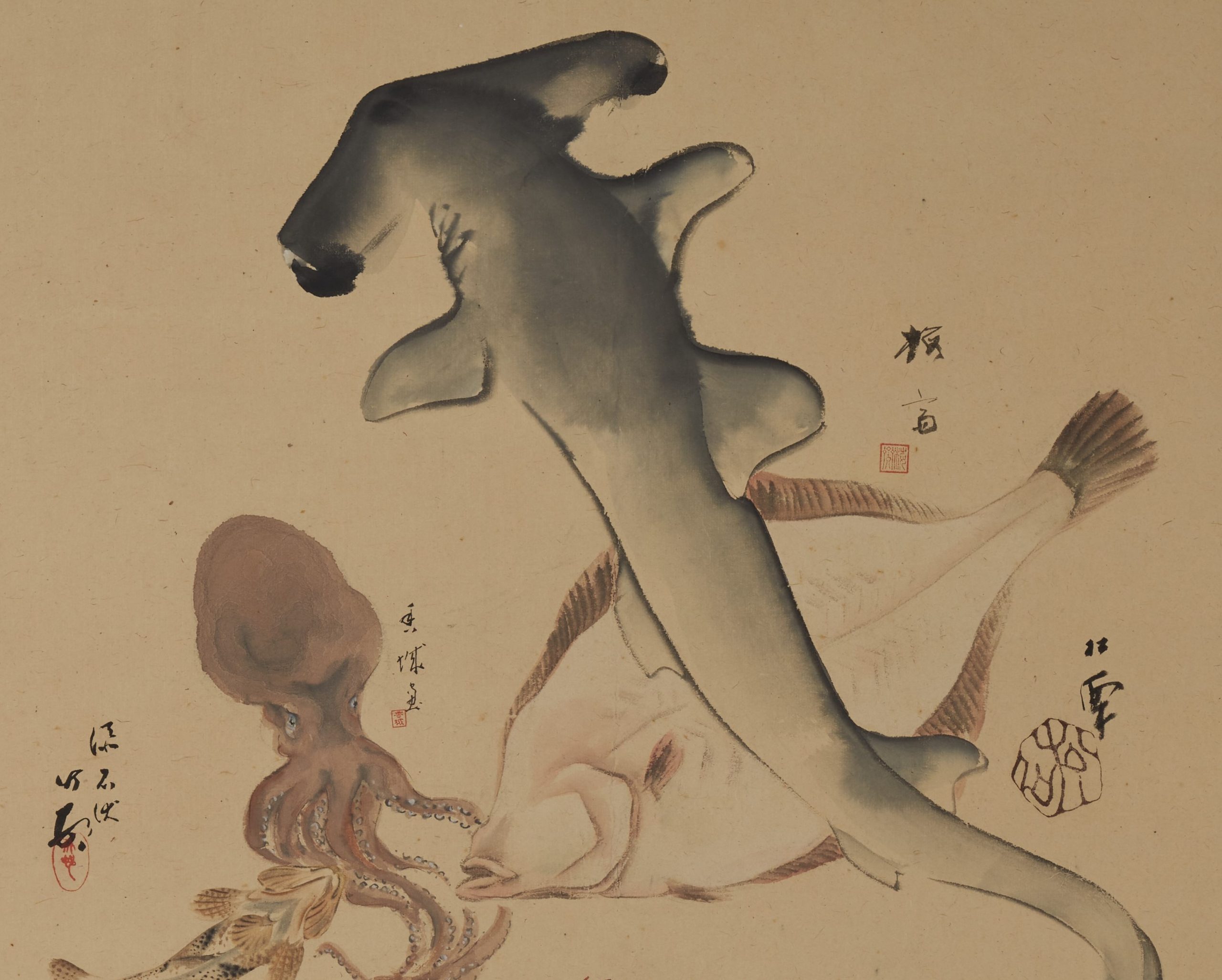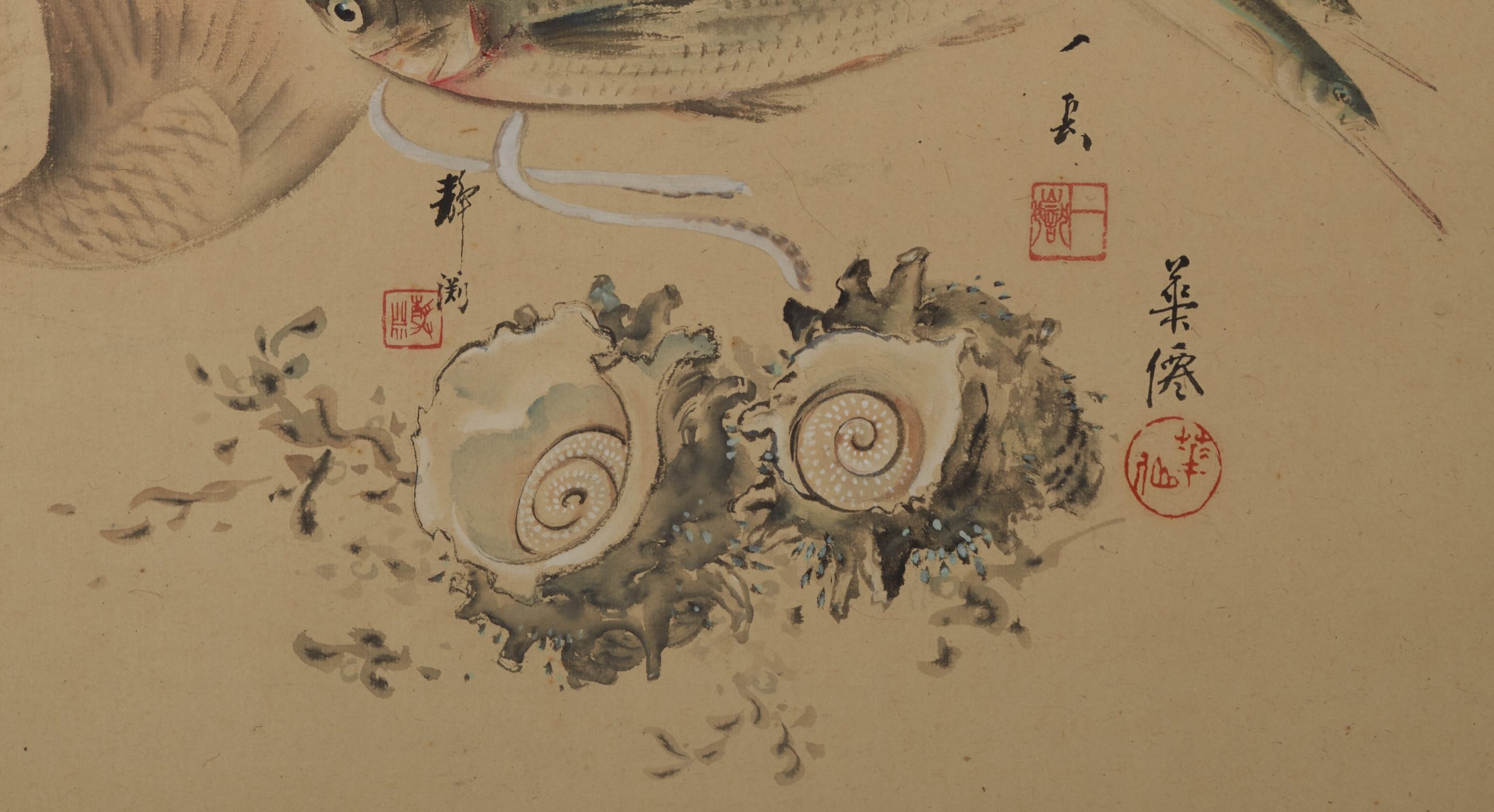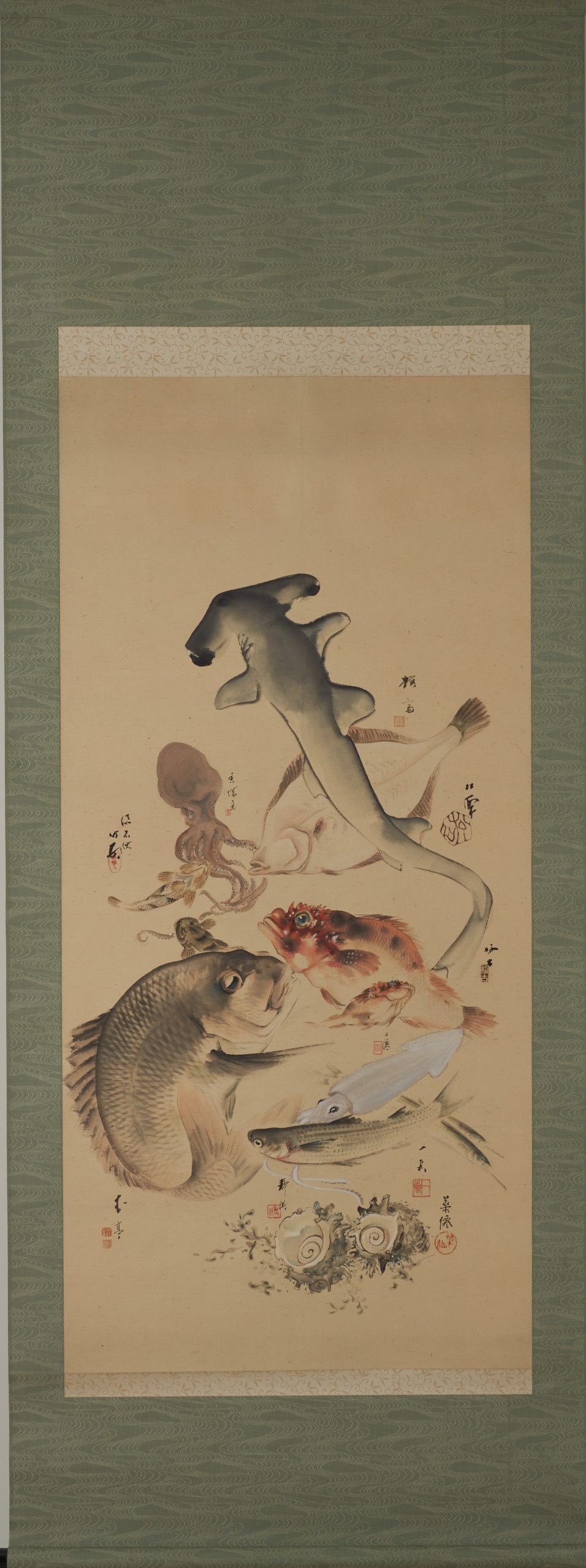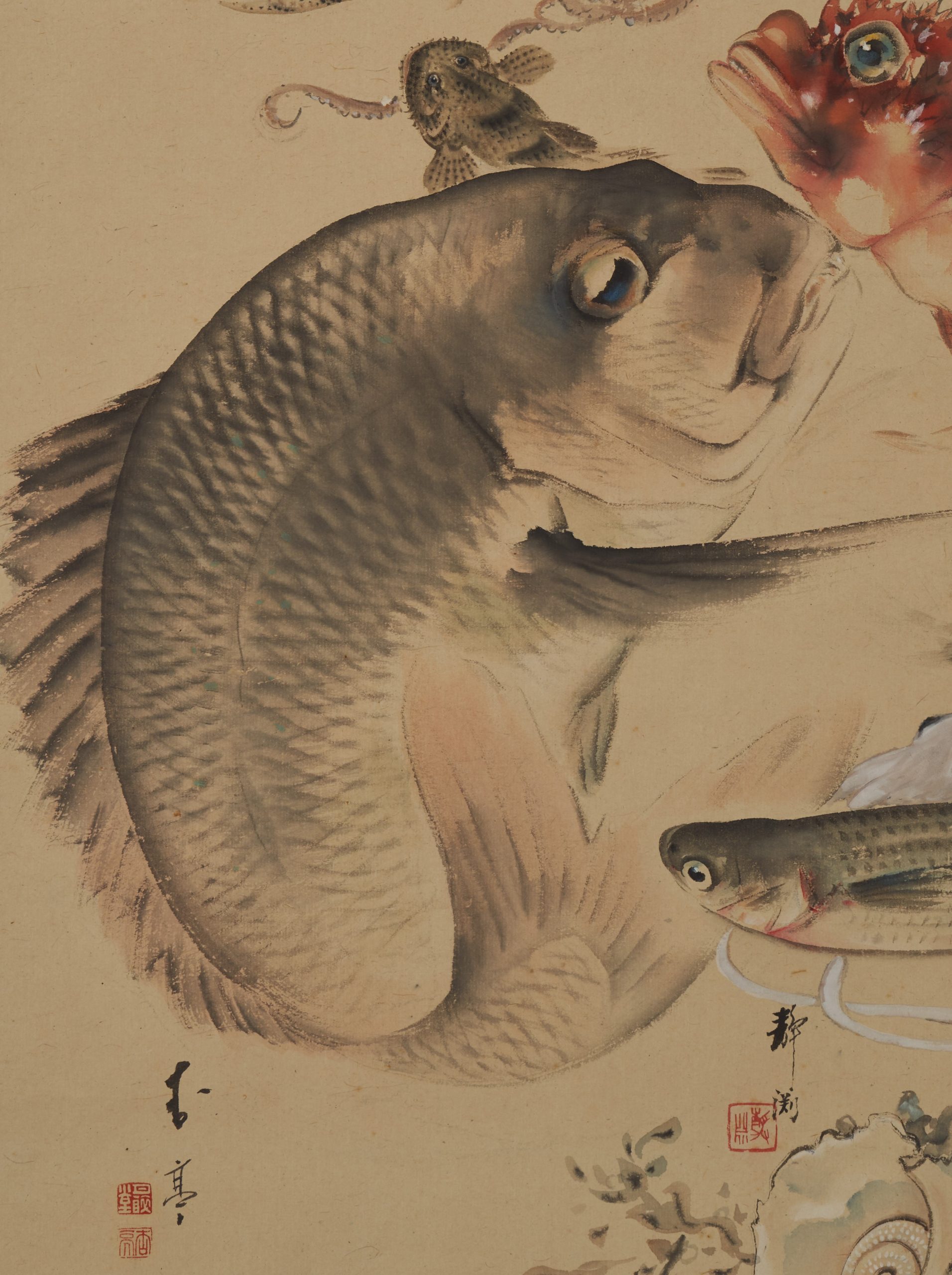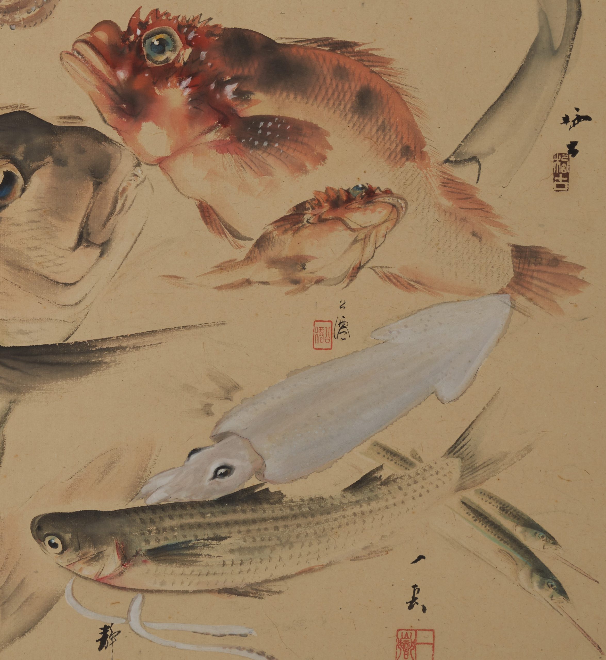 This work is a collaboration by Aoki Seiko and other painters active during the Meiji and Taisho periods. A total of nine painters depicted nine types of fish.