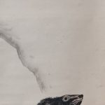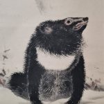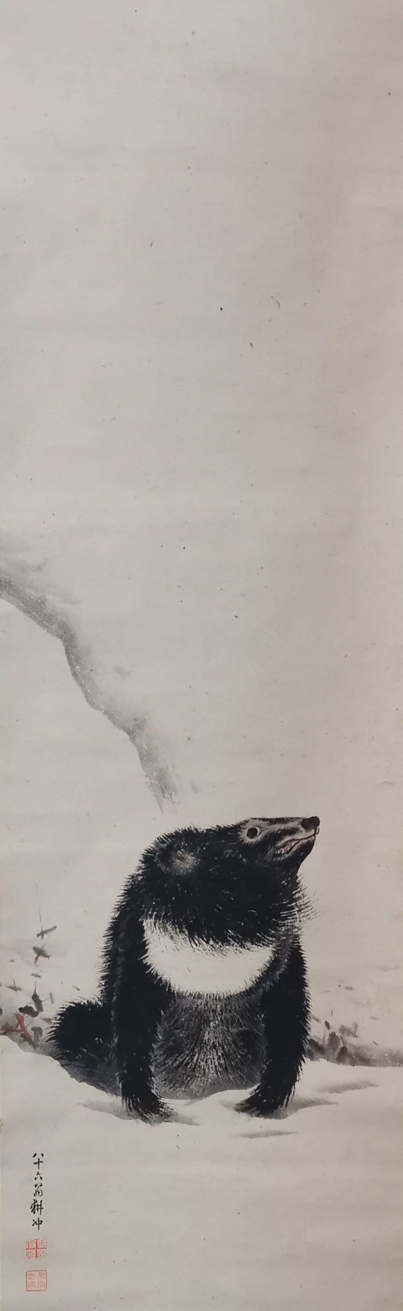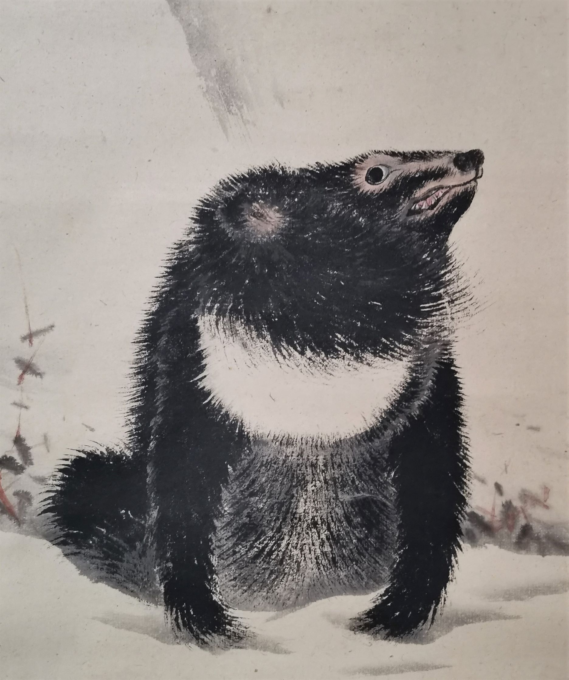 The use of dark, blurred black ink skillfully depicts the hard fur of the bear’s body. The large, glaring eyes, clenched teeth, and bristled body hair suggest that the bear is on the lookout for its surroundings. Kochu beautifully depicts the resilience of a cub surviving in the harsh natural environment.