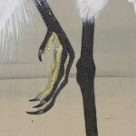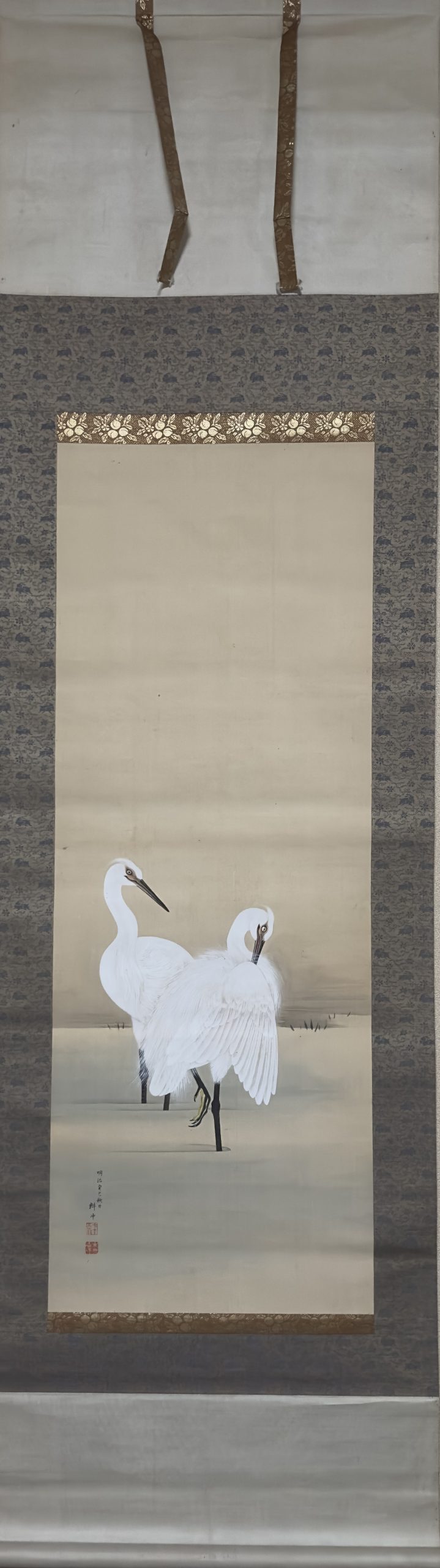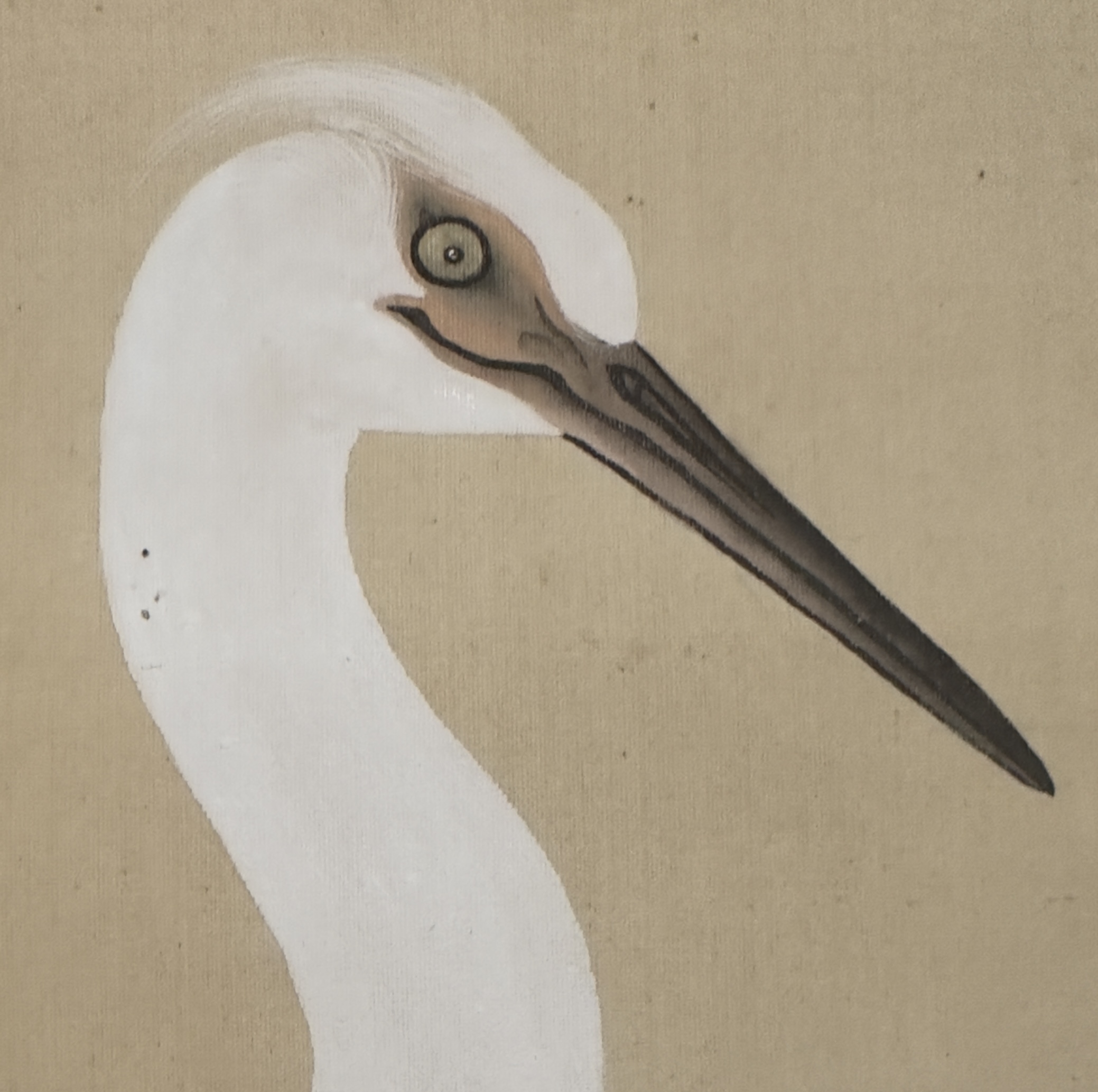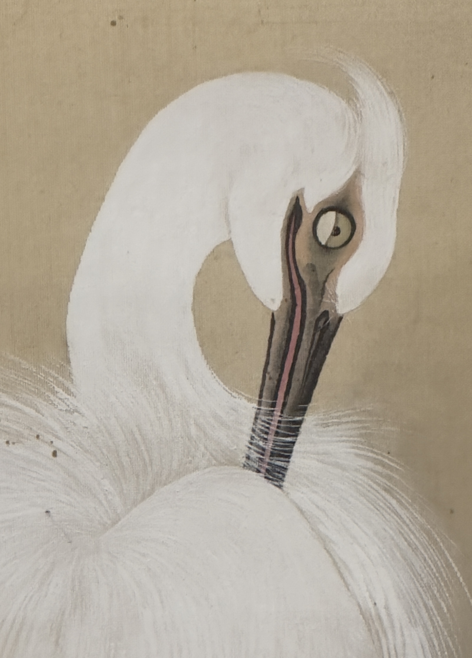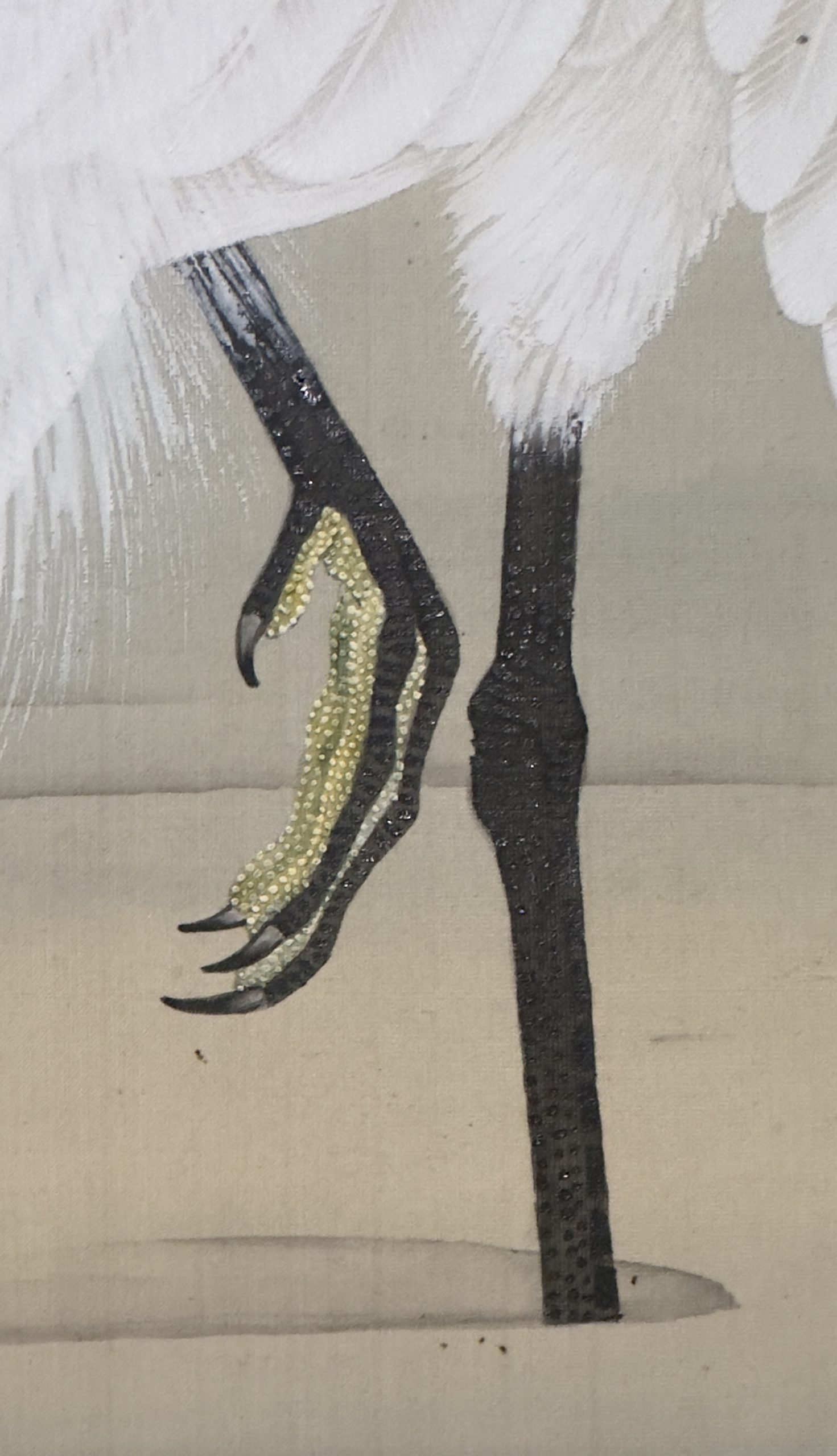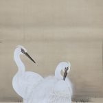 The eyes of the egret on the left, stretching its neck, are painted with white dots and shine brightly. Perhaps it has spotted its prey. The natural gradation of the black ink from the tip of the heron’s beak to the tip of its neck is also beautifully rendered.