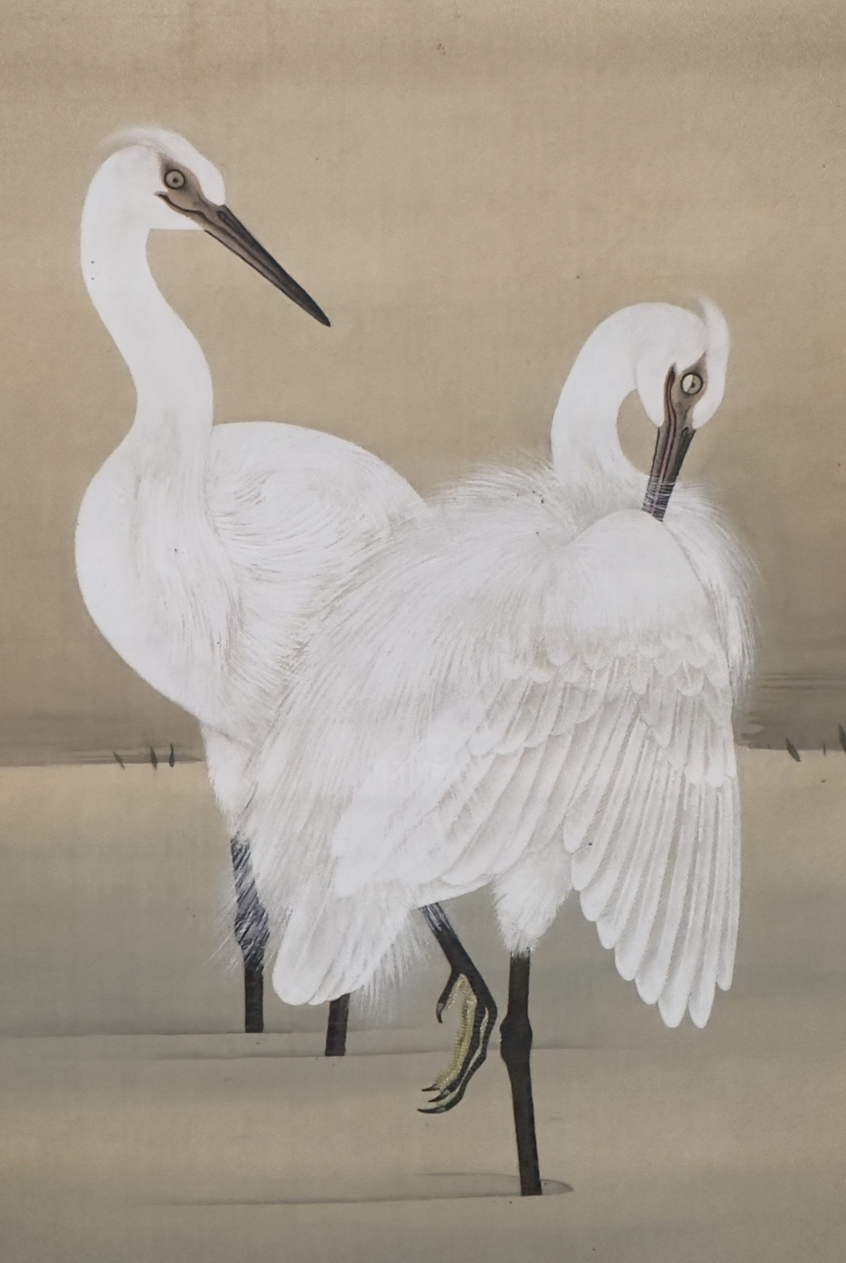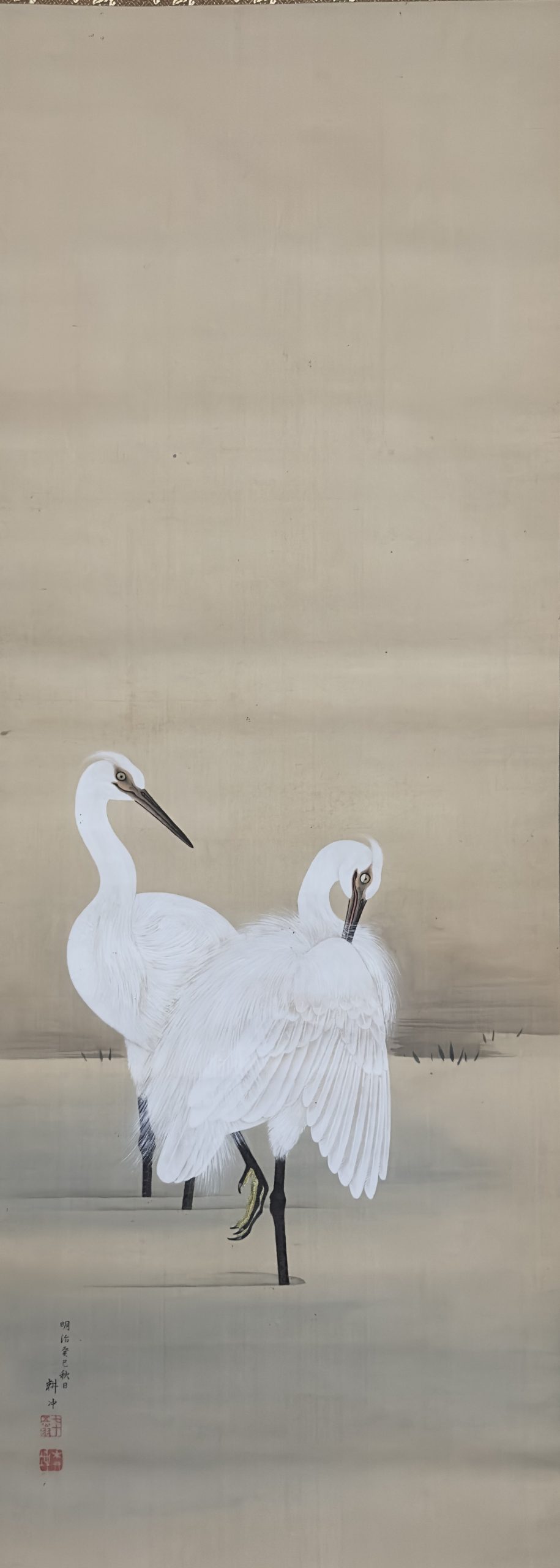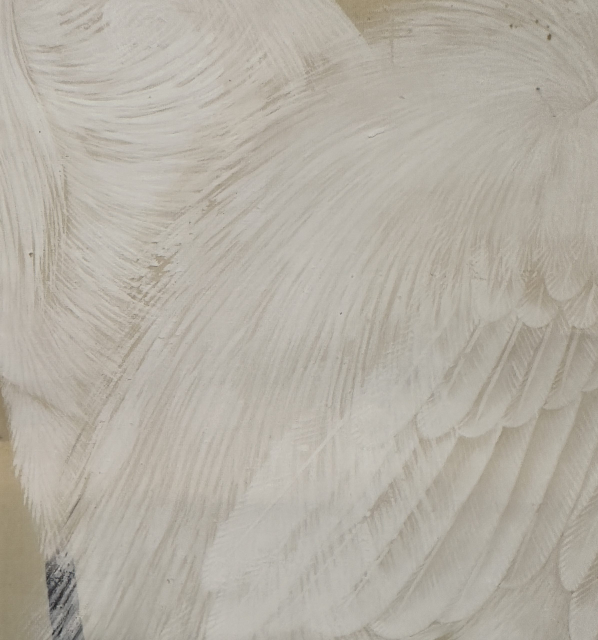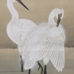The artist’s excellent observation skills can be seen in his depiction of the physical characteristics of the egrets, which are so accurately depicted that they could be mistaken for the real thing.