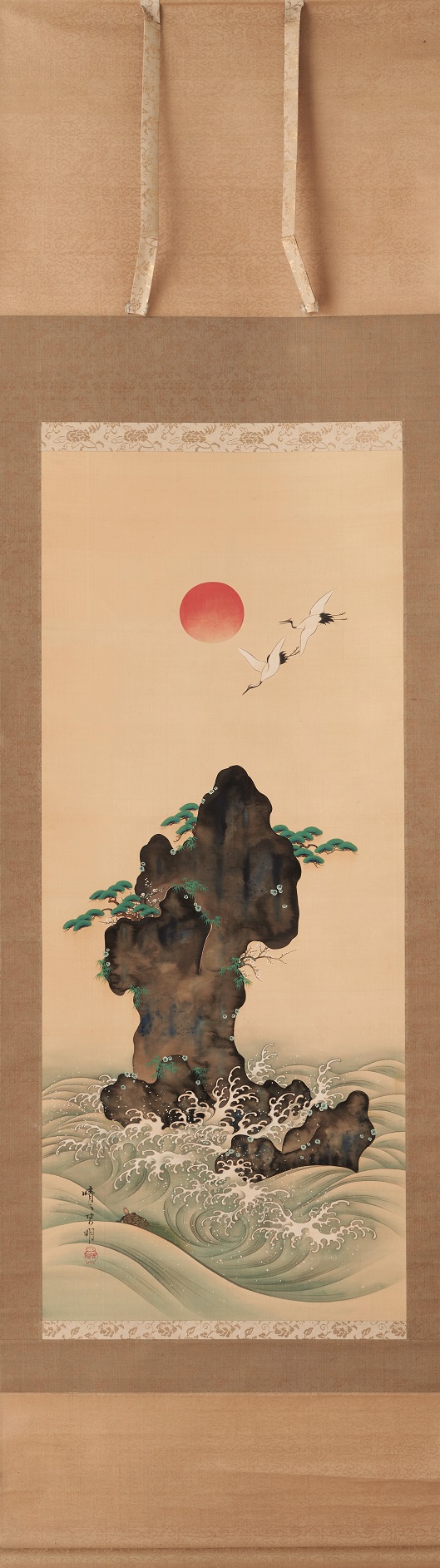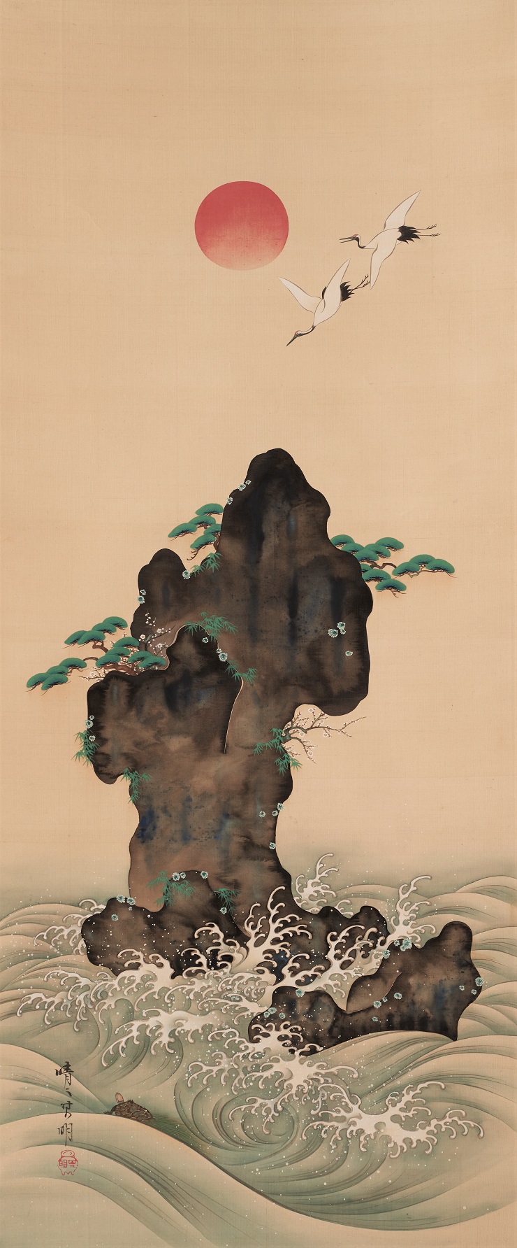 It depicts the rising sun, cranes, Mt.Hourai, and a turtle among the waves. Mt.Hourai is decorated with pine, bamboo, and plum blossoms, creating a festive atmosphere.