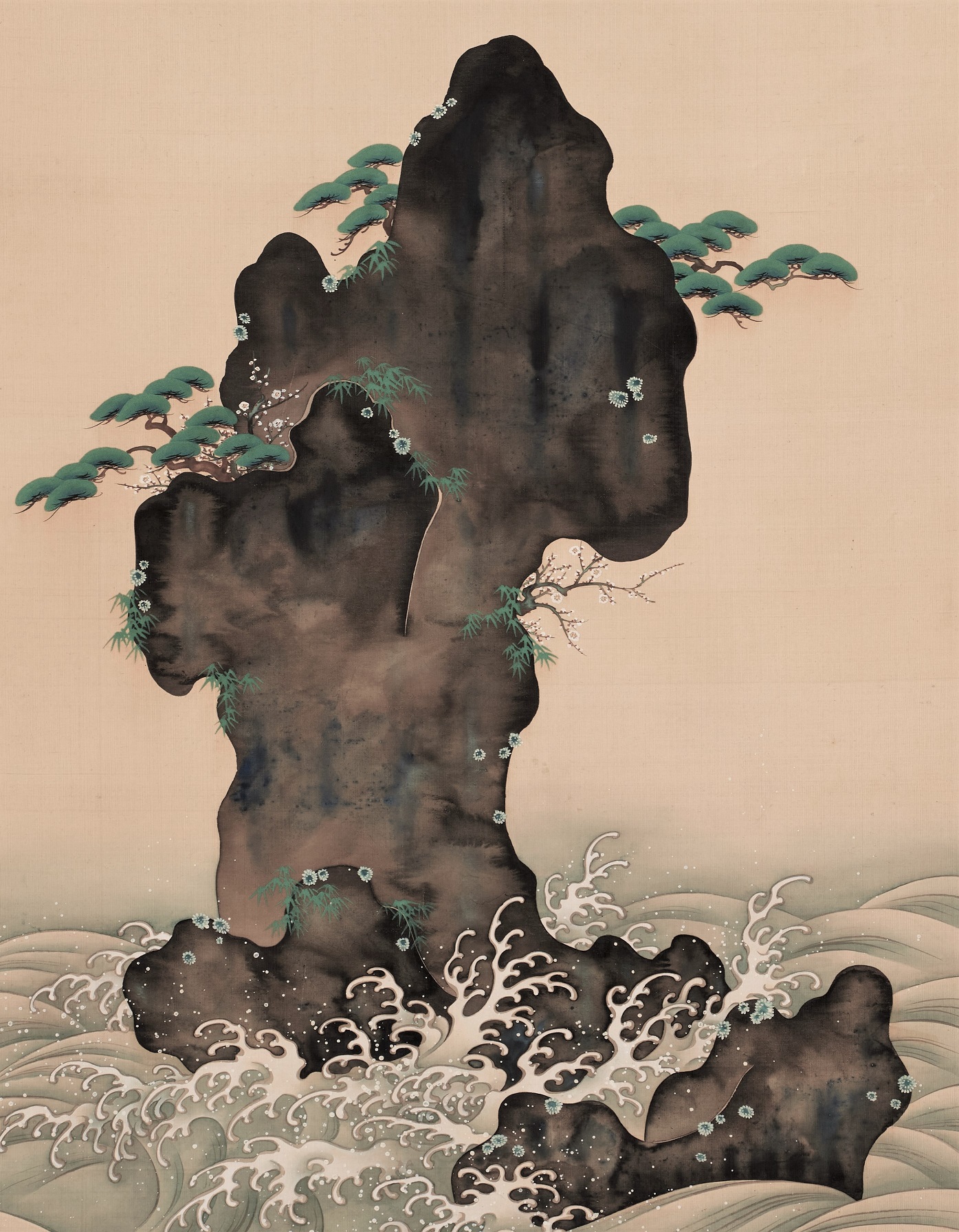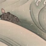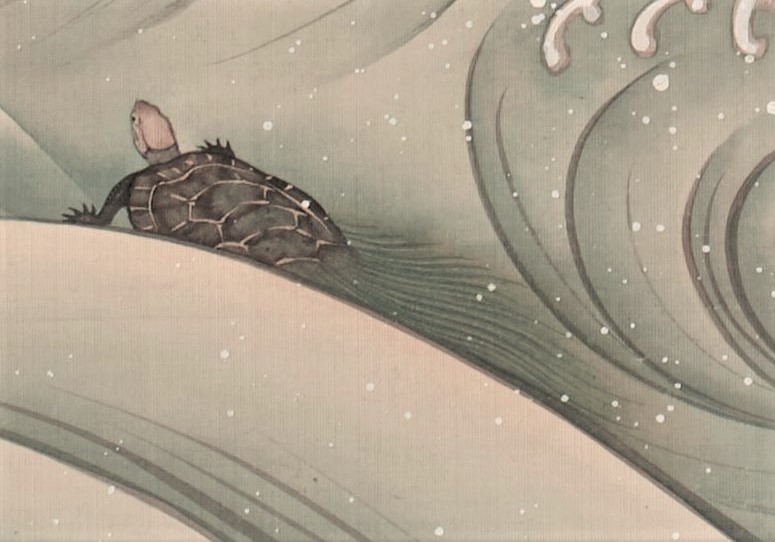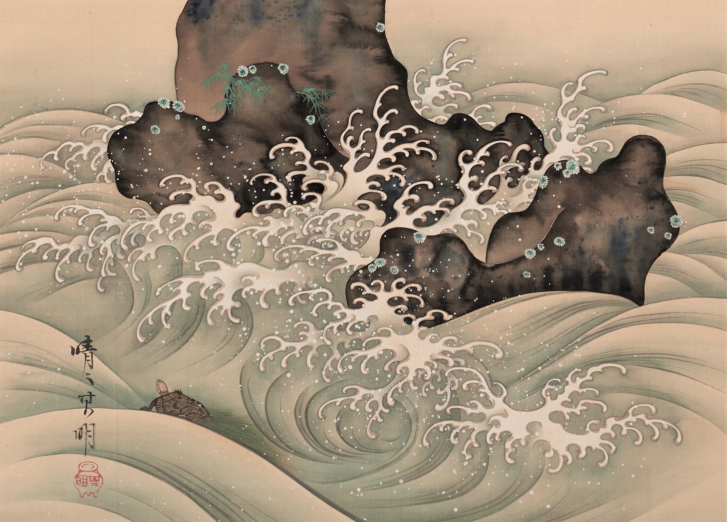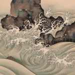 The supple brush strokes and unique use of color show the tradition of the Rimpa school.The wavesand droplets are designed but still moving, showing the artist’s high level of skill.