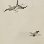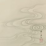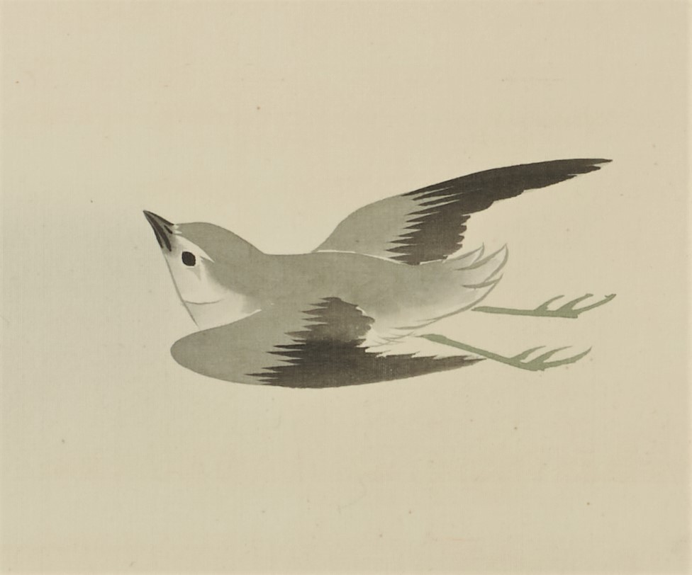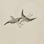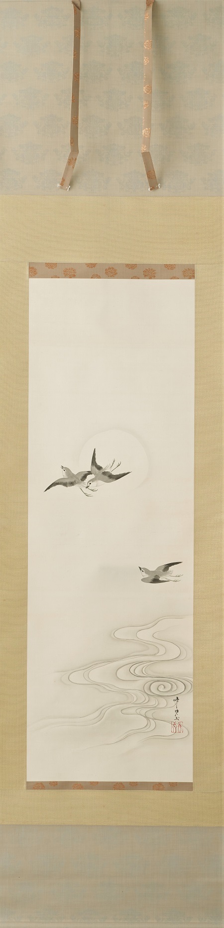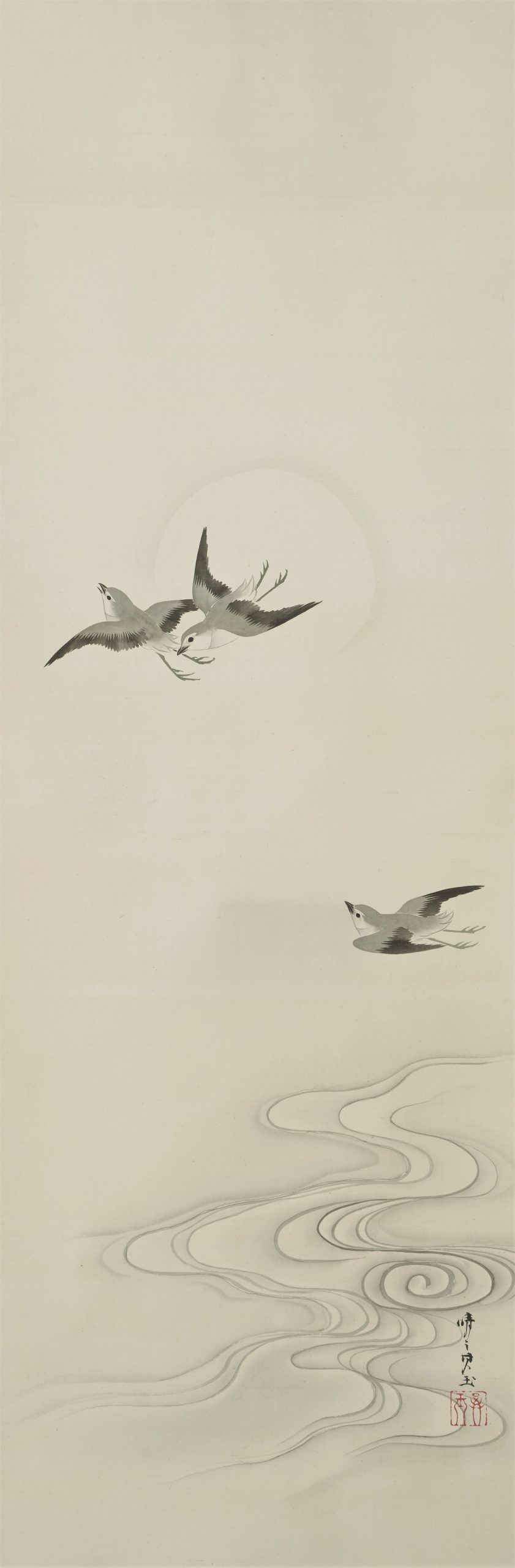This painting depicts plovers playing by the water under a full moon. Although the strokes of the plover are calm, they give the impression of dynamic flight in the sky. The expression of the water currents illuminated by the moonlight is also eye-catching. In order to represent the white reflection of the water current, a very delicate gradation is applied to the ink color.