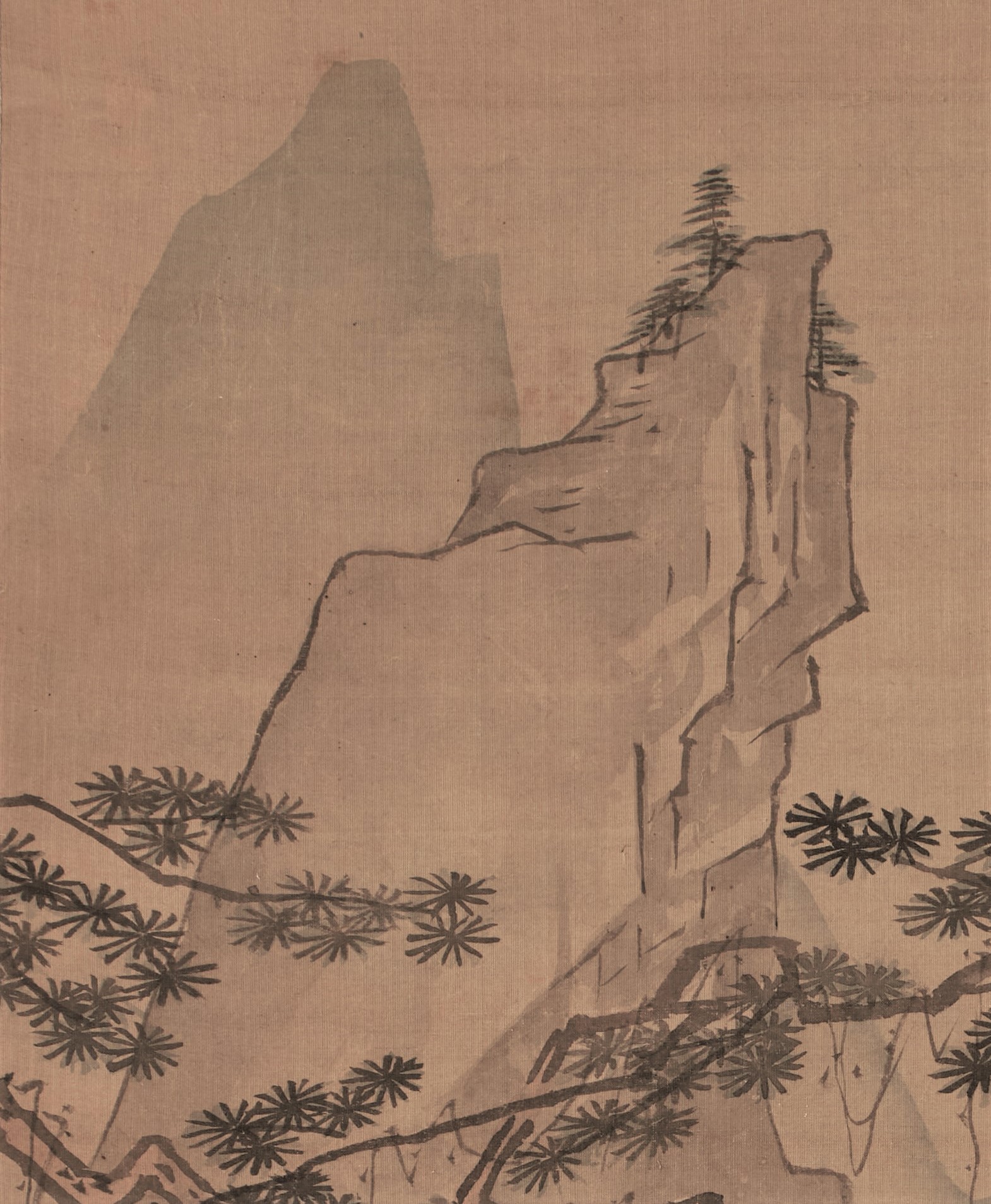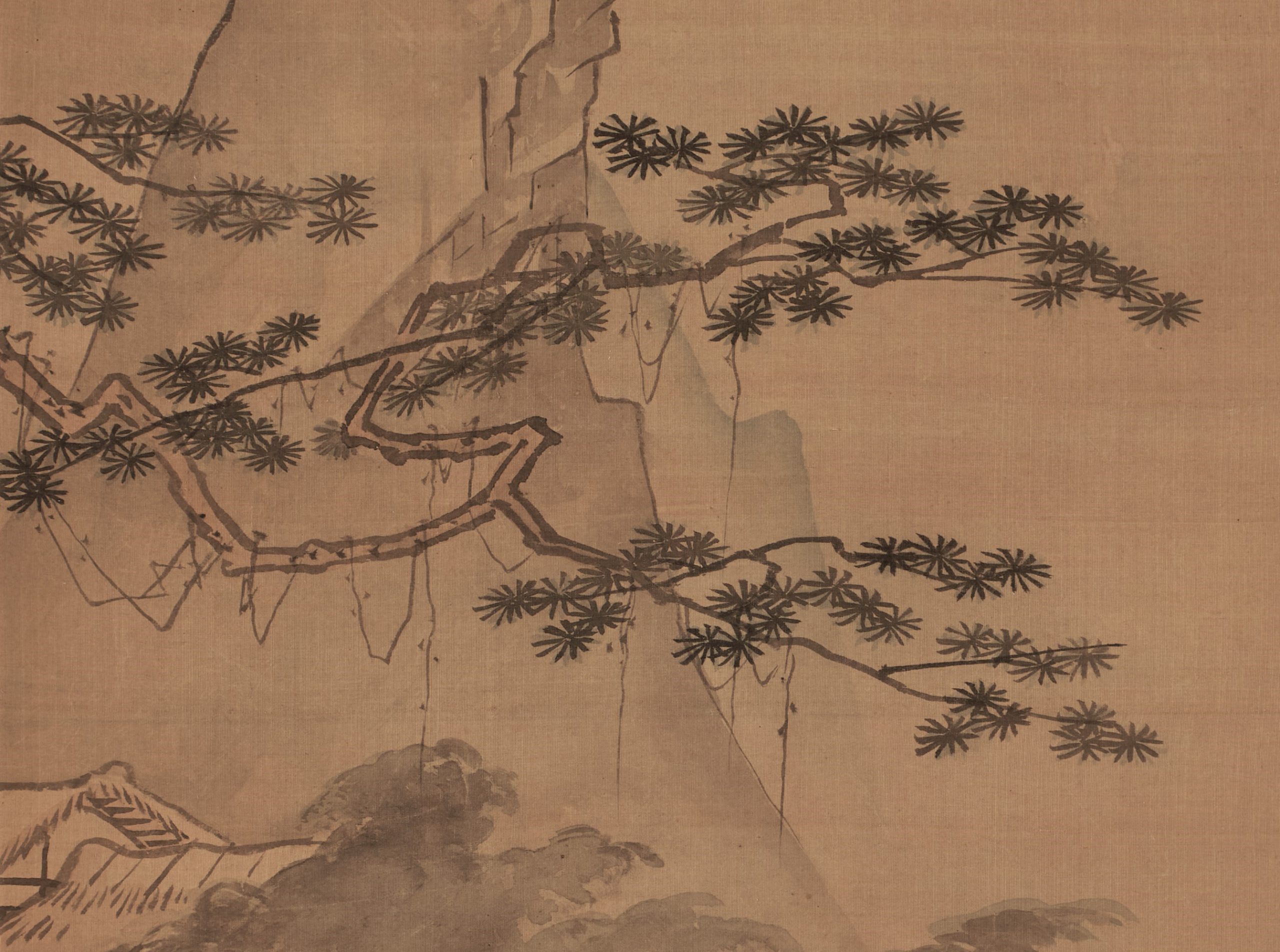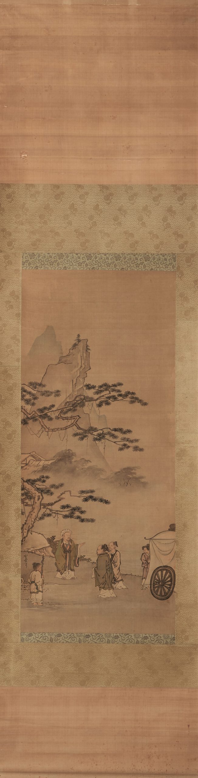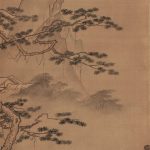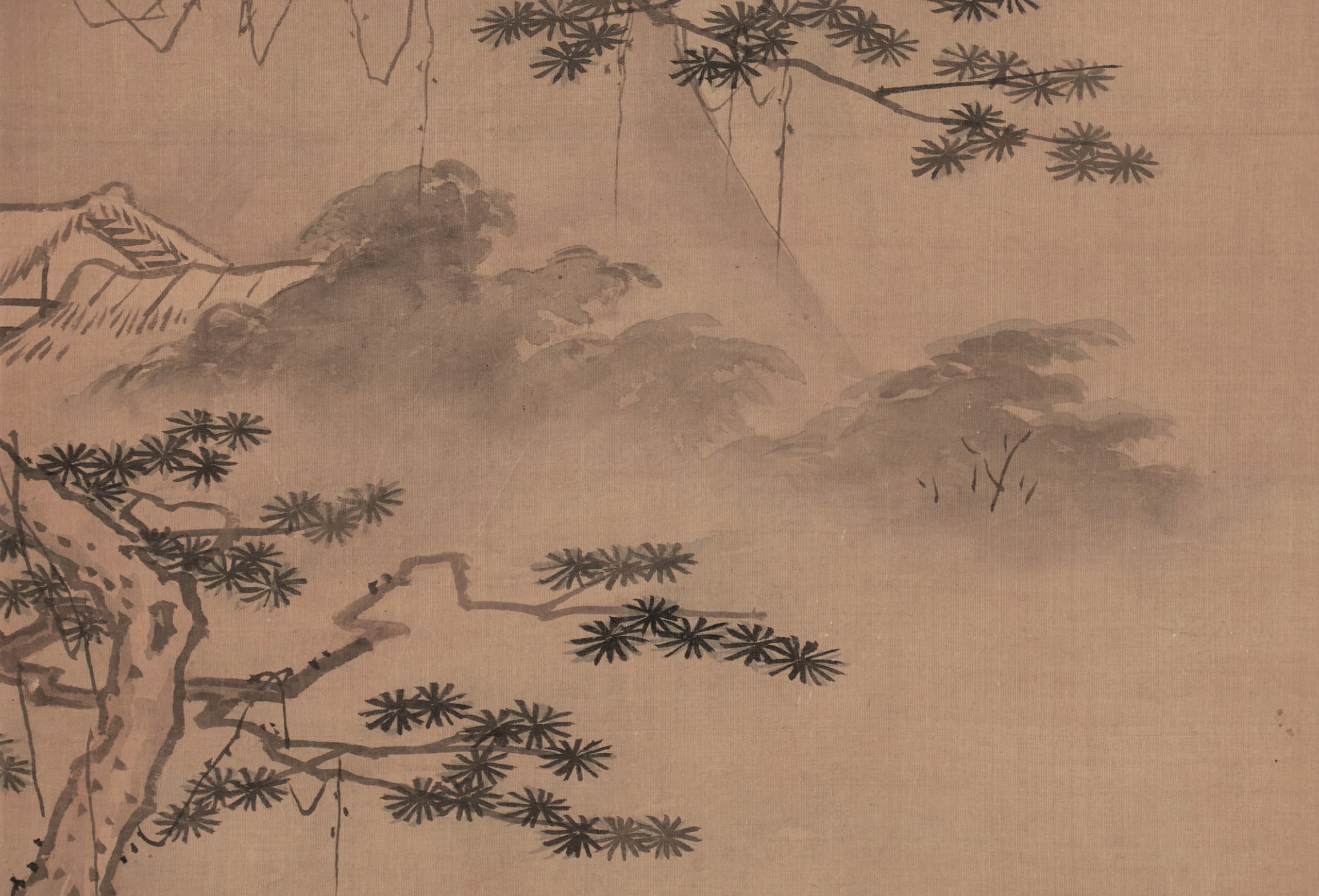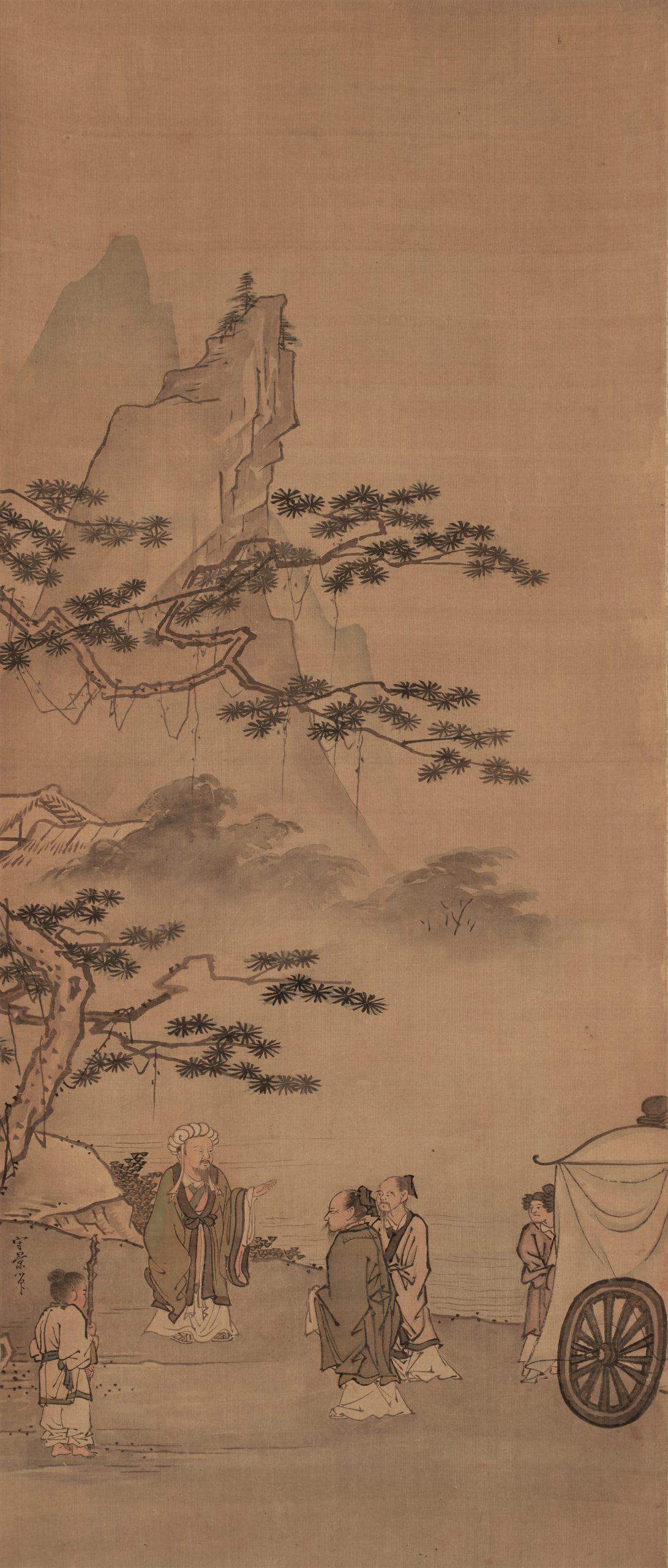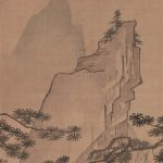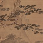 The faces of the figures are rendered with light brush strokes, each part of which shows Morikage’s distinctive features. The painting develops from the pine tree in the foreground to the figures, the house in the background, and the steep mountain in the distance, skillfully expressing the depth of space.
