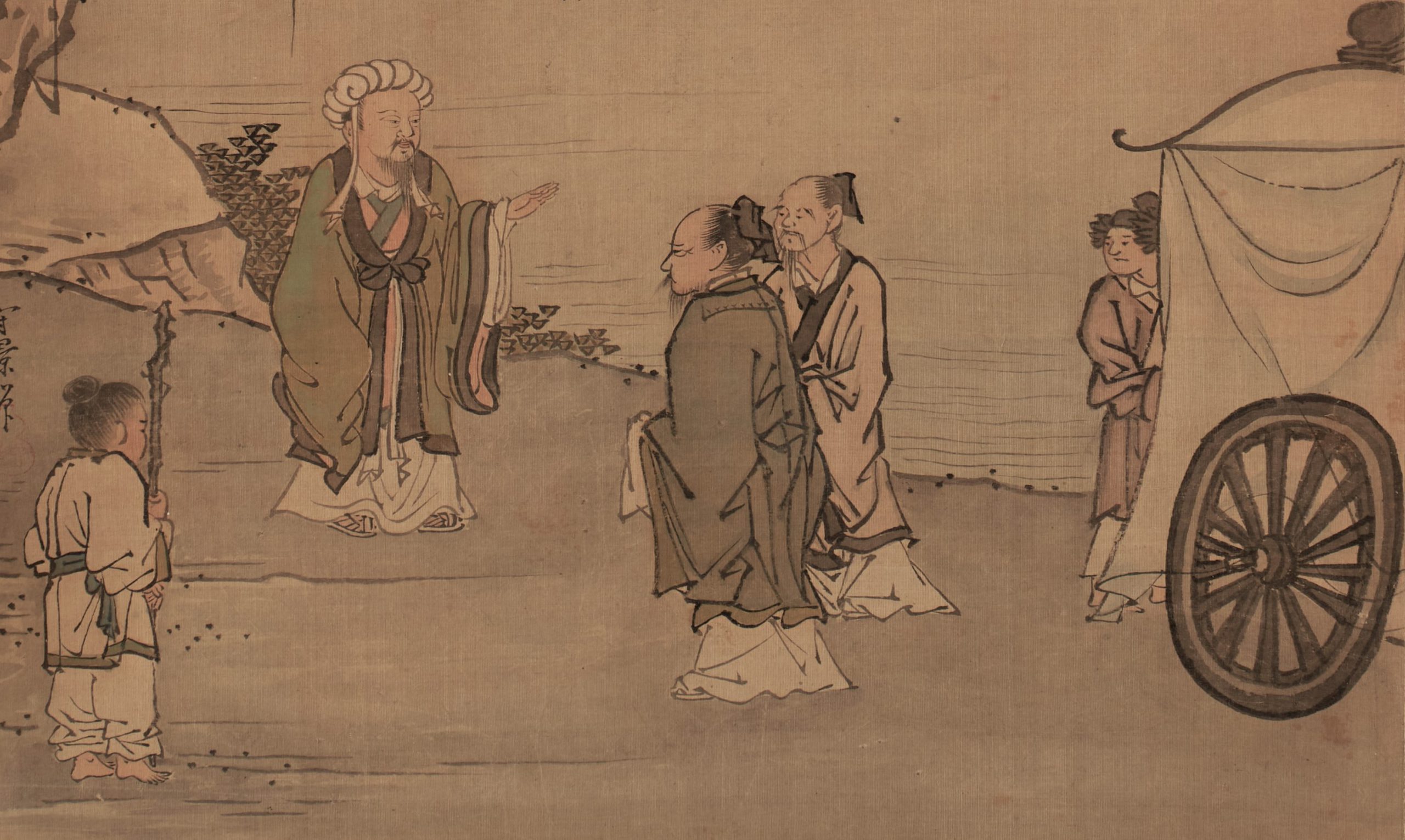 The man on the left of the center of the screen, facing us and raising his left hand, is Zhuge Liang Kongming. Kongming is facing the two men, but it is not clear what this scene represents.