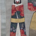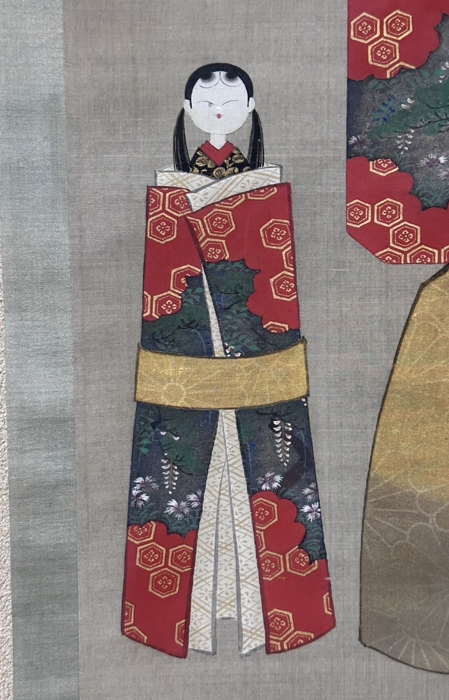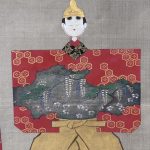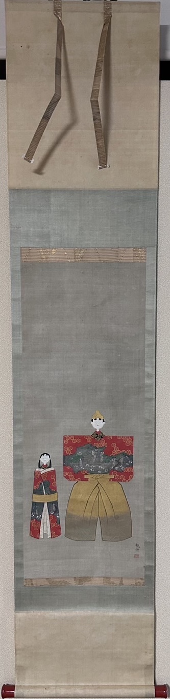 This painting depicts a form of hina-doll known as “tatchibina”. The abstract form of these dolls originated from the paper dolls called “hitogata” that were washed out to the sea or rivers to bring bad luck, and are considered to be the most ancient of all hina-dolls.