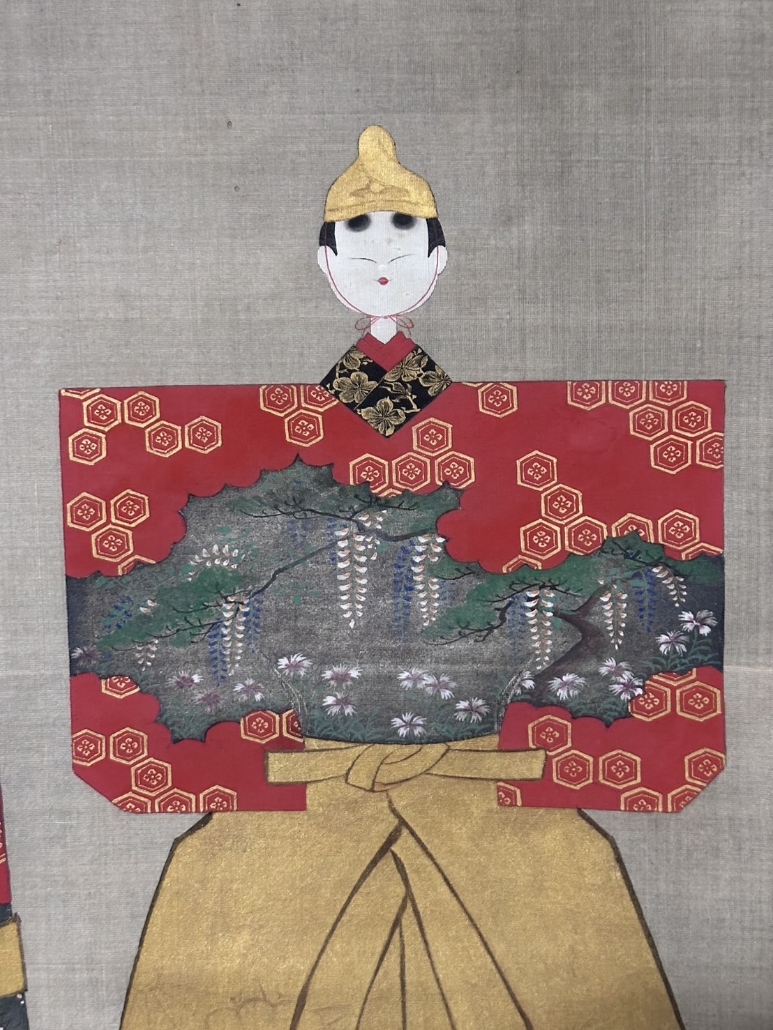 Both the female and male dolls have round faces with round, taut features, simple eyes with inked lines, small noses, and small mouths. The bright red kimono is decorated with wisteria and nadeshiko flowers, adding a touch of loveliness amidst the glitter.