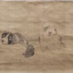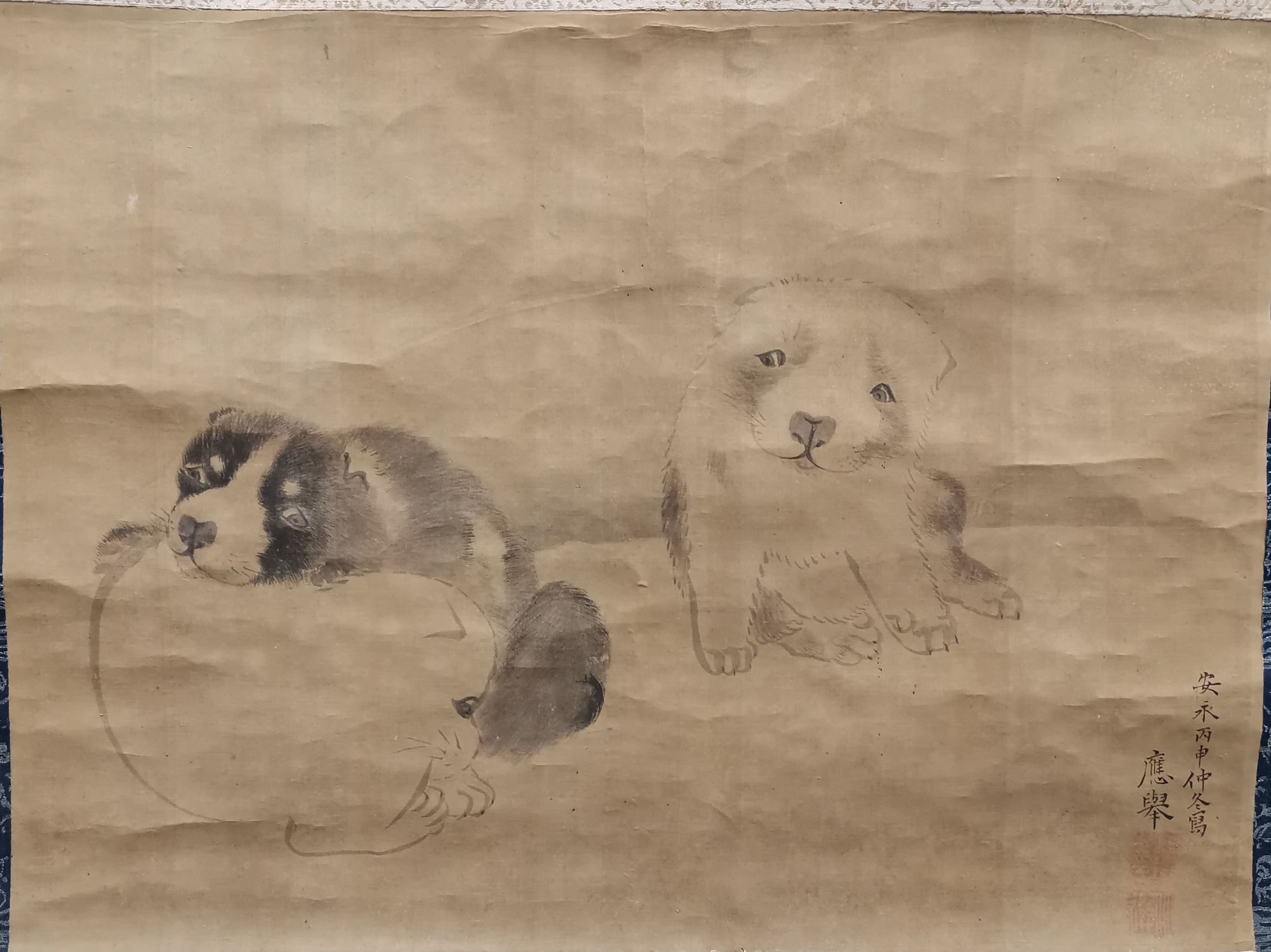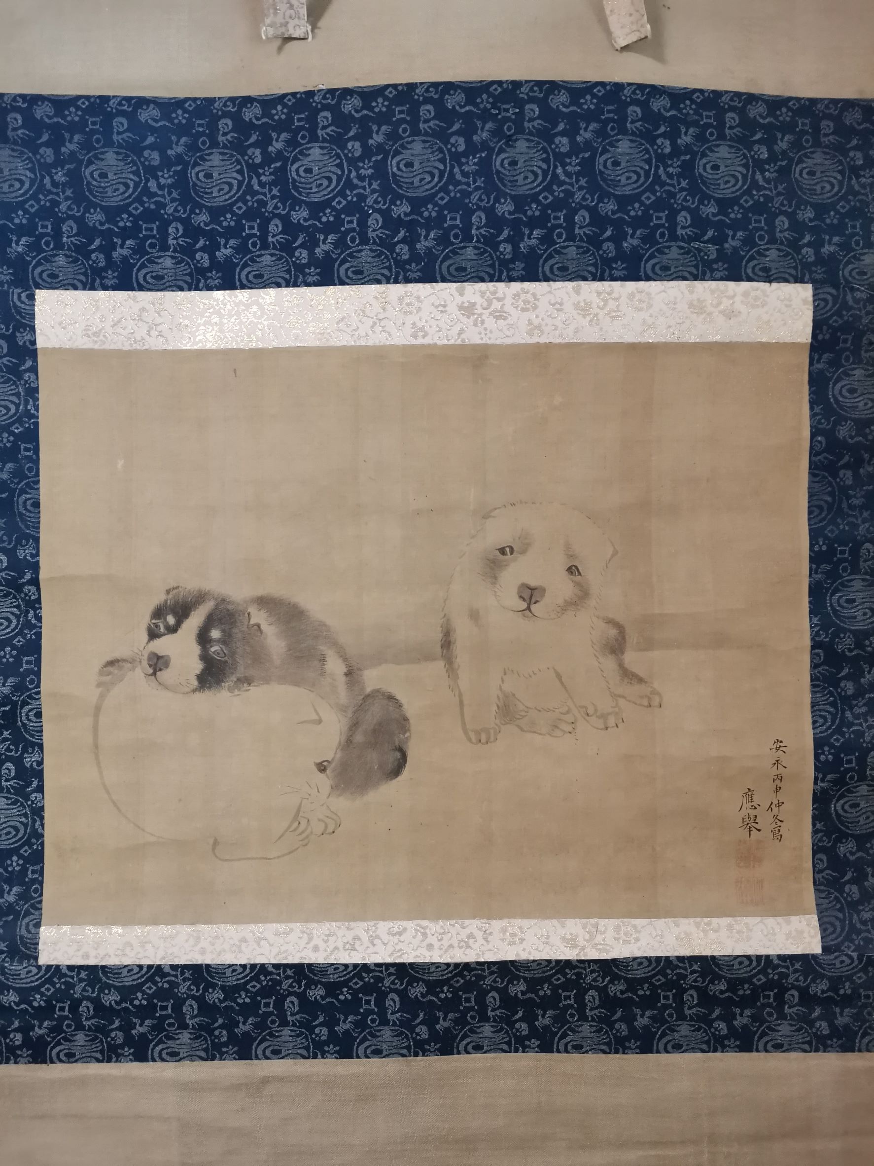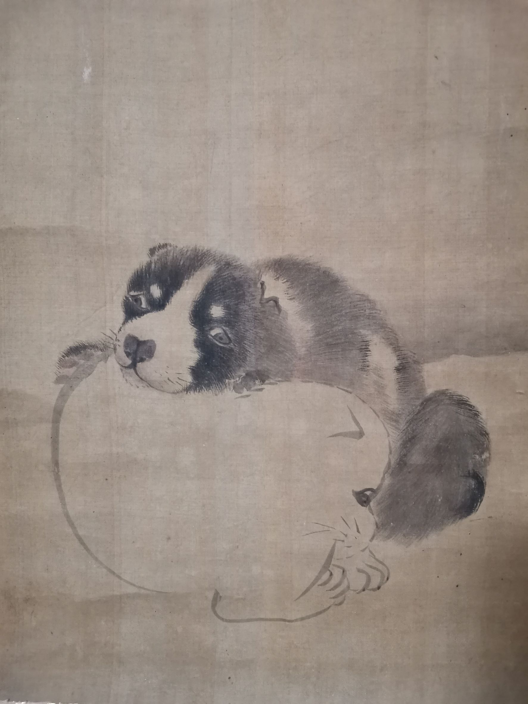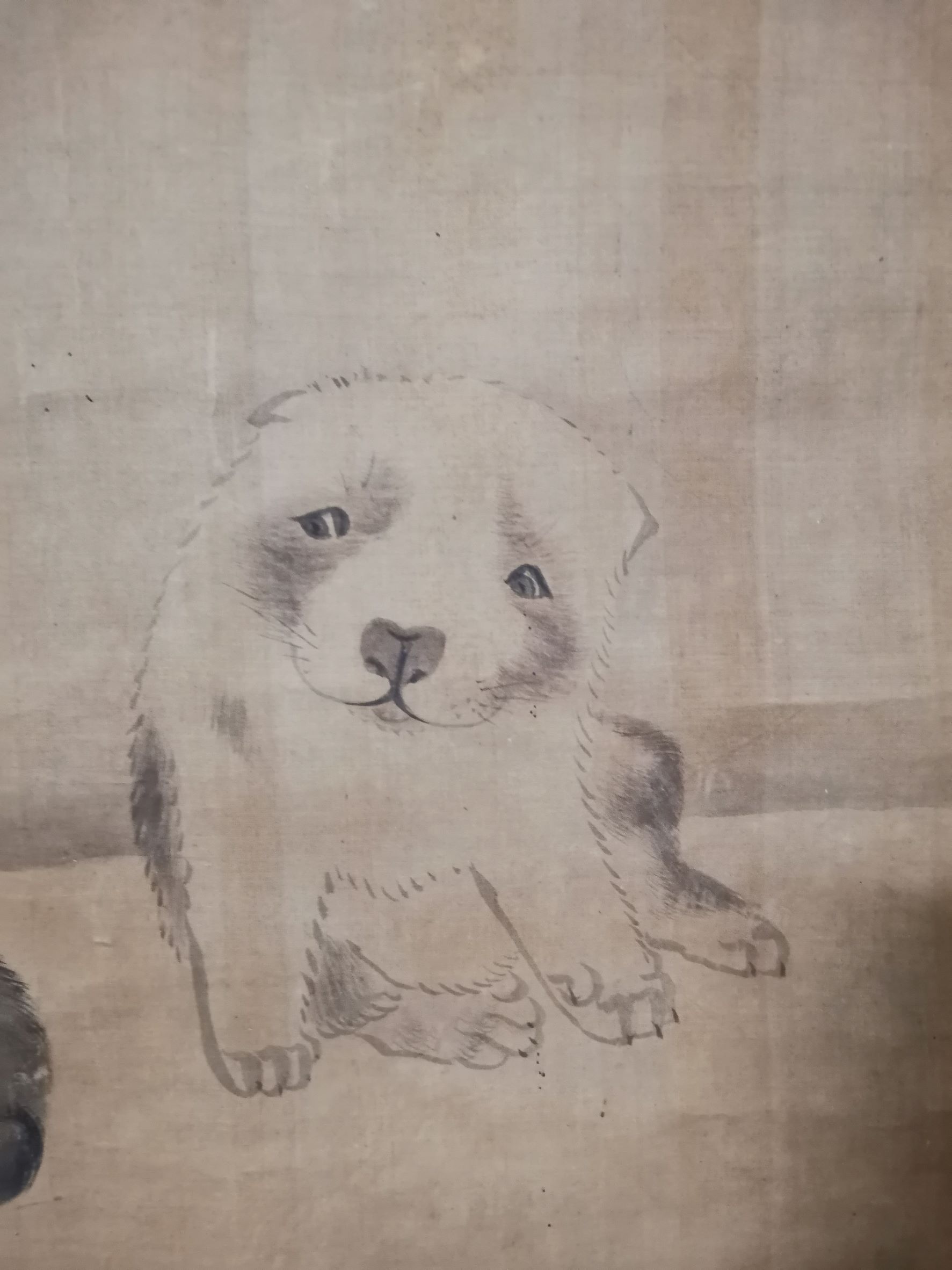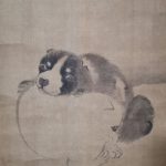 The white of the puppy’s eyes is a characteristic feature of Okyo’s paintings, which expresses the direction of the puppy’s gaze and a variety of emotions.The puppy on the right gazes enviously at two neighboring puppies.