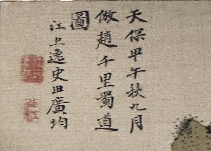 Shu zhandao is a steep mountain road connecting Sichuan and Shaanxi provinces in China. It has been known as a difficult place in China since ancient times, and is also a motif that has been painted as a traditional painting subject. In Japan, however, literati painters painted many pictures of the Shu zhandao as a blue-green landscapes that included a longing for China. The inscription on the painting indicates that it is a reproduction of a painting by Zhao Chli-li, a painter of the Sung dynasty.