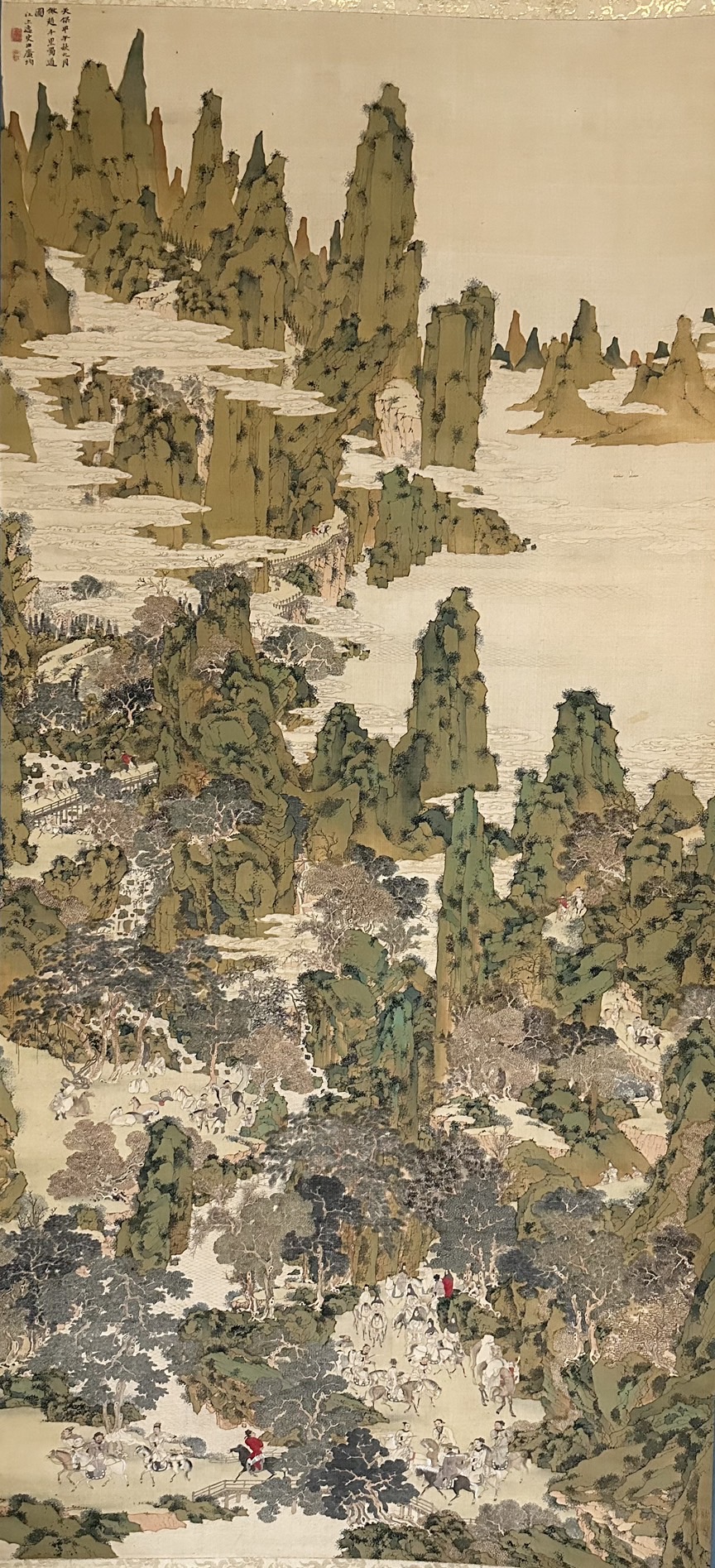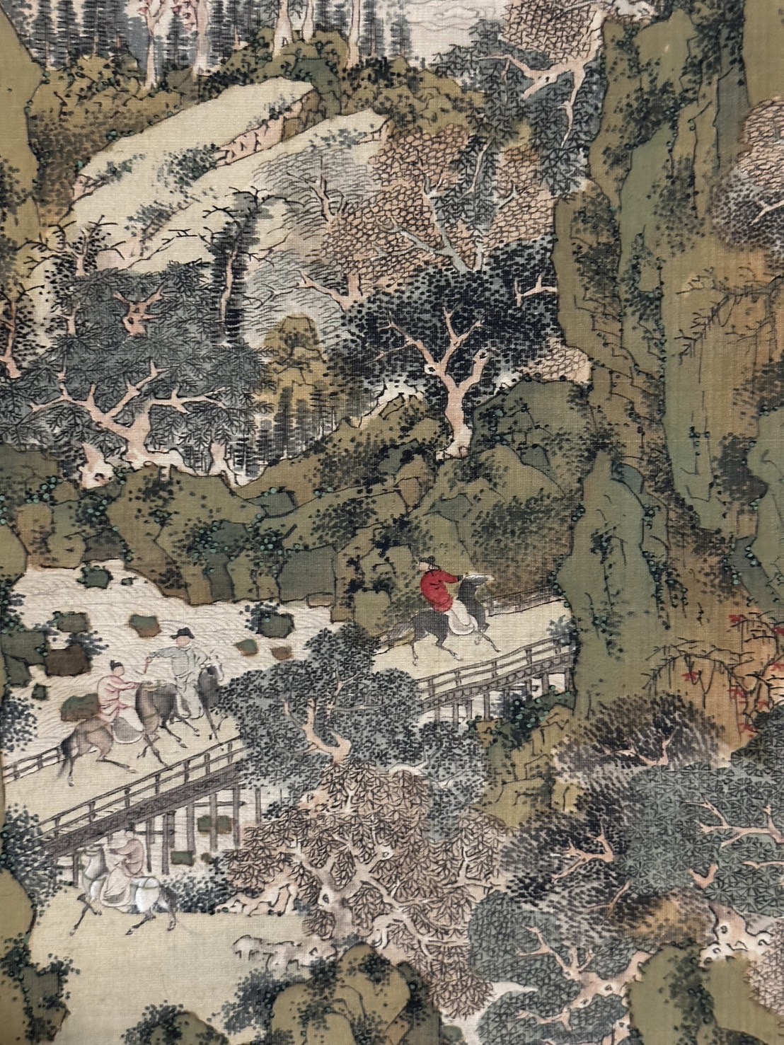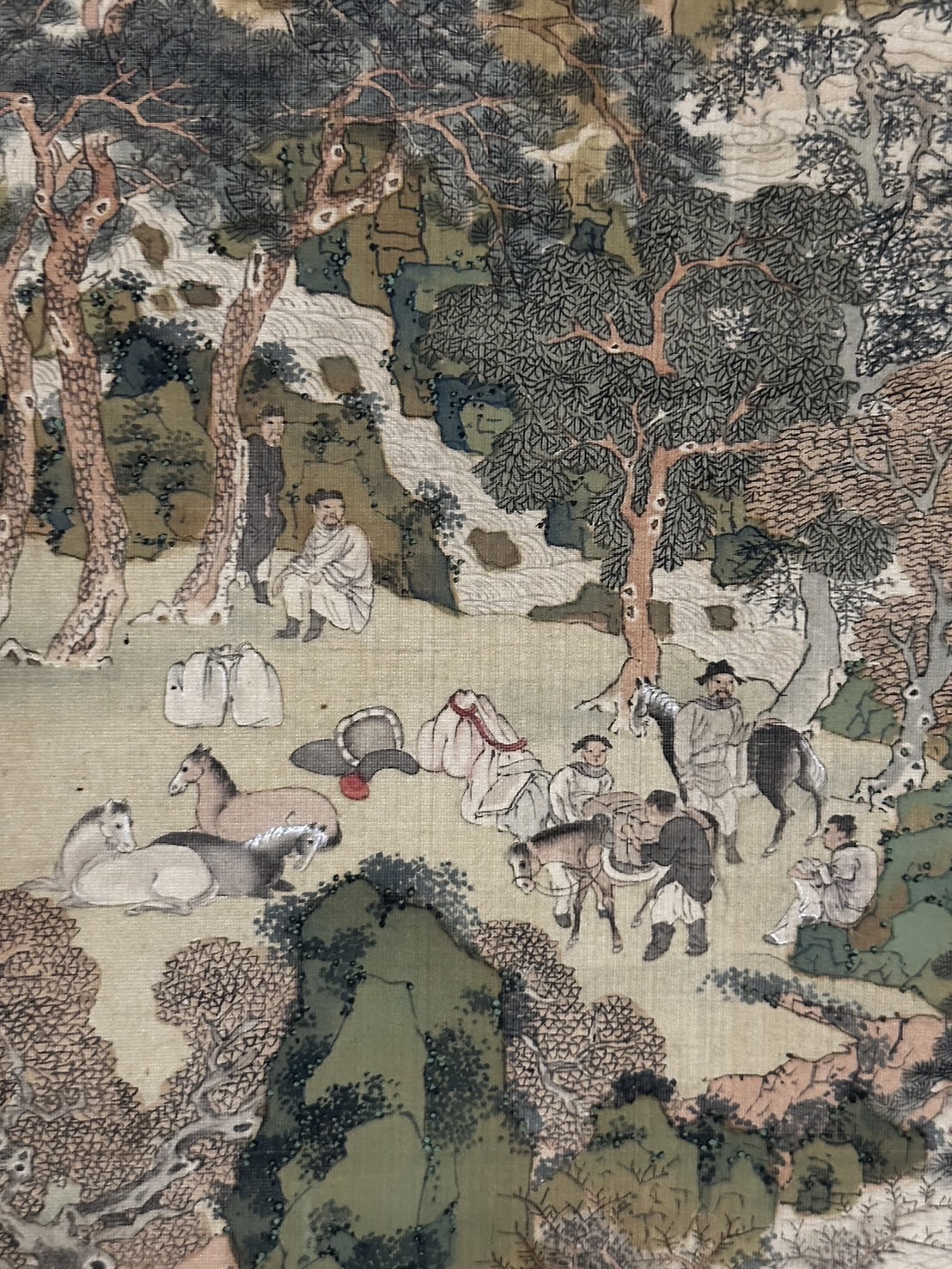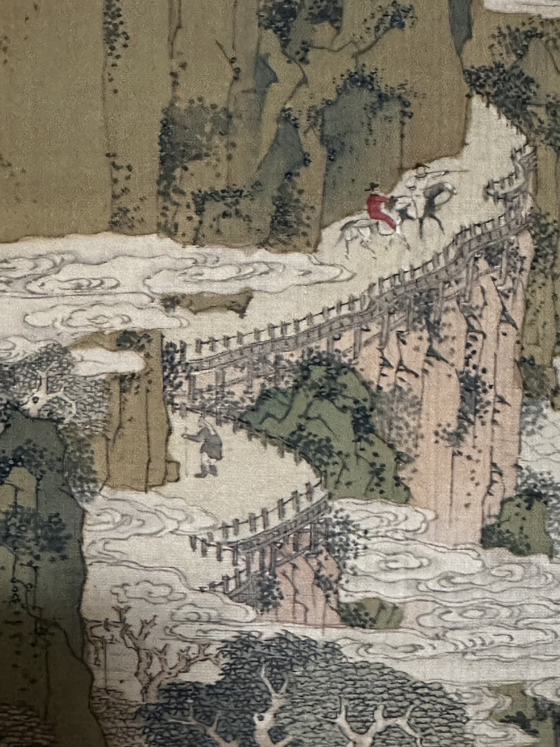 A winding plank road weaves its way through the dynamic composition of forested mountains. From the mountainside to the foot of the mountains, people and horses are depicted in various places. A group of people unloading their belongings and taking a rest, and another group of people arriving at the foot of the mountain in formation…… The contrast between the magnificent nature and the small human beings is magnificent. The artist’s delicate work is evident in the careful depiction of each person and each branch and leaf.