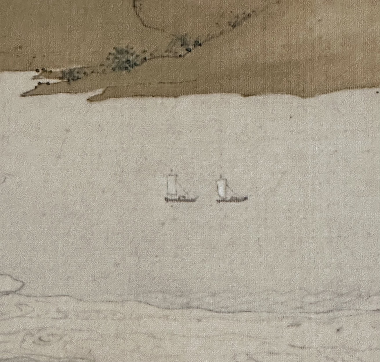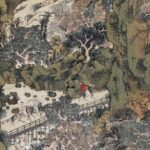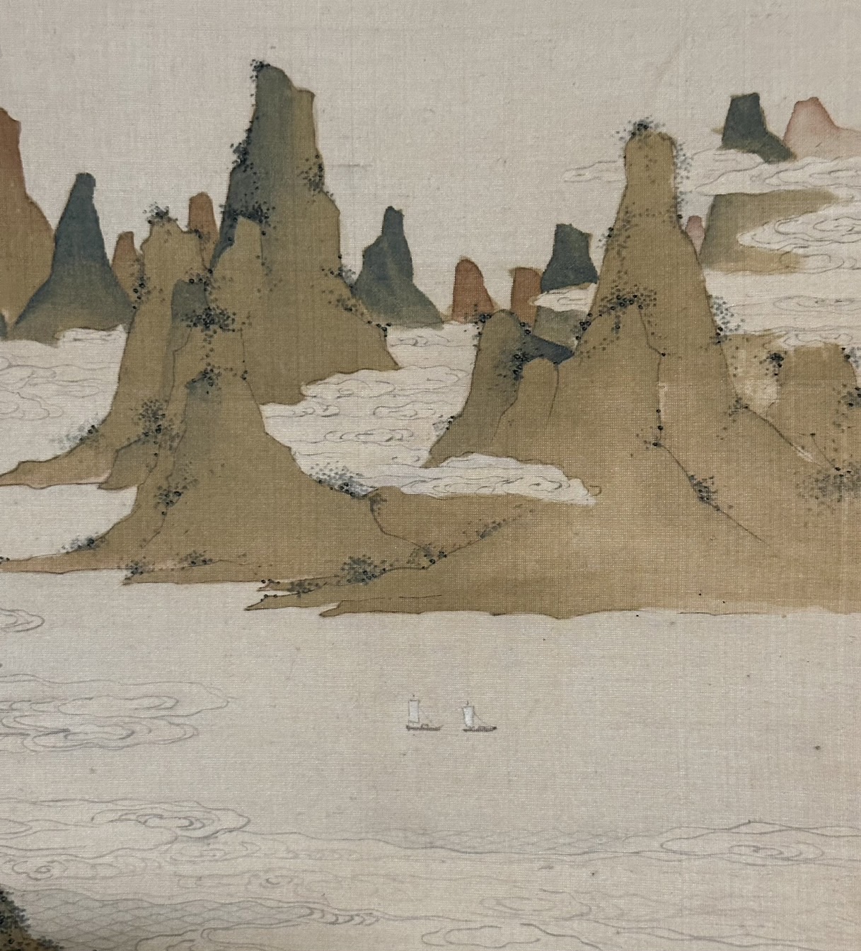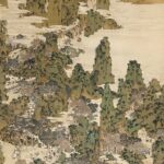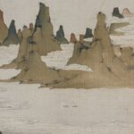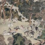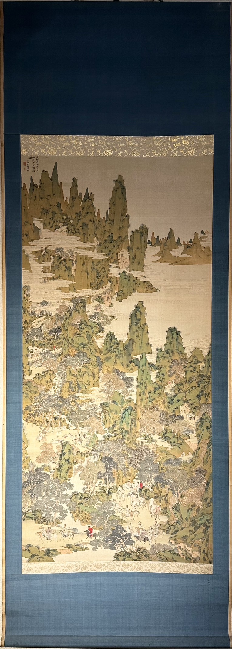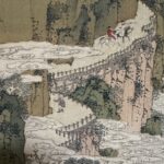 A winding plank road weaves its way through the dynamic composition of forested mountains. From the mountainside to the foot of the mountains, people and horses are depicted in various places. A group of people unloading their belongings and taking a rest, and another group of people arriving at the foot of the mountain in formation…… The contrast between the magnificent nature and the small human beings is magnificent. The artist’s delicate work is evident in the careful depiction of each person and each branch and leaf.