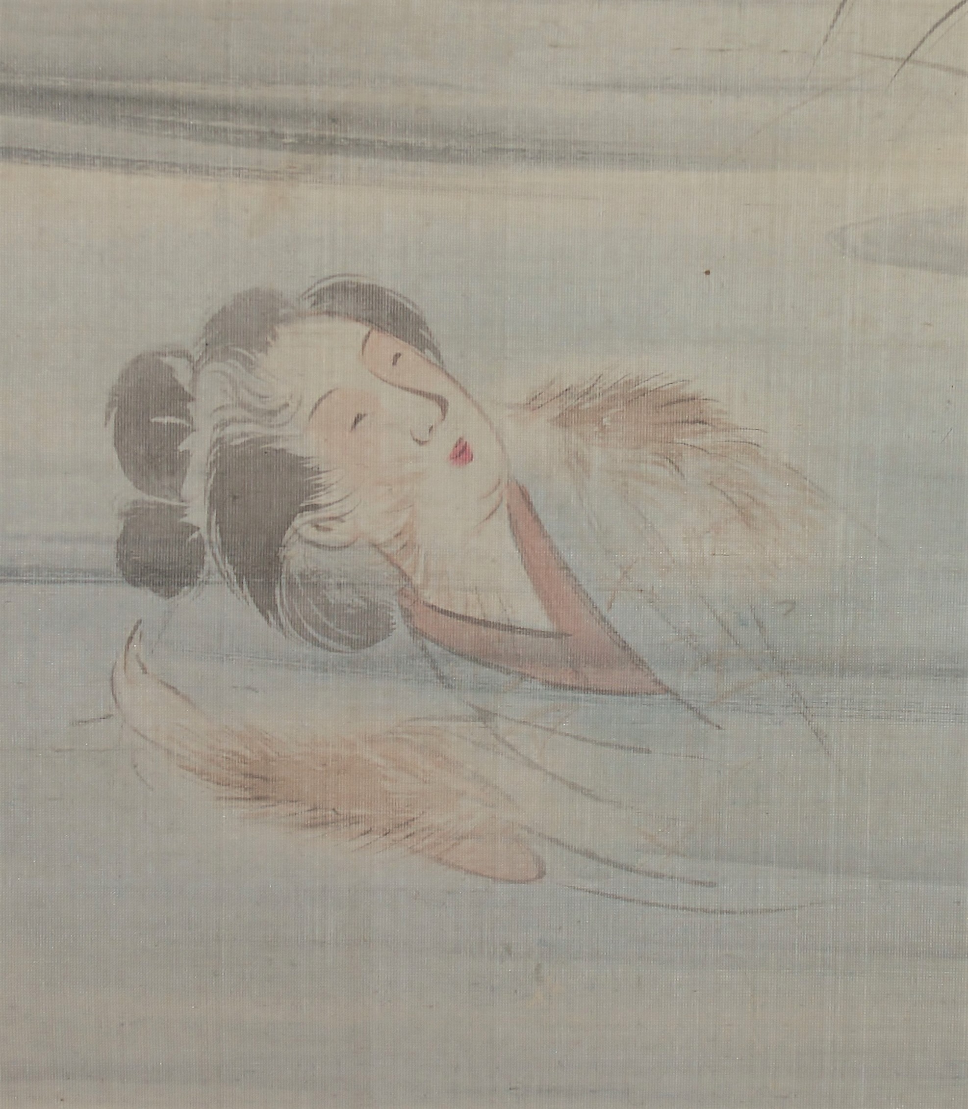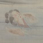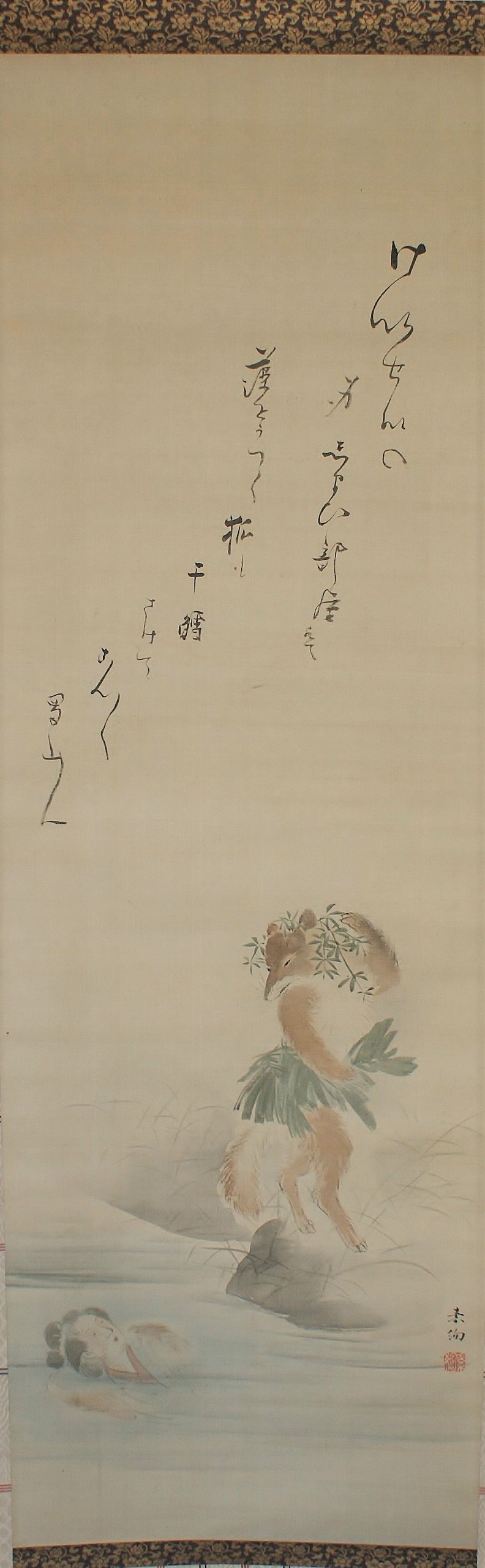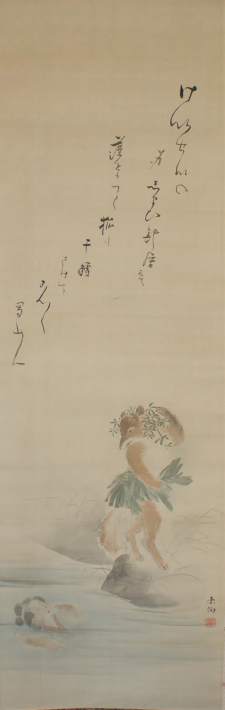 The overall brushwork is rough and light, but the light coloring of the fox’s hair and the woman’s skin is exquisite. The inscription on the inscription reads, “けいせいの身しまひ部屋は藻をかつく狐も干鱈さけてこんこん 蜀山人(Keisei no mishimahibeya ha mo wo katsuku Kitsune mo hoshidara sakete konkon Shokusanjin)”.