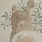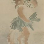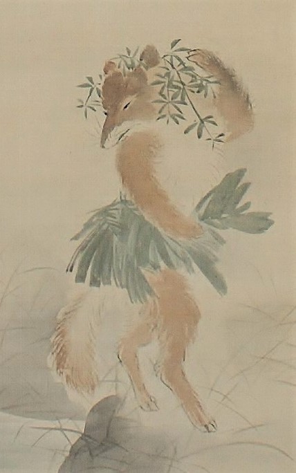 A fox poses and peers into the water, using leaves as kimonos and hair ornaments. It is as if to say, “Am I beautiful? The reflection on the surface of the water is of a beautiful young woman, but if you look closely, you can see brown hair growing out of her face, shoulders, and arms. It is a playful work that makes you chuckle.