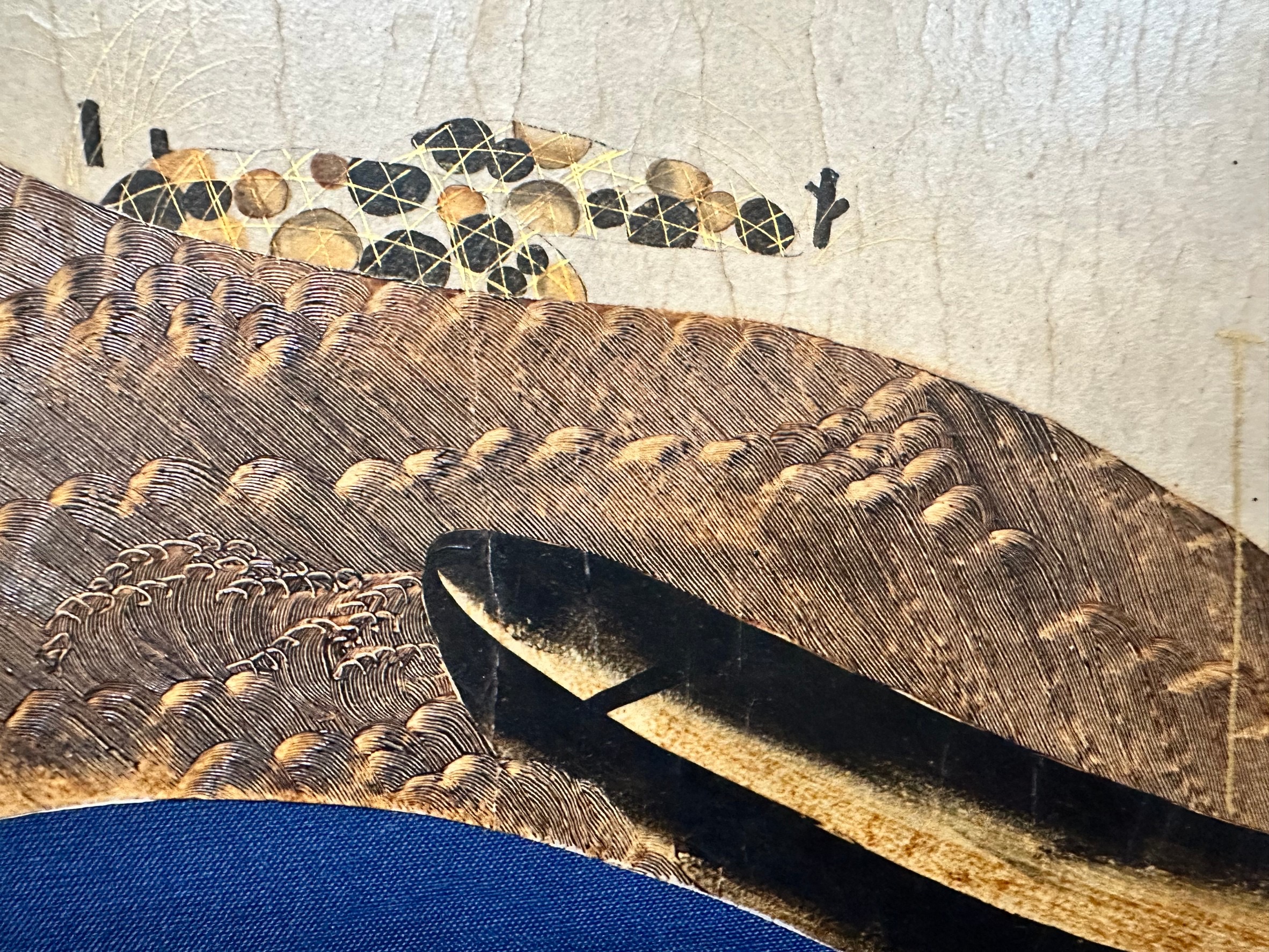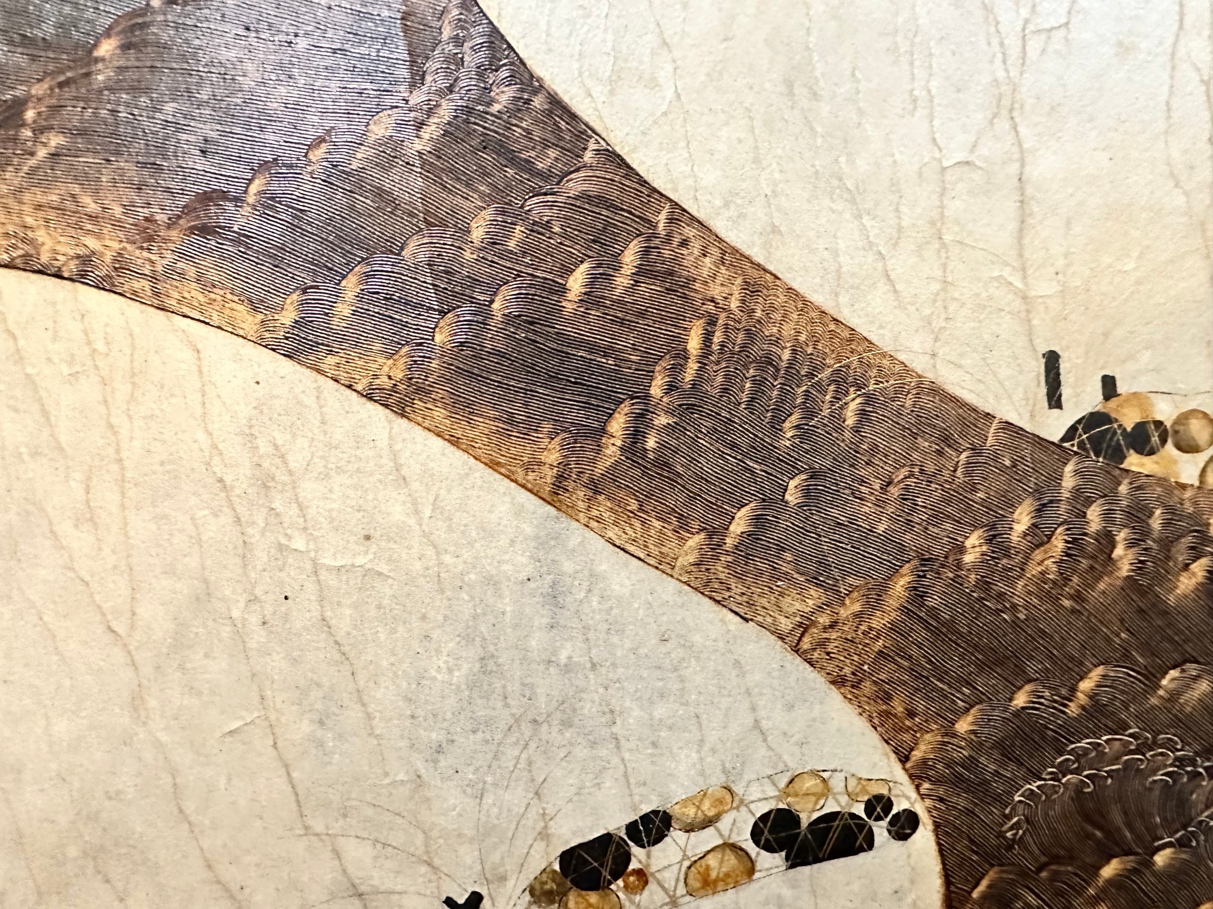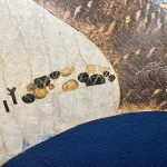 What is remarkable about this work is the exquisite rendering of running water.White waves splashing at the bow of the boat, large waves with gentle curves, and small waves disturbing the surface of the water here and there: ……The artist has skillfully depicted the minute changes in the expression of running water by carefully layering strokes upon strokes.Observe this work up close, and you will be amazed at the outstanding painting technique.