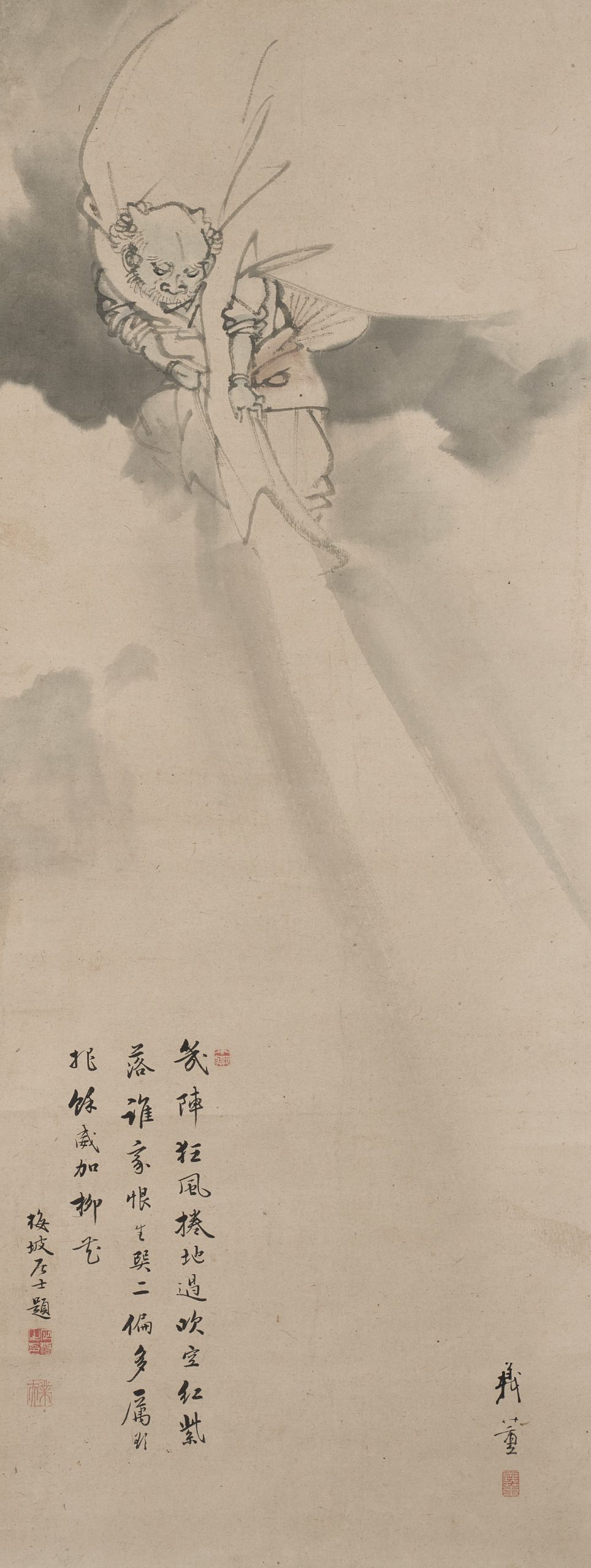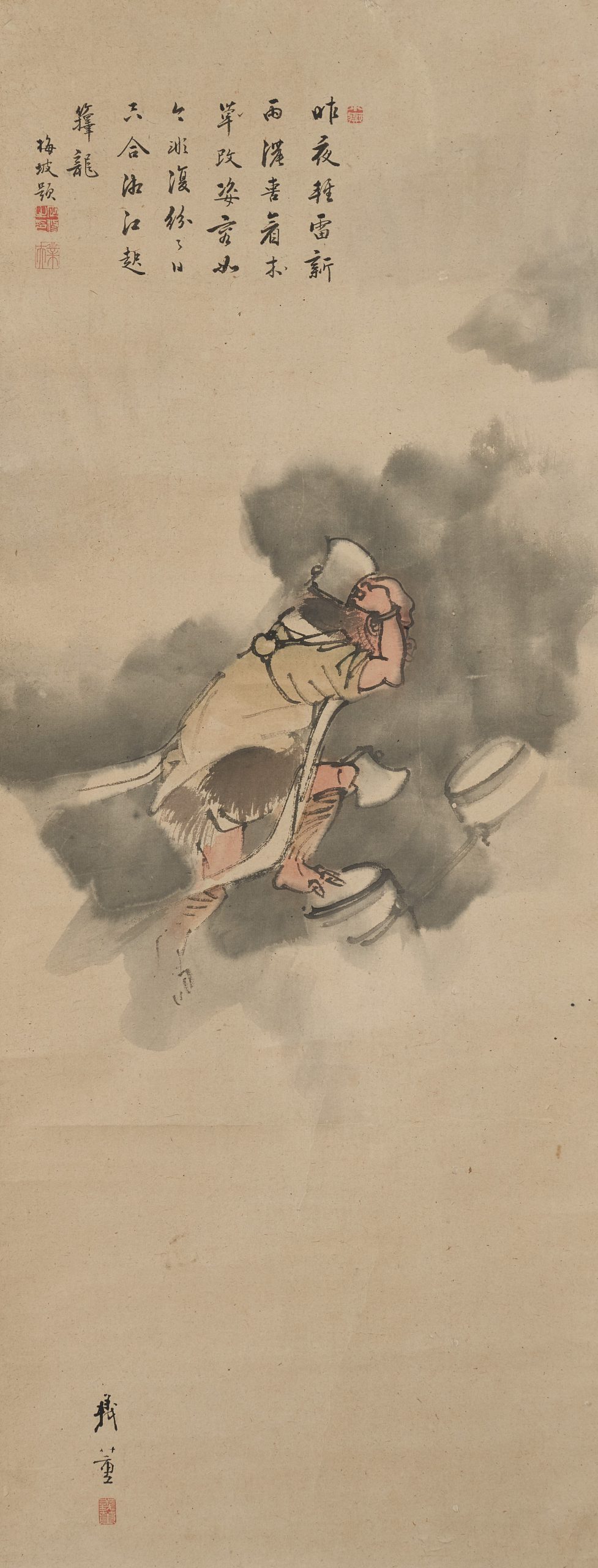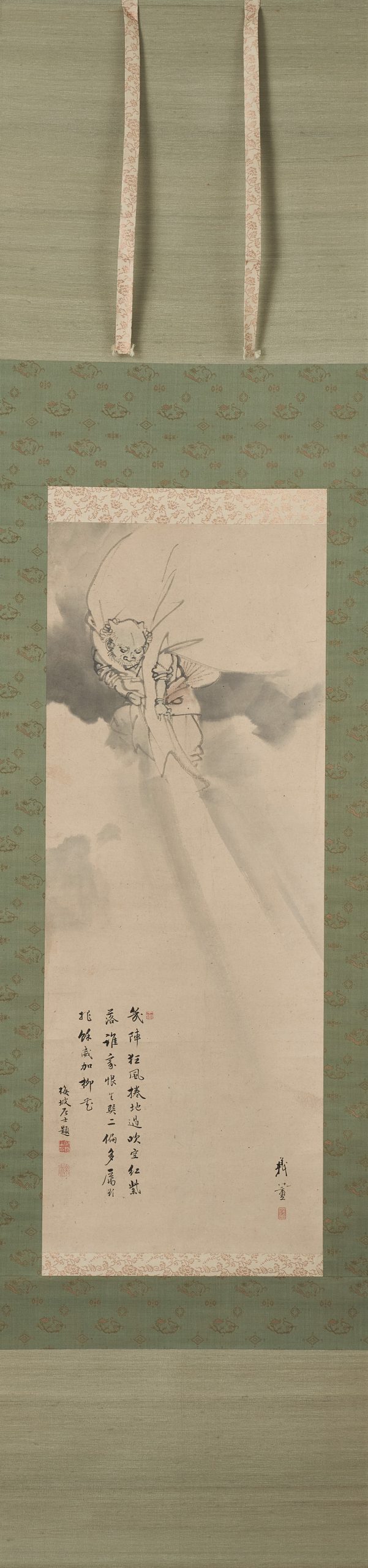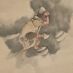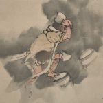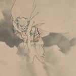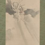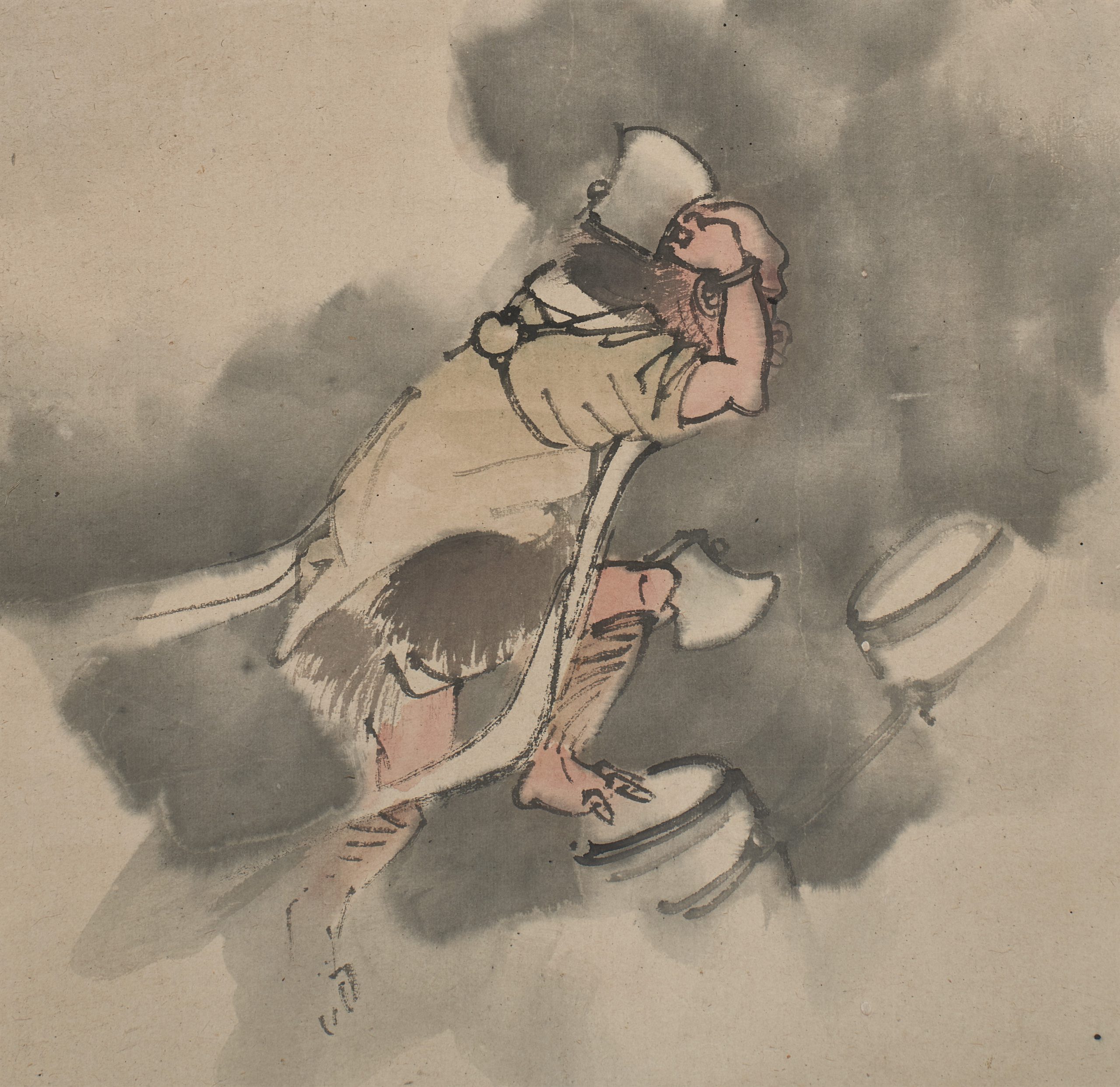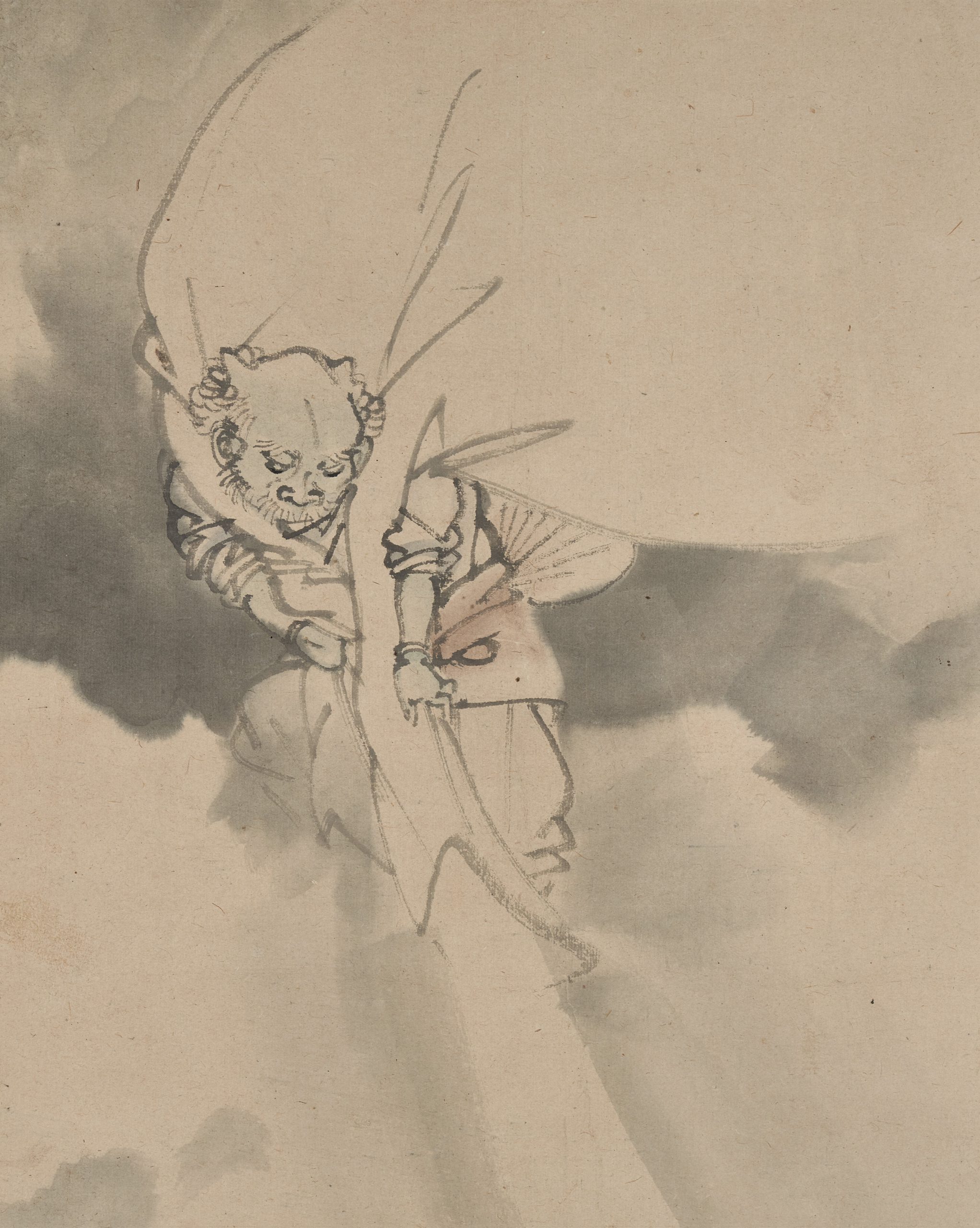 This work depicts the Wind God carrying a large windbag and the Thunder God beating a drum. Although the wind god and thunder god are well-known works by Sotatsu Tawaraya, the light colors and delicate brushwork of this work have a different appeal from those of Sotatsu’s work.