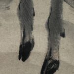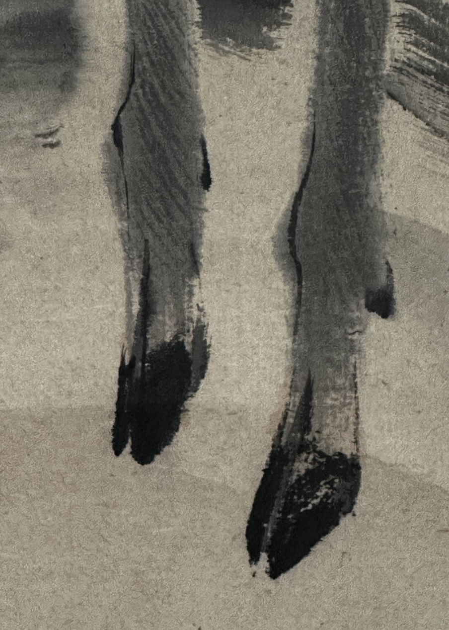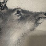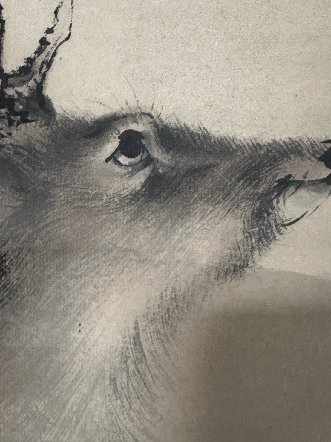 Although this work is painted exclusively in ink, Sosen manipulates the various expressions of the ink to skillfully depict different textures, from soft body hair to hard, dry horns. The closer one looks at the work, the more one is amazed by Sosen’s masterful painting technique. The forelegs grasping the ground and the powerful eyes gazing at a single point are filled with a vitality that transcends the motif of the painting.