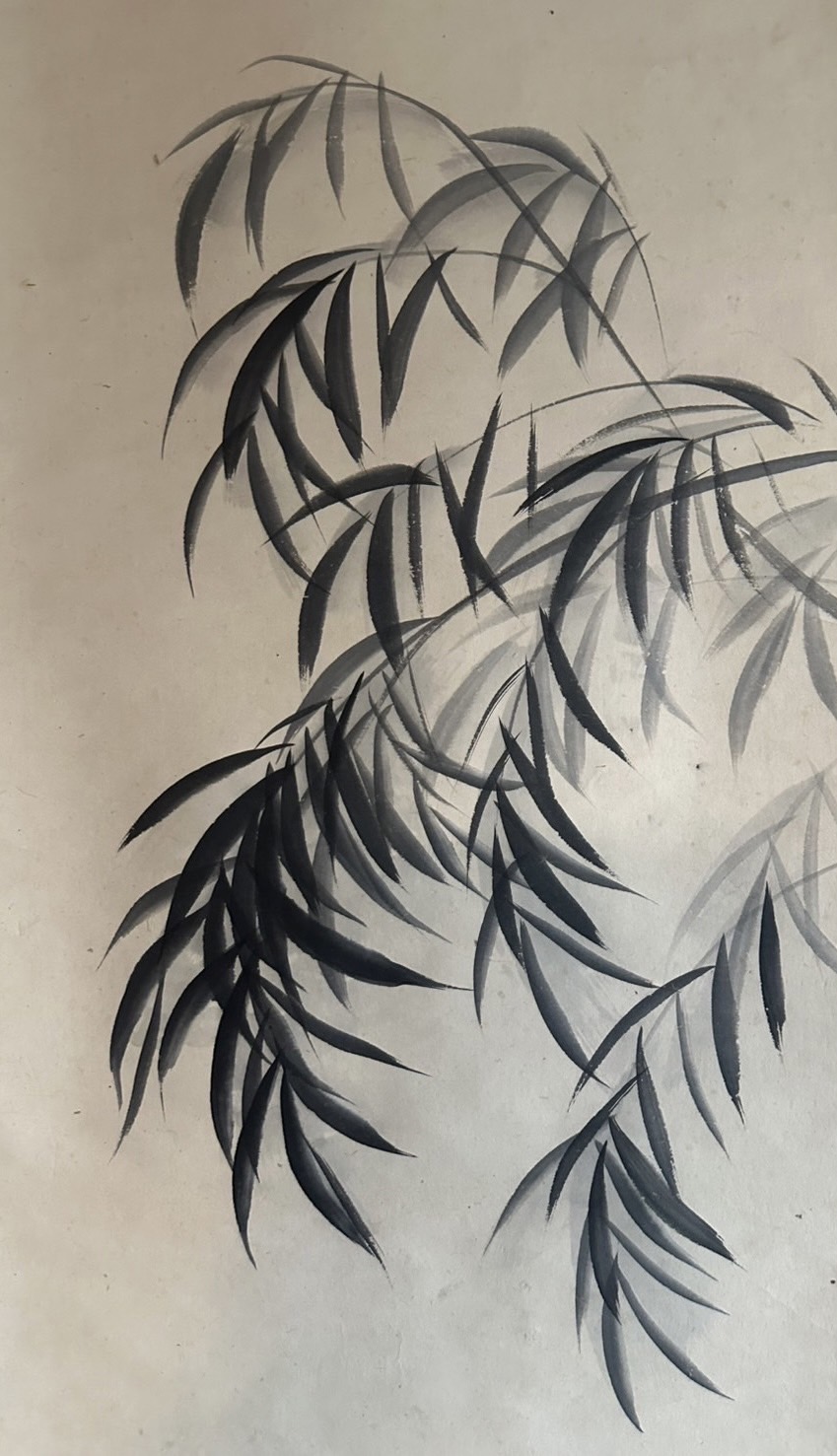 A branch of bamboo grass is leaning over the top of the painting, creating a cool and refreshing scene.