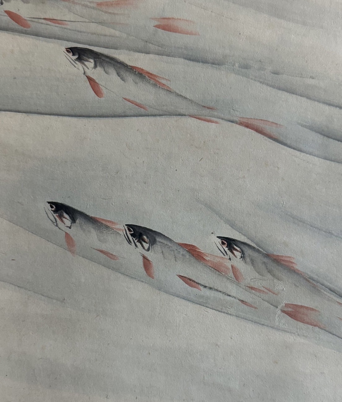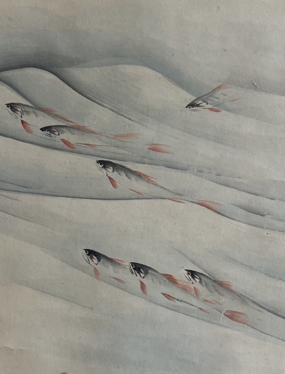 A school of sweetfish swimming in a clear stream is depicted with light brush strokes typical of the Shijo School.
