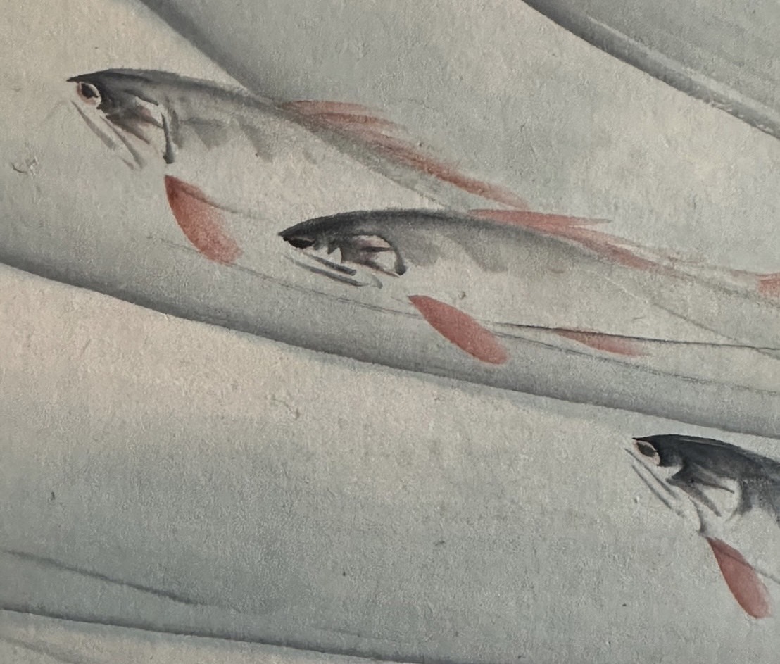 The brushstrokes, which capture the characteristics of the sweetfish without hesitation, show the sure painting technique of Seiki, who was known as one of the “four master artists of the Heian area”.