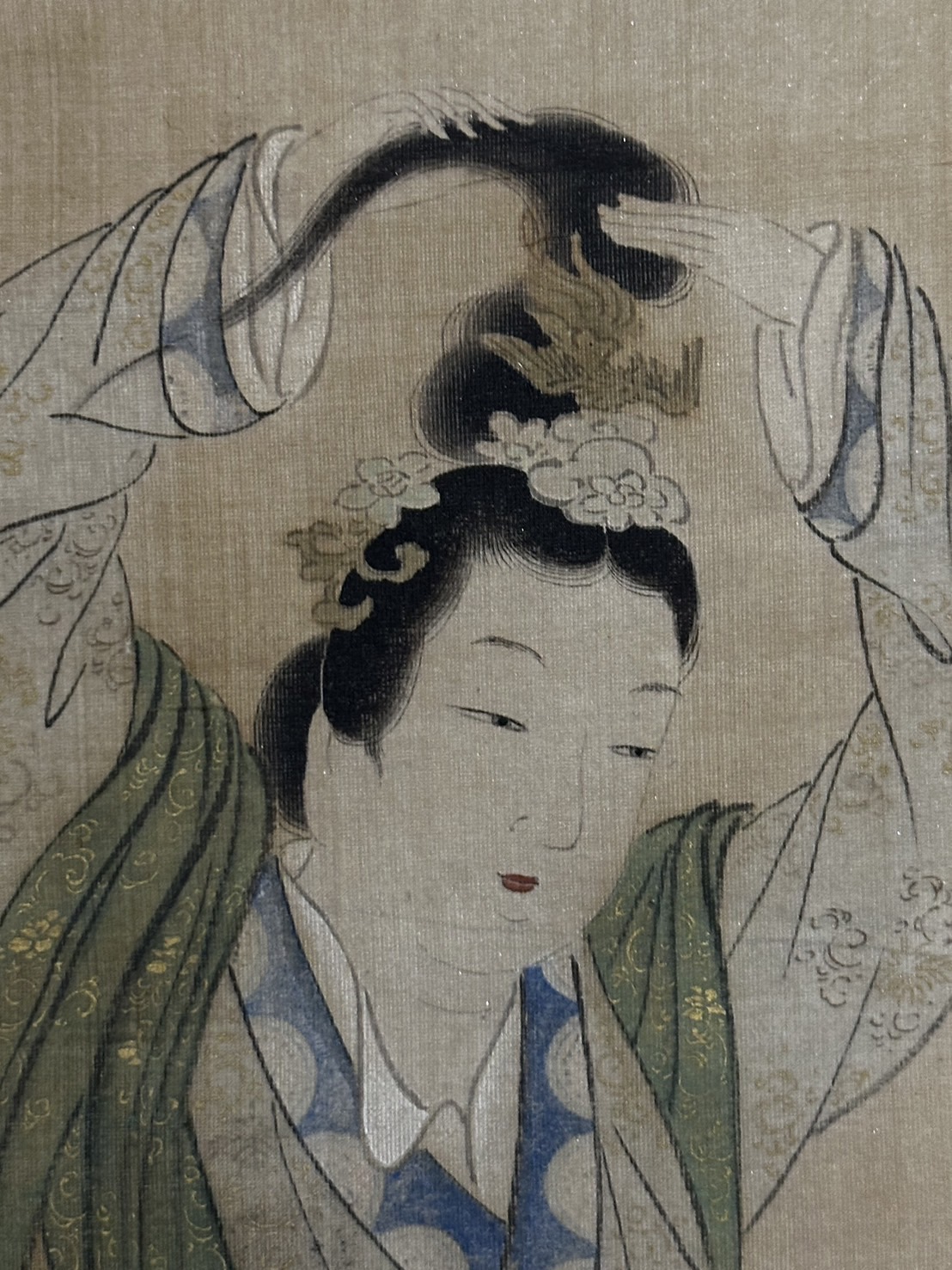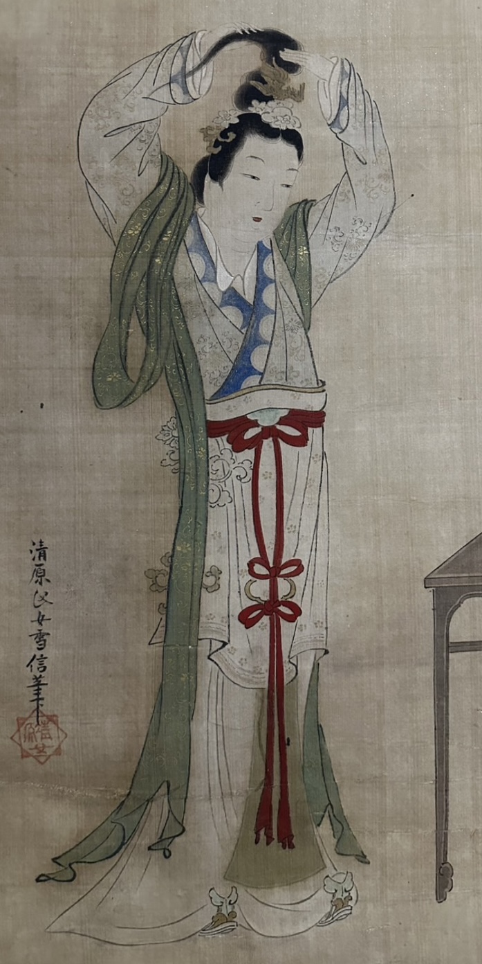 A woman is facing a mirror and tying her hair. Her plump face, supple fingertips, and slender, graceful appearance …… Yukinobu’s brushwork depicts the women’s graceful beauty with great delicacy. The depiction of her face reflected in the mirror on the right is also a point of interest.