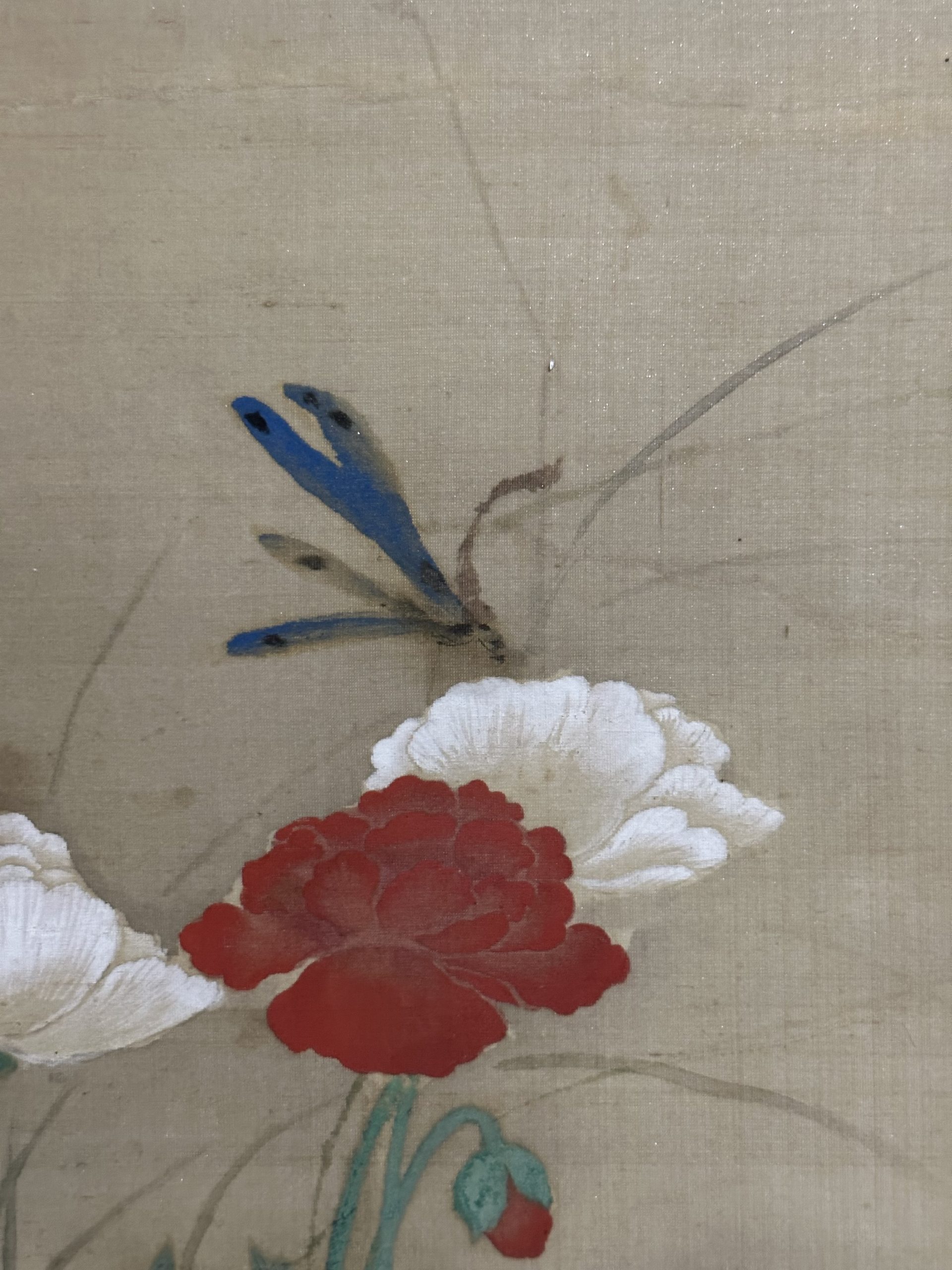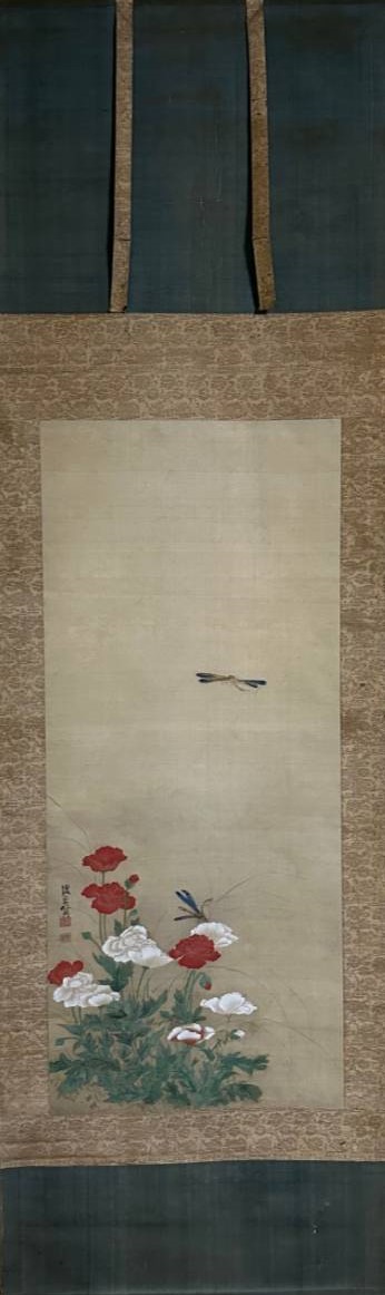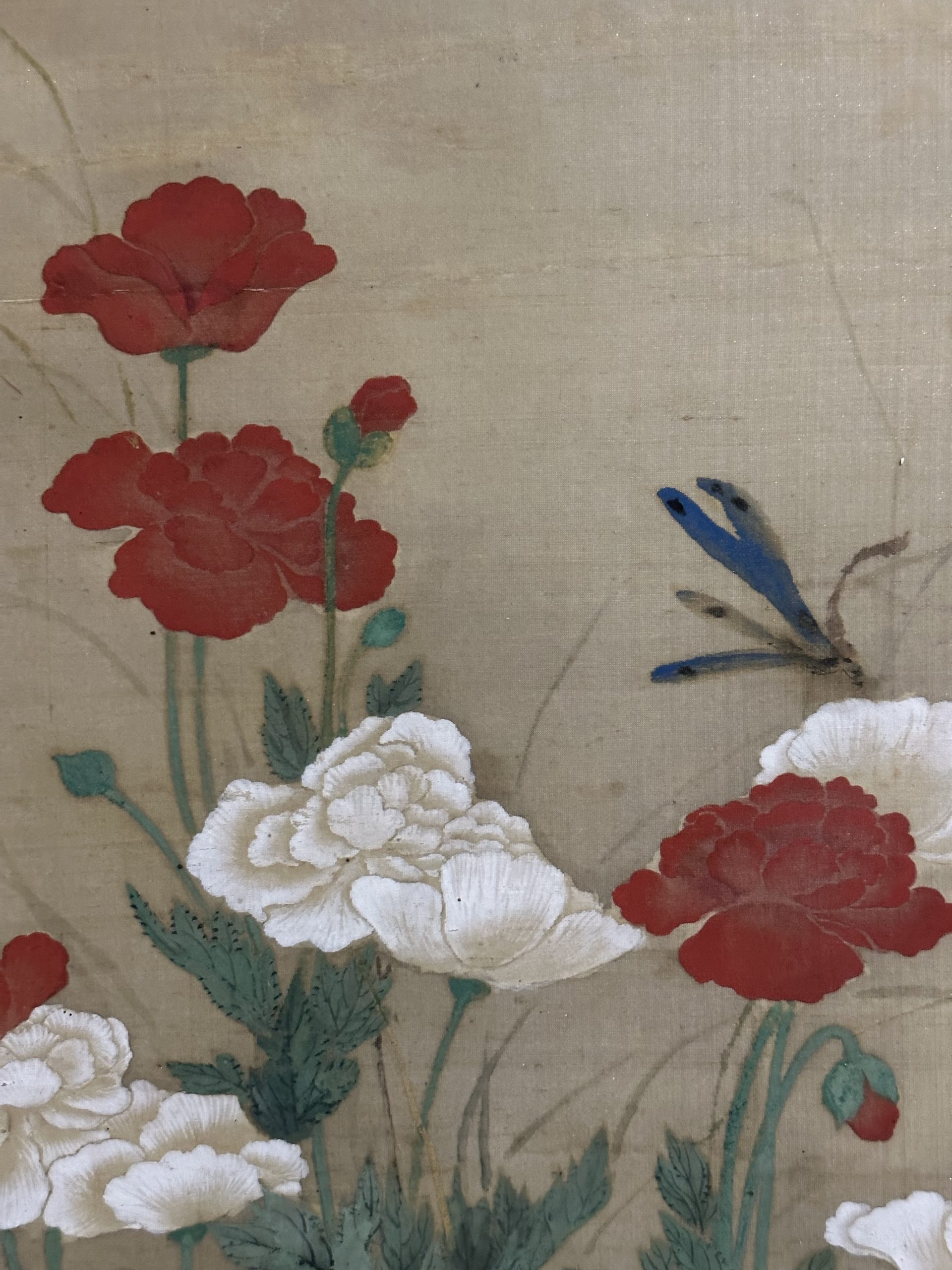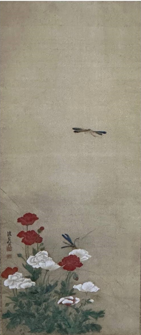 The flowers and plants in Rimpa paintings are known for their high design quality, but the poppies and dragonflies in this work seem to have been painted with an awareness of realism.