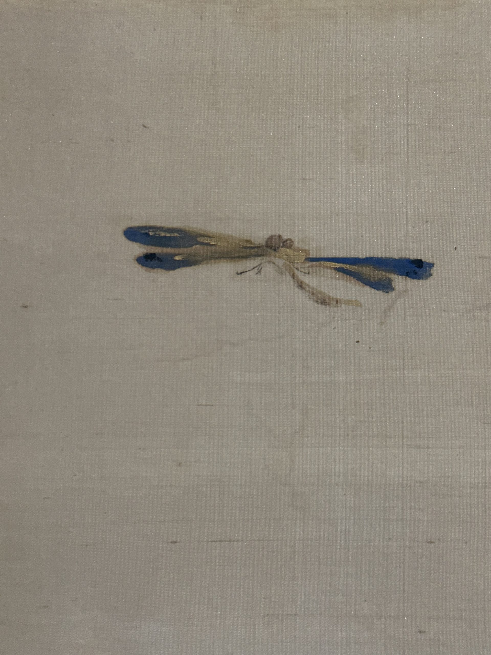 Poppy is a common subject in Rimpa paintings, but its combination with dragonflies is unusual. The graceful and elegant poppy and the lovely dragonfly with soft-looking wings. The artist has created a fragile atmosphere by leaving plenty of blank space in the painting and depicting them as if they were quietly nestled in a corner, making one feel as if one wants to protect them.