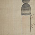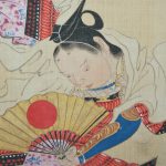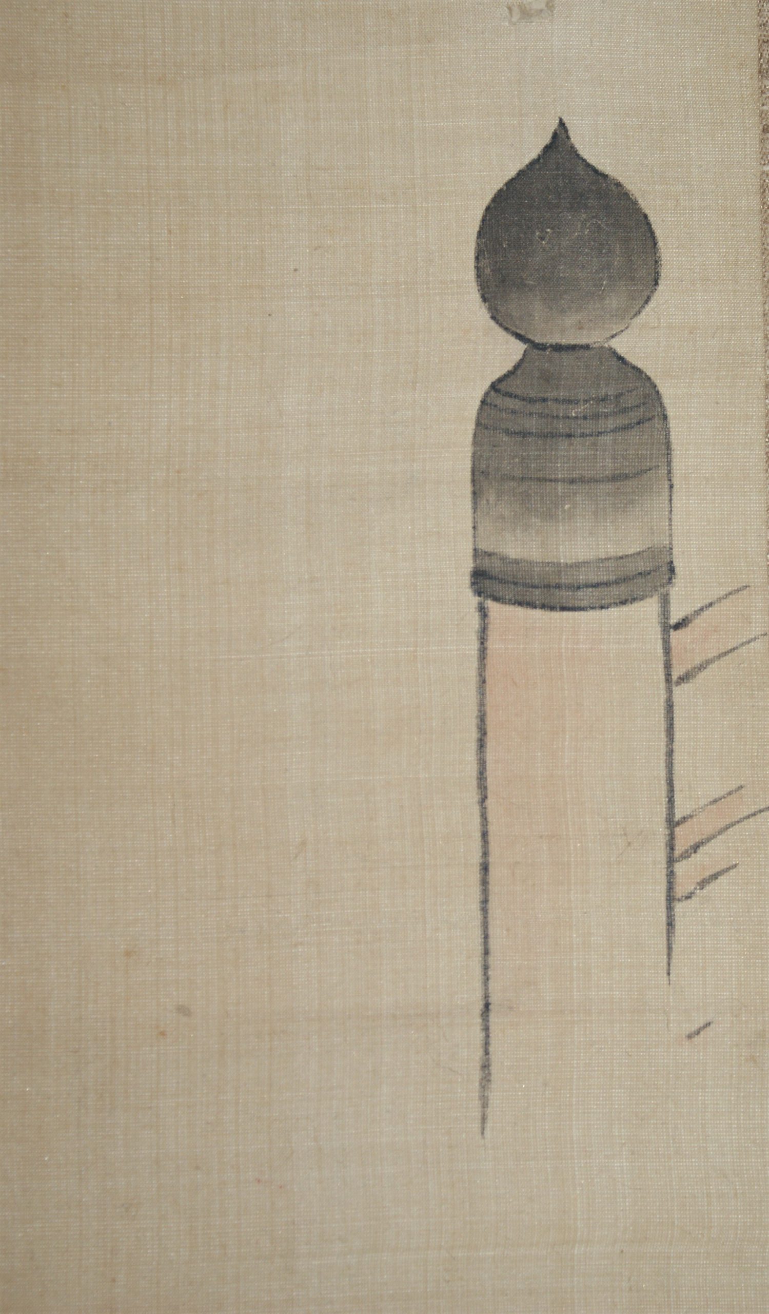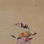 In the lower right corner of the painting, we can see a parapet decorated with giboshi, indicating that this is the Gojo Bridge. Ushiwakamaru is gazing downward, but nothing is depicted beyond his gaze, but Benkei must be there.