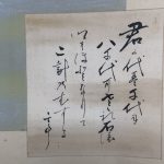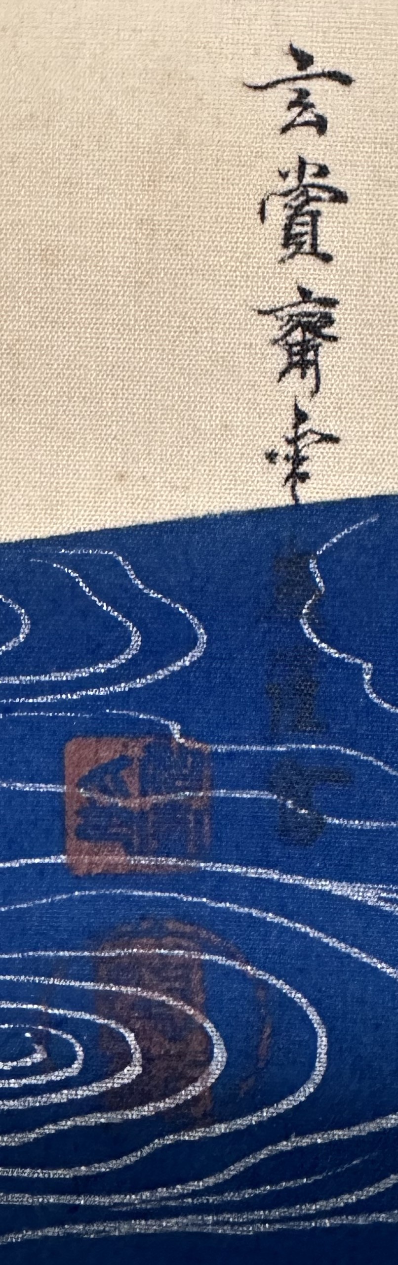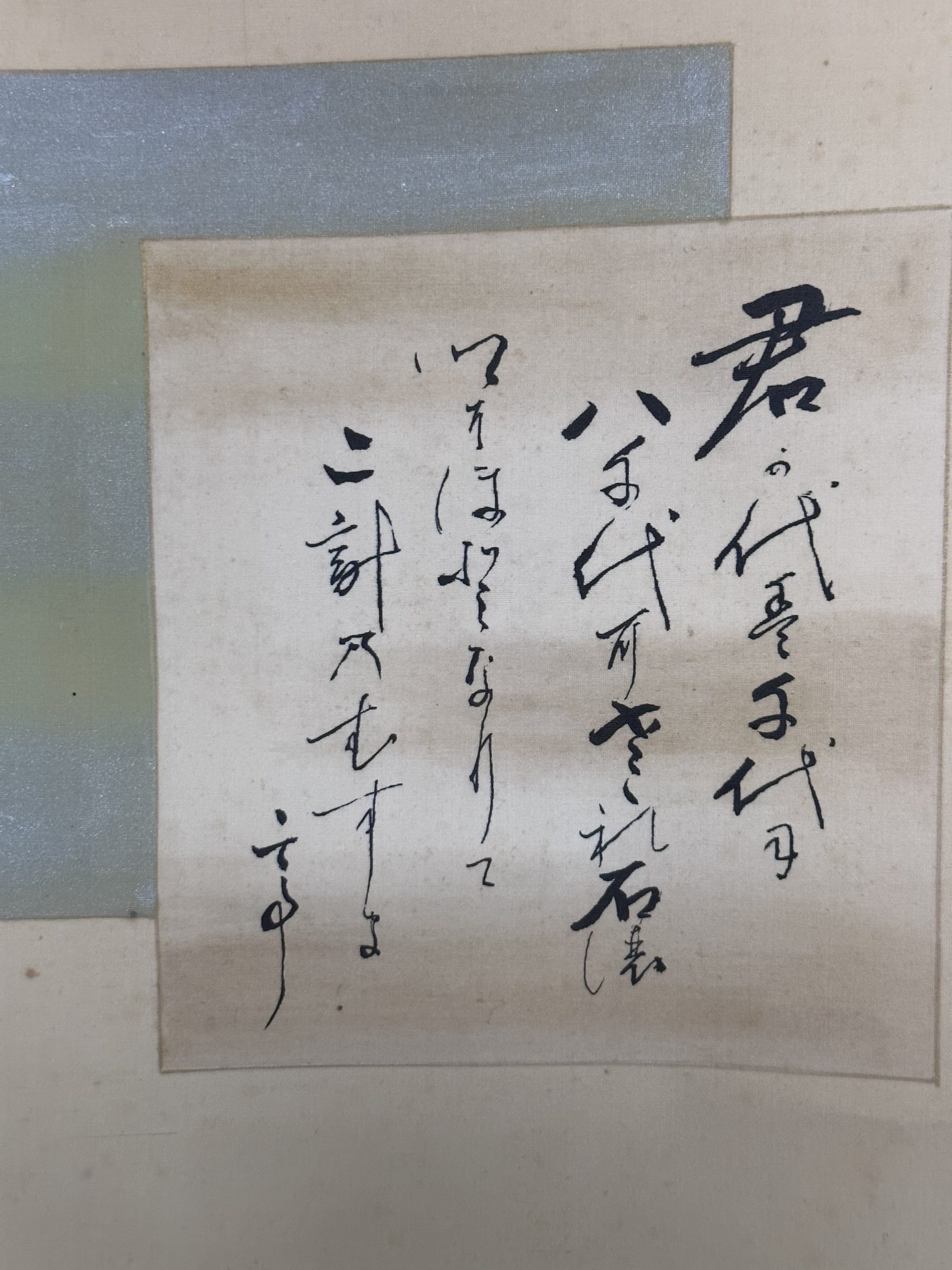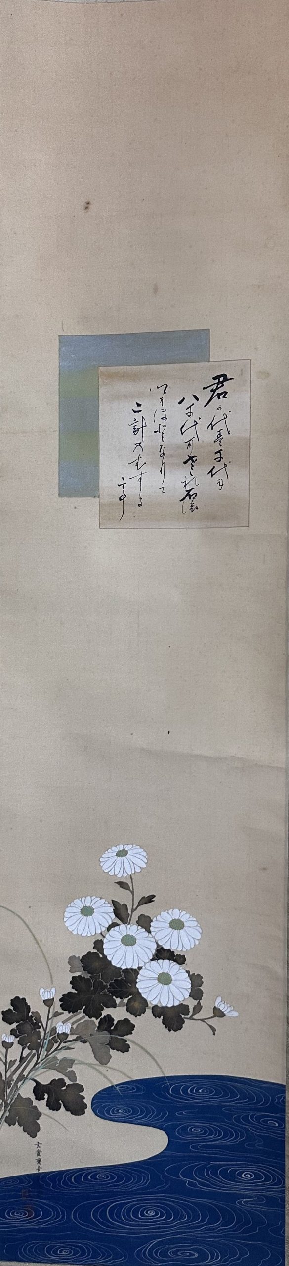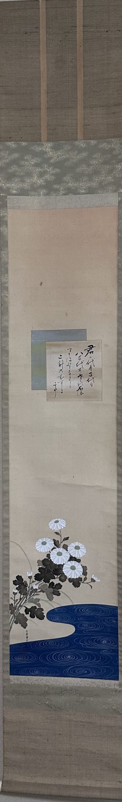 The combination of flowing water and chrysanthemums, as in this work, has long been favored as a motif for prolonging one’s life. The upper part of the painting is accompanied by an inscription in the form of colored paper.