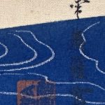 A single white chrysanthemum blooms beside gently undulating water. The contrast between the dazzling navy blue and dazzling white is beautiful and gives the work an elegant and refined impression. The leaves of the chrysanthemum are sprinkled in places with gold mud, beautifully expressing the natural texture of the chrysanthemum.