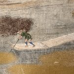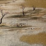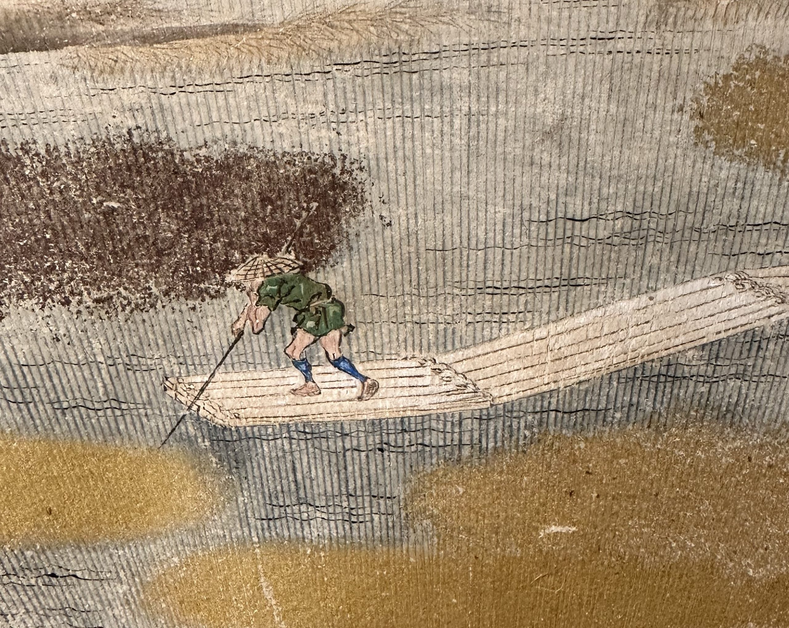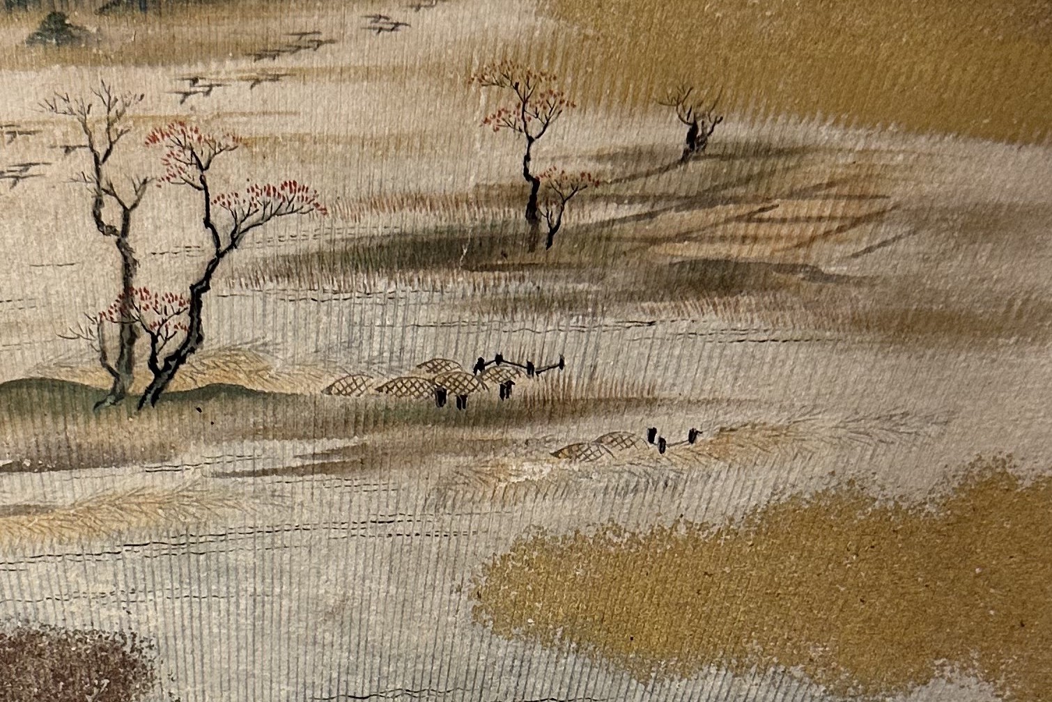 A raft rider wearing a sedge hat crosses the river in the near background. His face is not visible from the viewer’s perspective, but it appears as if he looks up and gazes ahead. Following his gaze, we see a flock of geese flying away over the autumn-colored countryside. The geese are probably on their way home.
