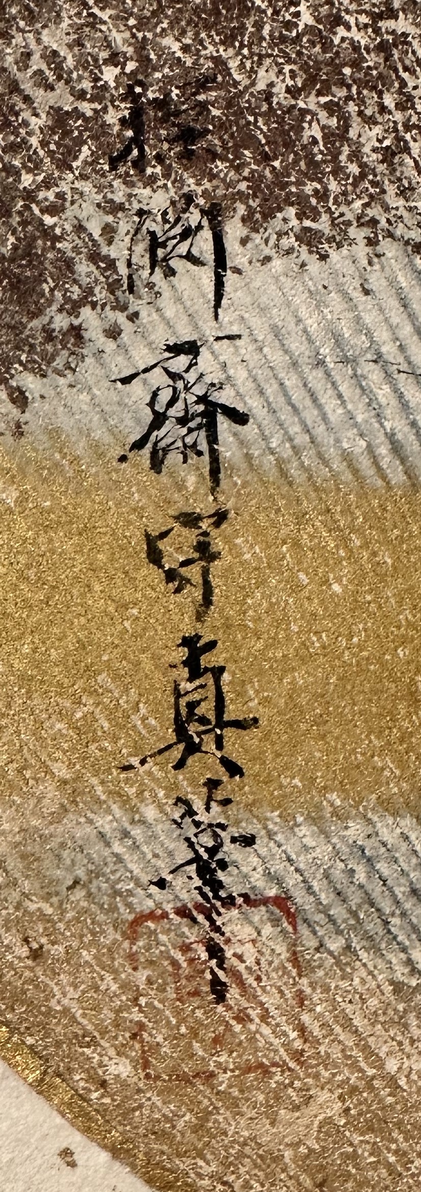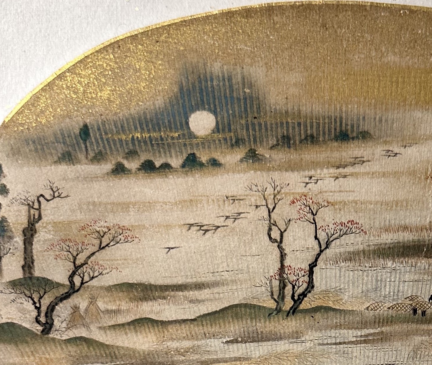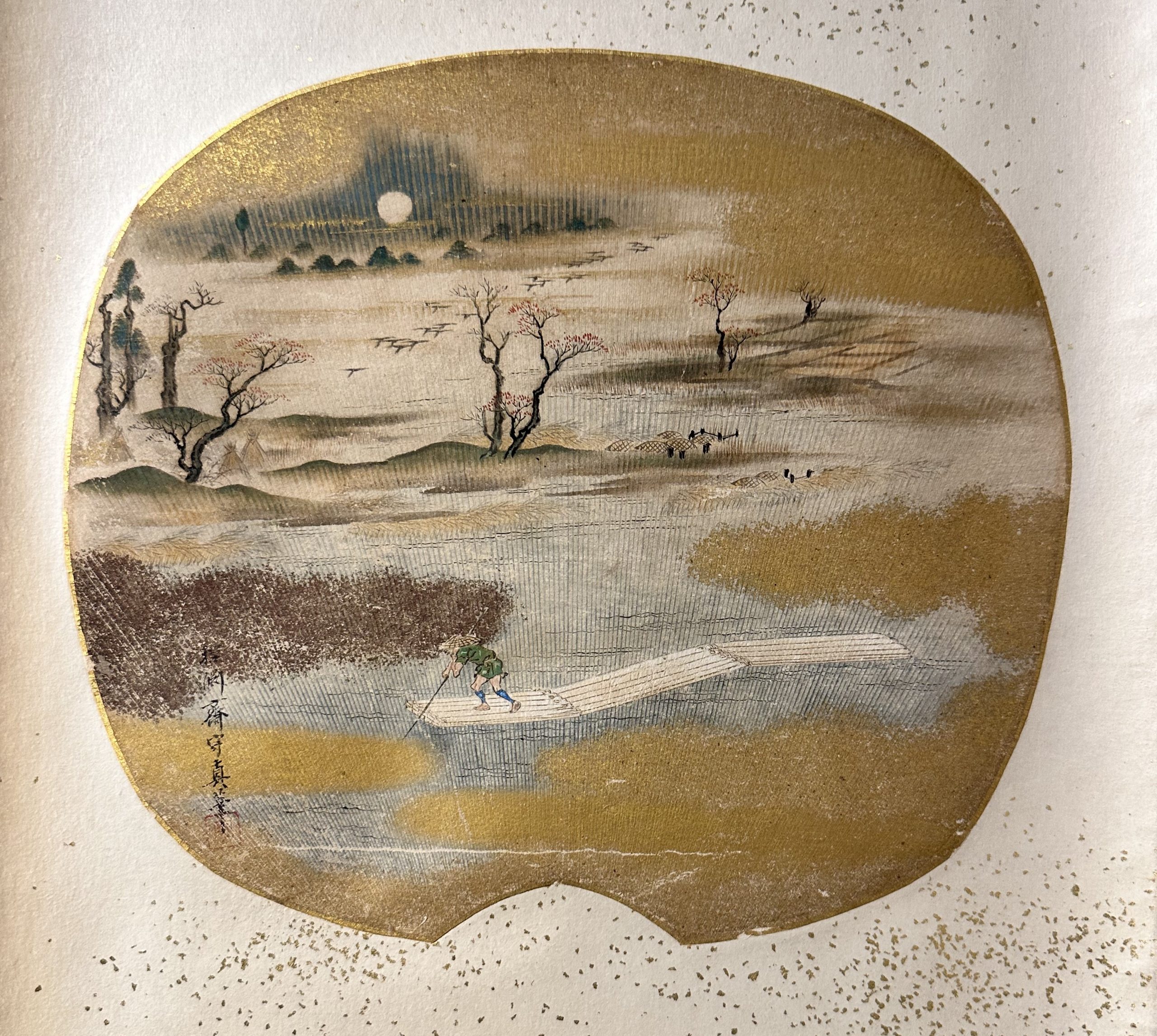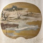 The skillful placement of the motifs and the effective use of golden clouds add depth to the picture. The technique of creating an expansive sense of landscape in spite of its small size is truly brilliant. The gold leaf scattered on the mount also creates an elegant atmosphere.