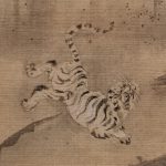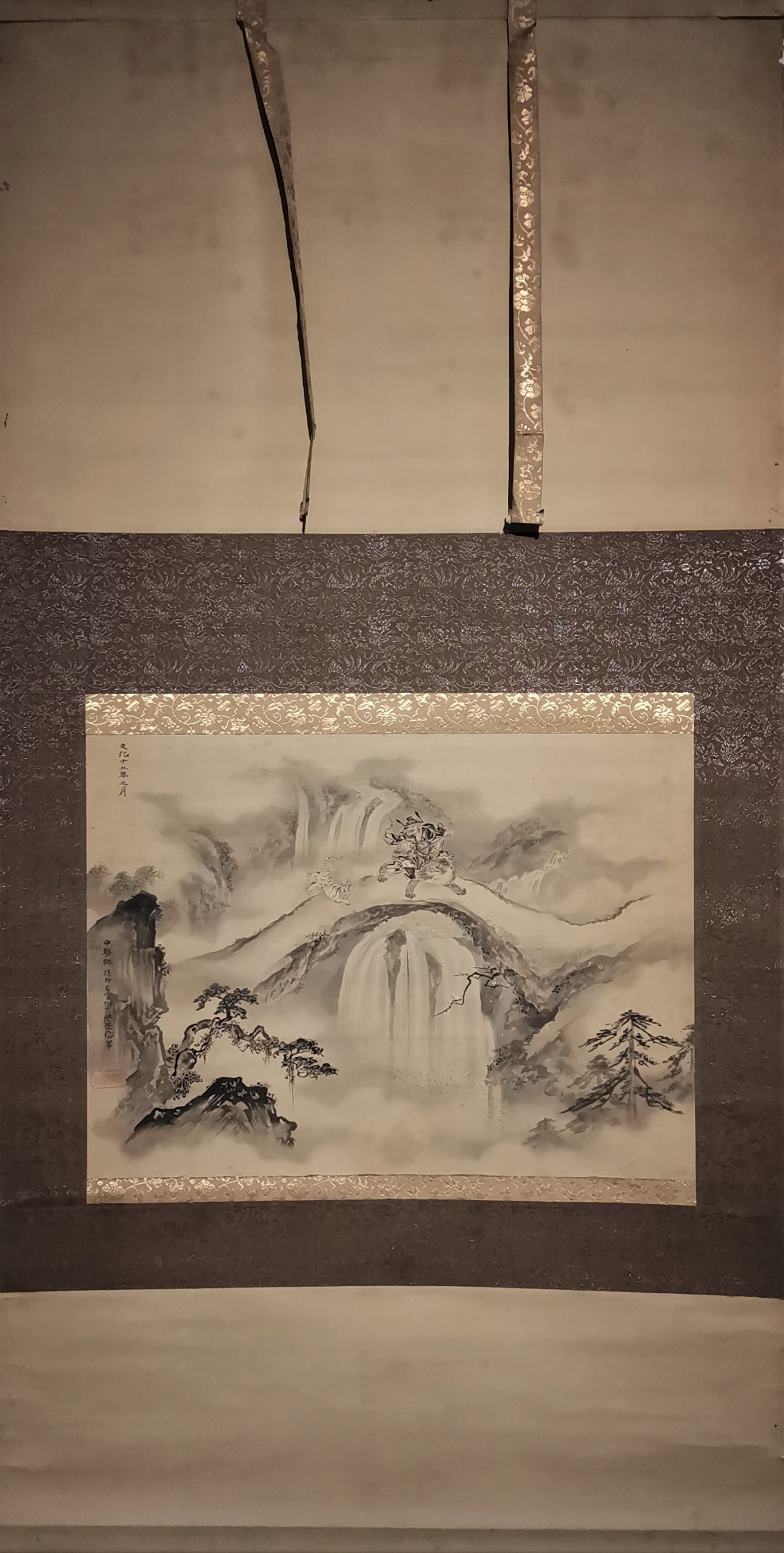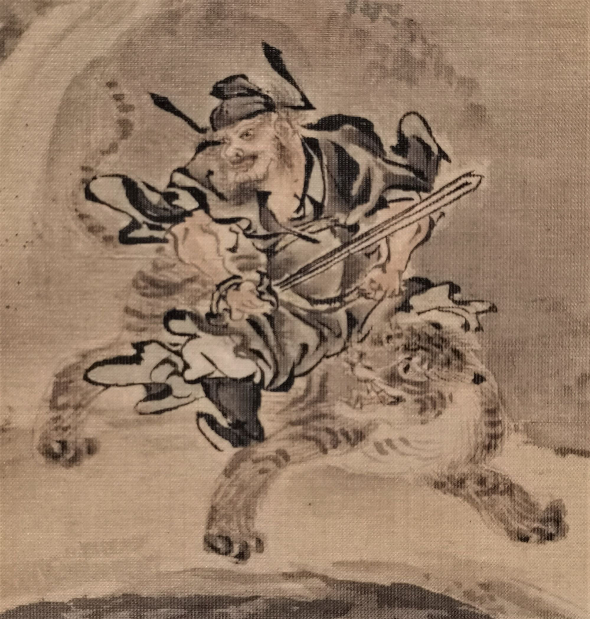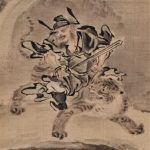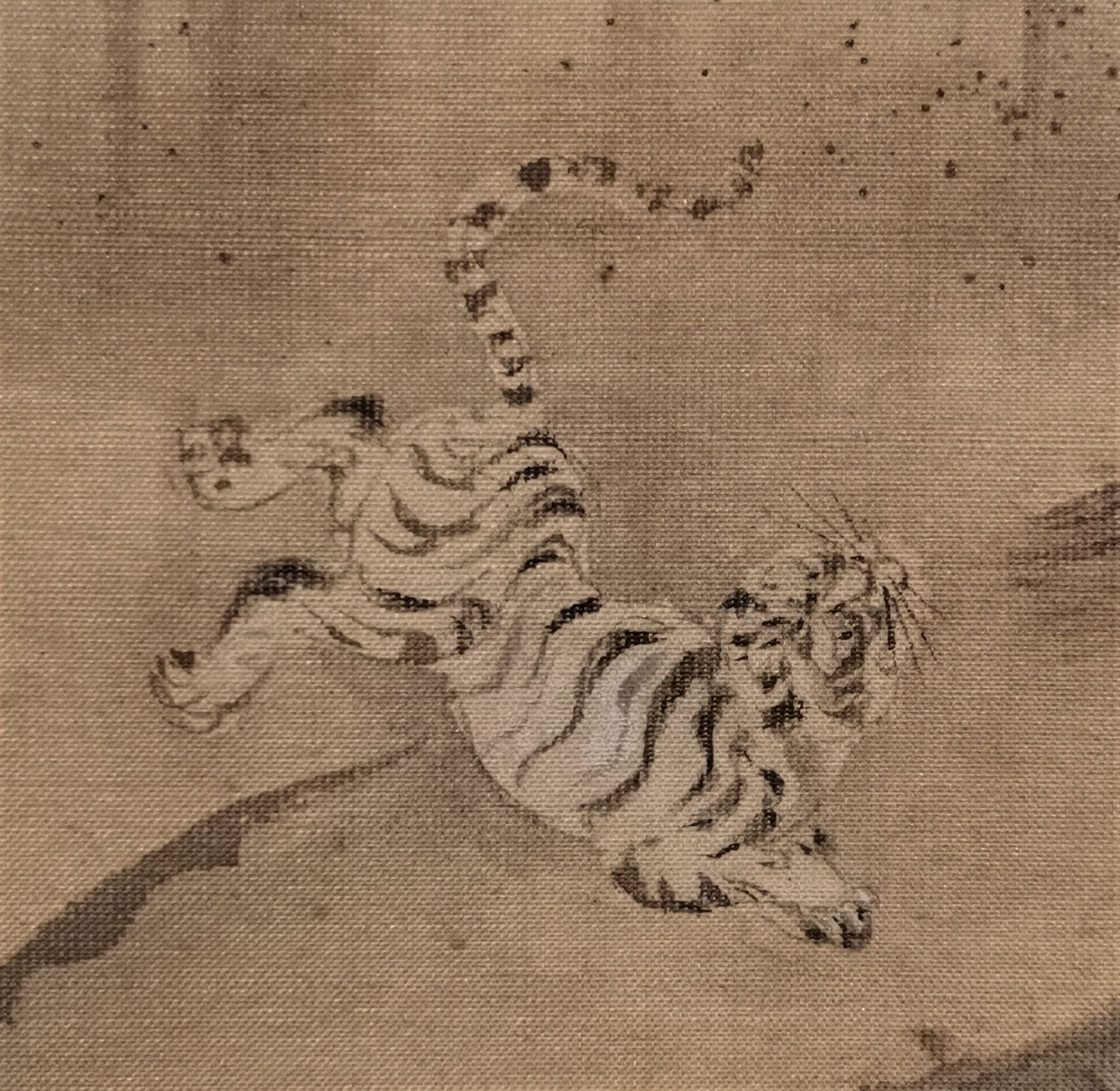 It depicts Zhong Kui on a tiger and a baby tiger confronting each other. Zhong Kui seems startled by the sudden leap of the tiger.