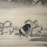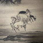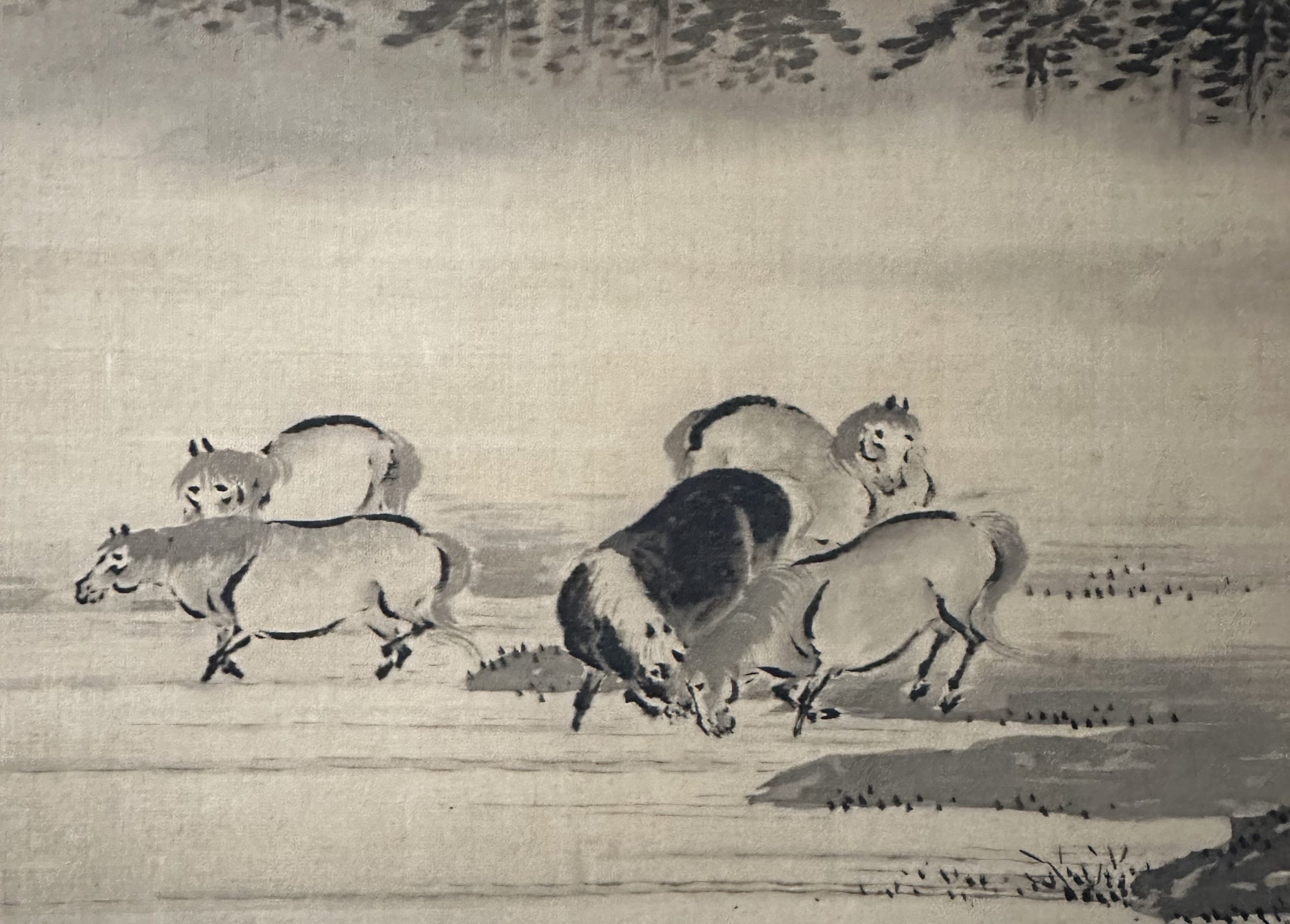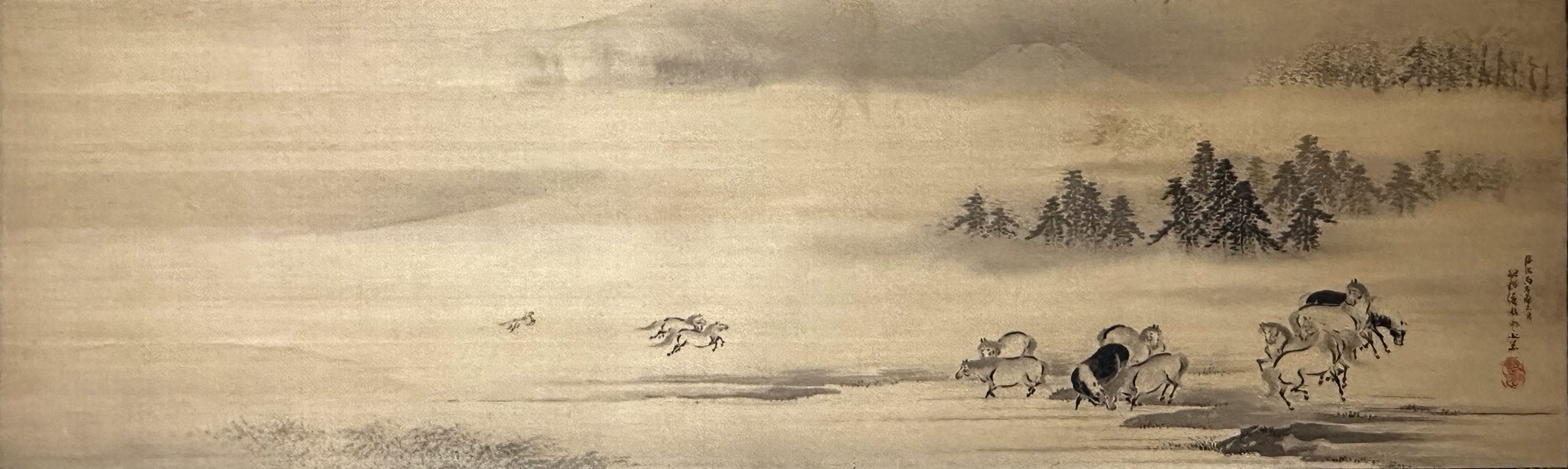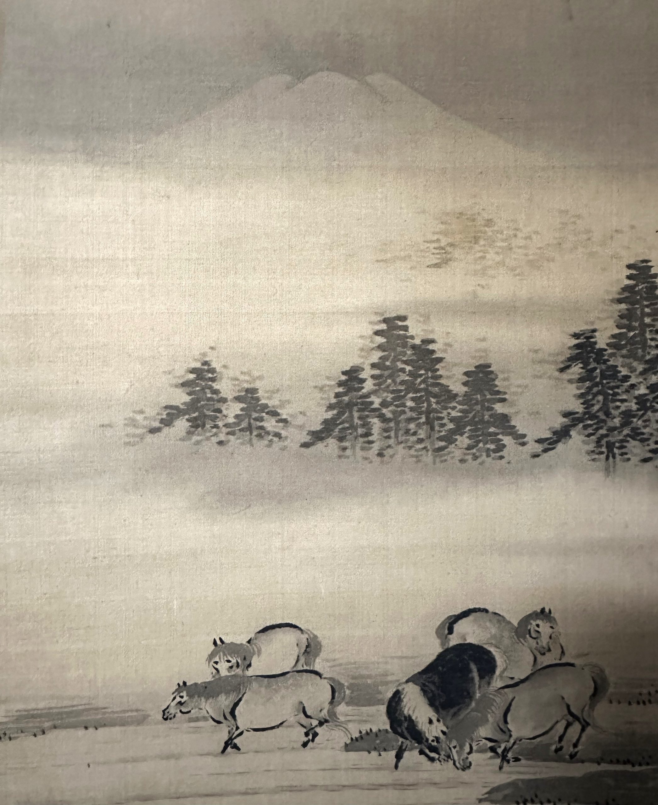 The horses on the right are looking back, perhaps startled by the sound of the colts chasing them. The difficult posture of the horses looking back, painted with a small number of strokes and without any disruption, shows the skill of Eigaku, who was famous as a Kyogano artist at the end of the Edo period. The muscles of each horse are raised, expressing the sturdiness of a wild horse.