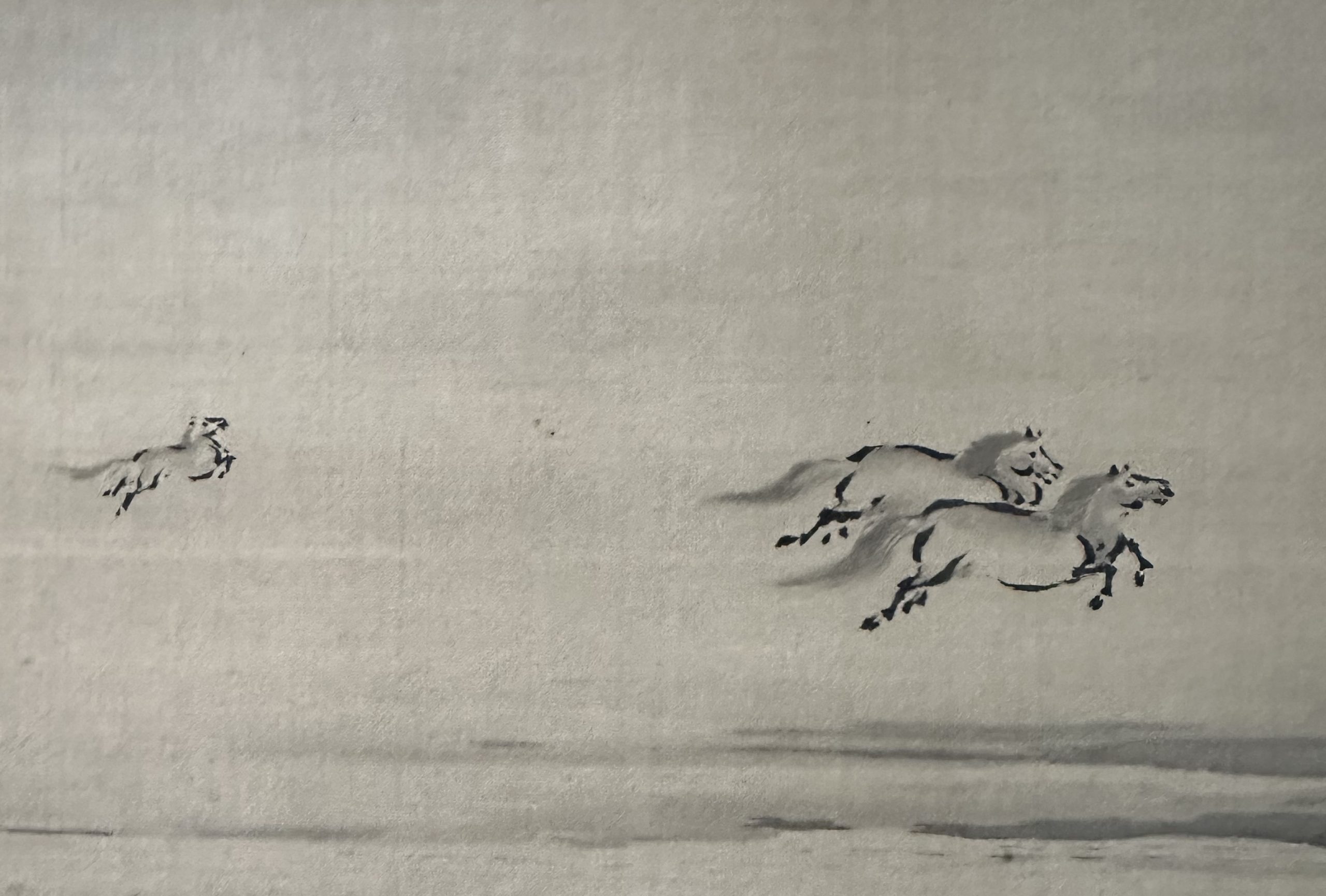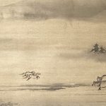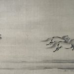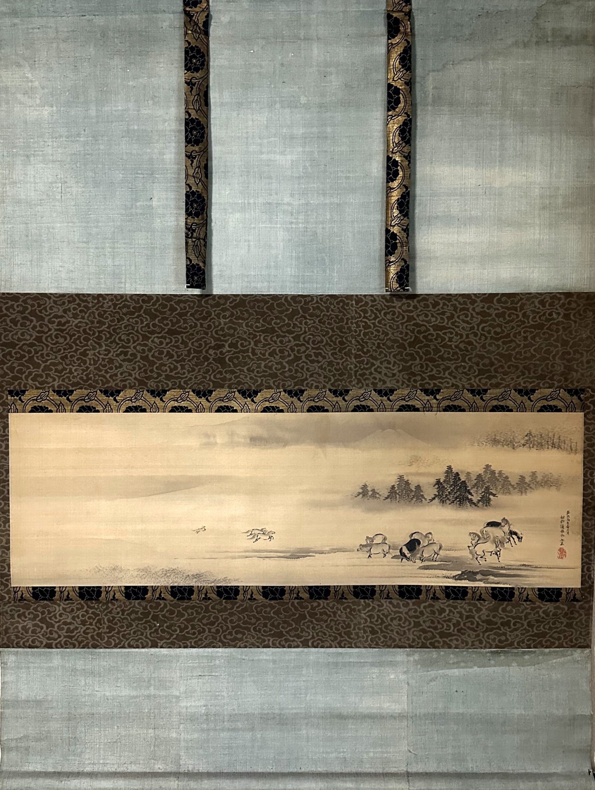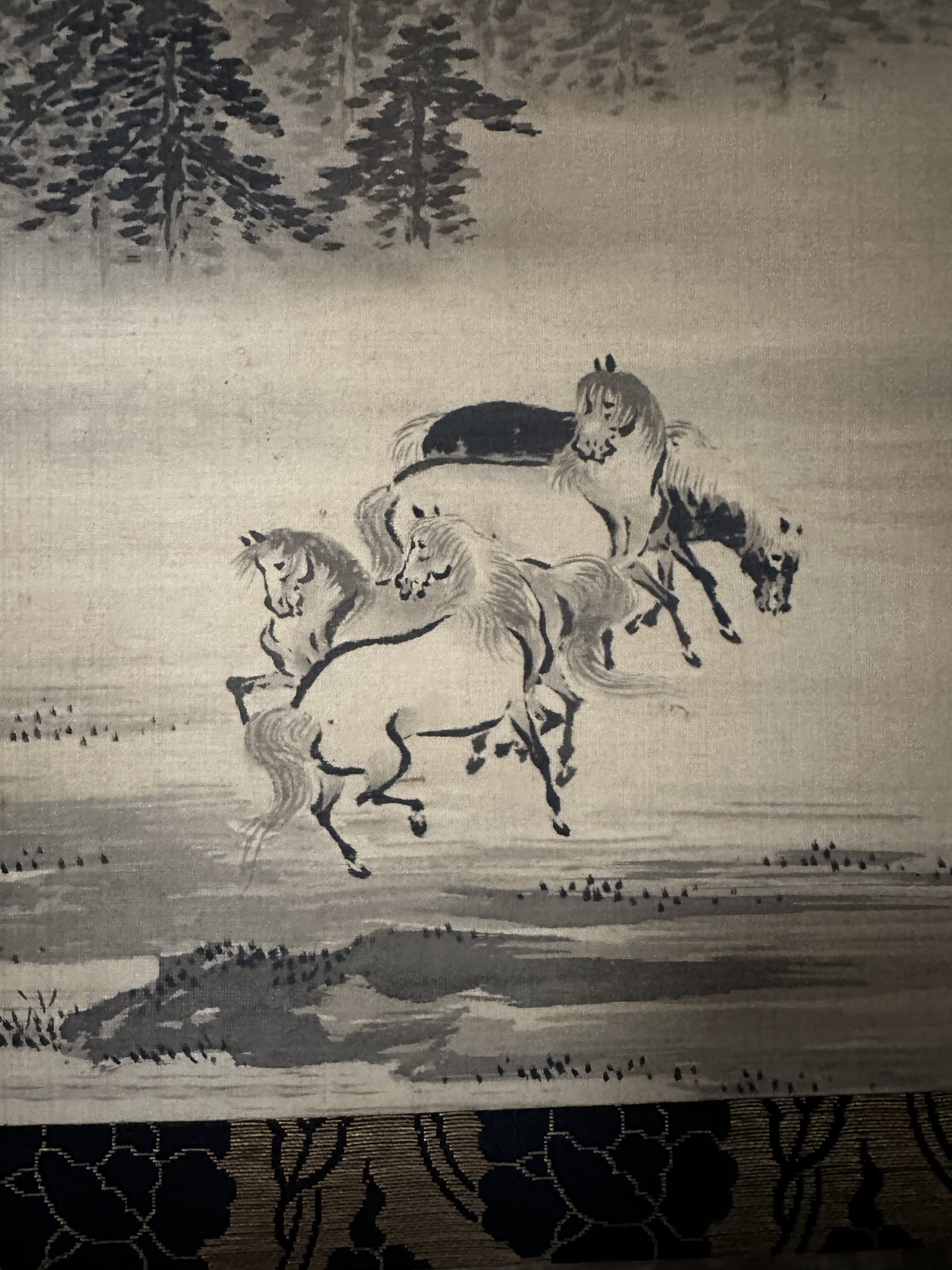 The horses on the right are looking back, perhaps startled by the sound of the colts chasing them. The difficult posture of the horses looking back, painted with a small number of strokes and without any disruption, shows the skill of Eigaku, who was famous as a Kyogano artist at the end of the Edo period. The muscles of each horse are raised, expressing the sturdiness of a wild horse.