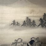 As indicated by the inscription, this work seems to have been painted during the New Year’s holiday in honor of the horse, the Chinese zodiac sign for that year. Fuji, a familiar New Year’s lucky charm, can be seen in the distance. Fuji is visible in the distance. A haze hangs over the area from its mid-slope to its base, revealing its snow-capped peak. The haze emphasizes the remoteness and height of the mountain.