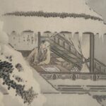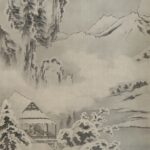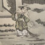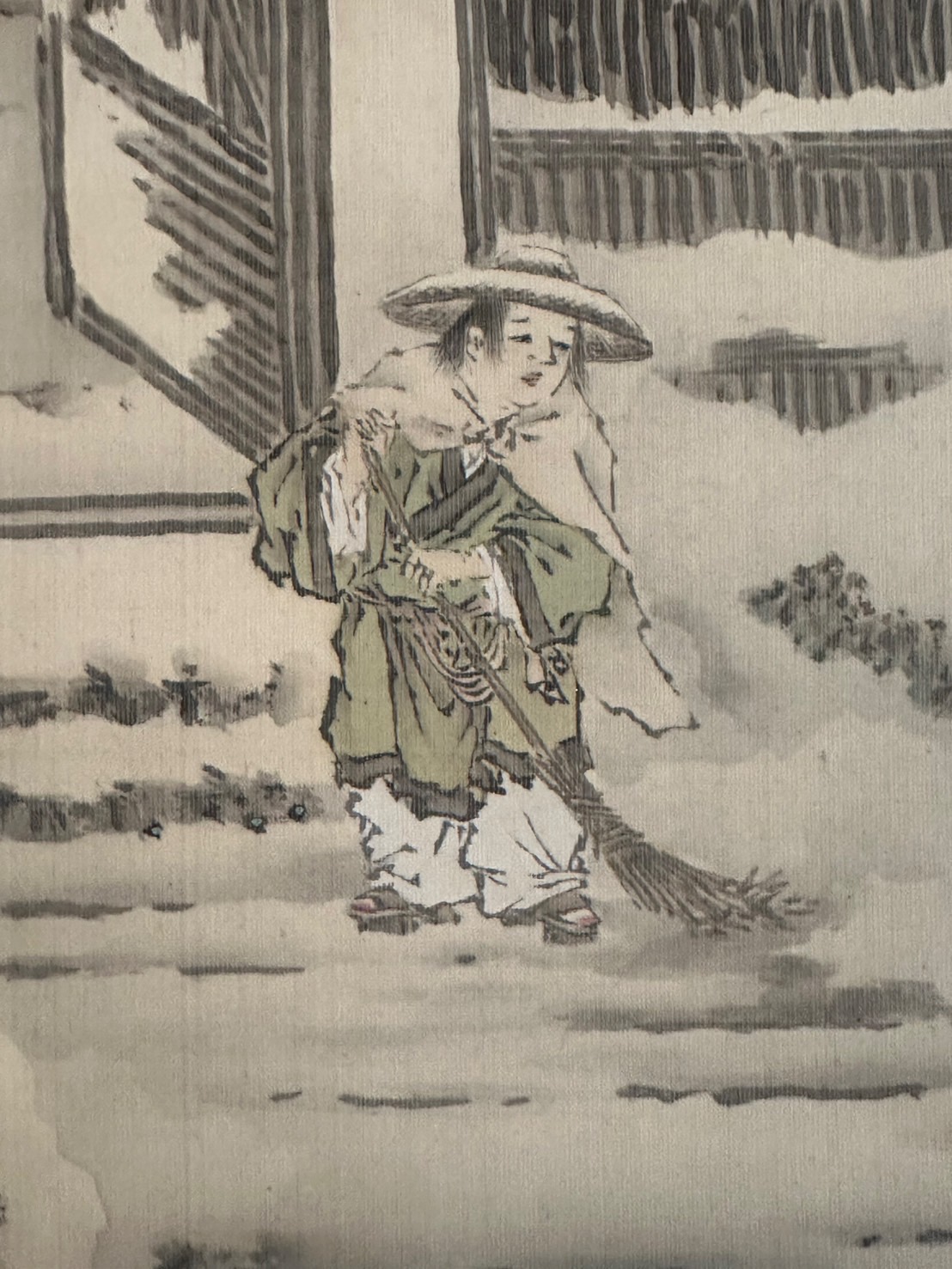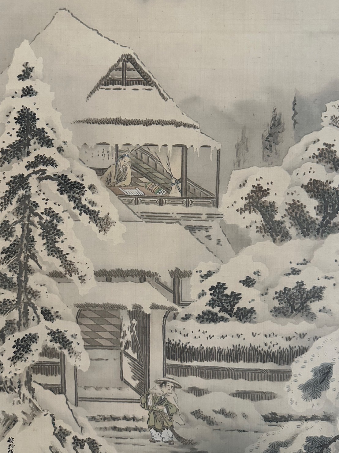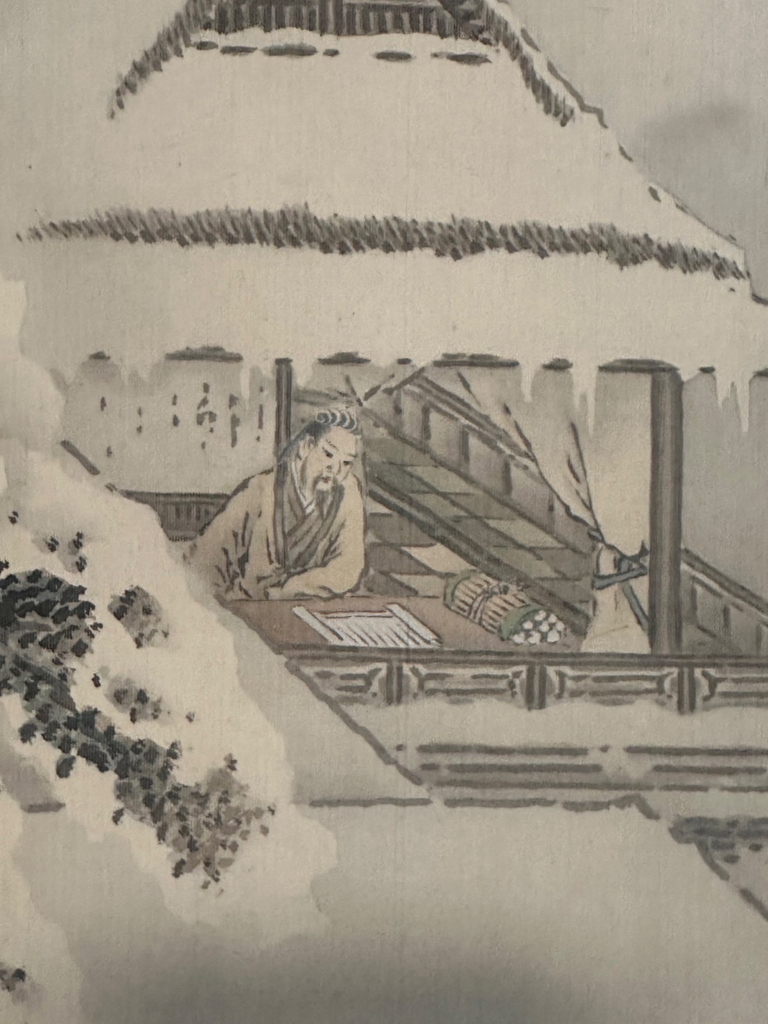 The old man in the study by the window, leaning on his elbow and looking down at his book, is probably the master of this hermitage. Behind him rises the quay, and in the distance are a series of snow-capped mountains. The winter mountains in the morning are quiet and snow-covered. All that can be heard is the regular sound of the Samurai children moving their brooms. ……