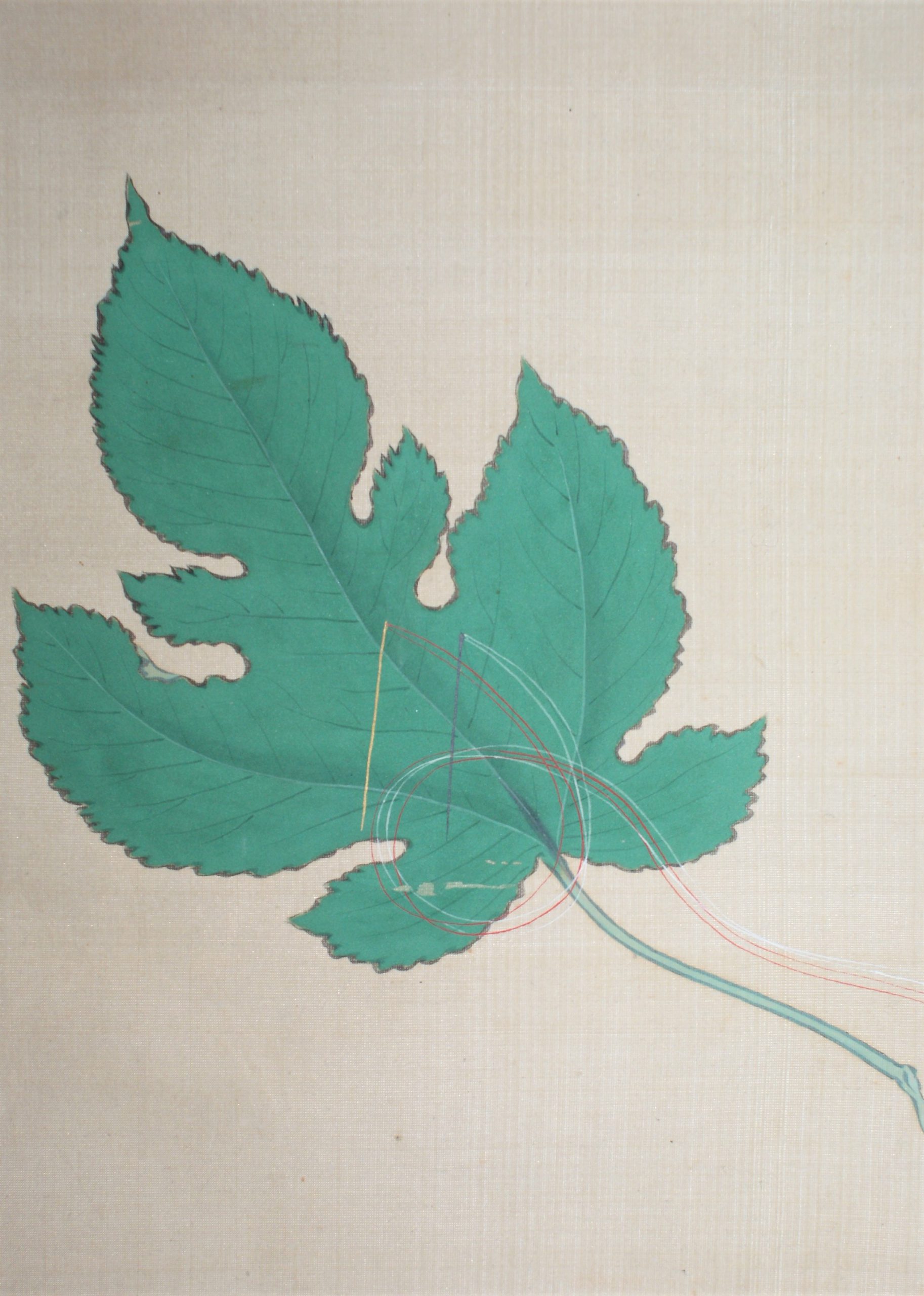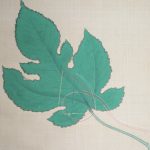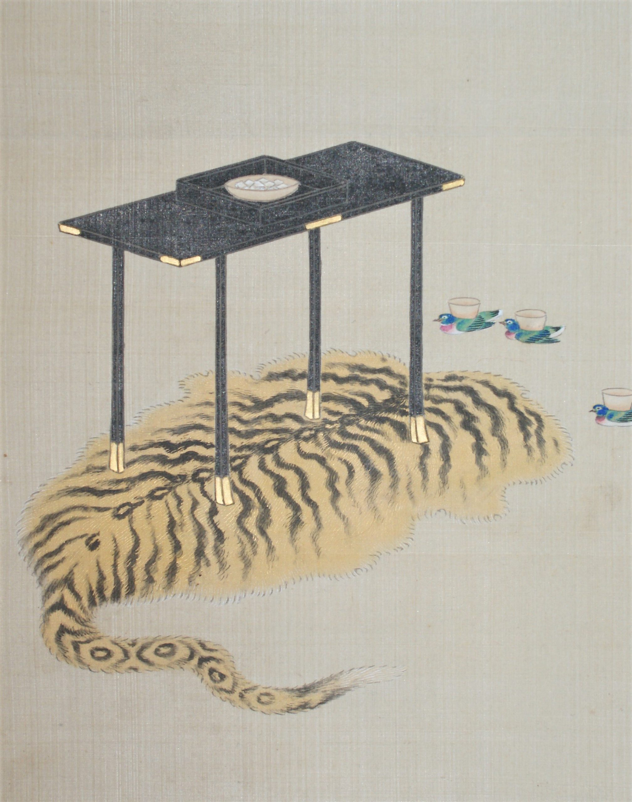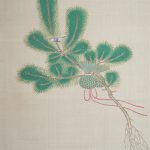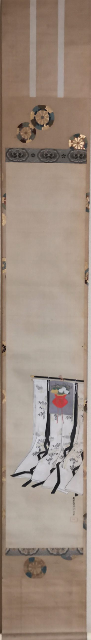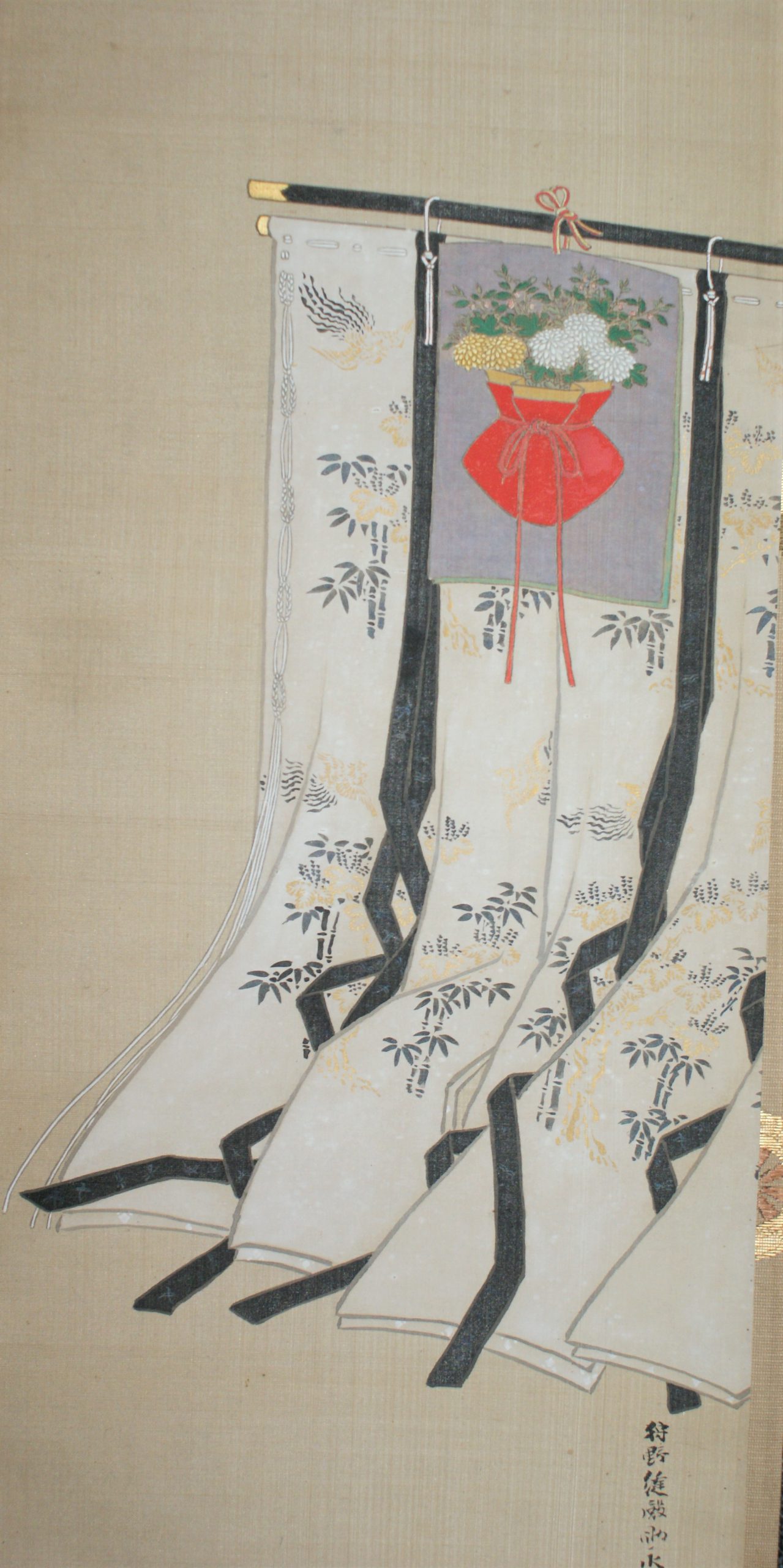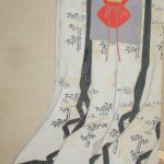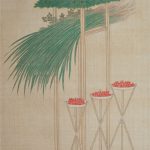 The “Jinjitsu” scene depicts a pine tree with a pine-tree, a basket of seven herbs and a bush warbler tied to it, while the “Joshi” scene depicts a bird-shaped sake cup suggesting the poetic game “Kyokusui Banquet” . For Tanabata, a red-and-white thread and needle on a leaf of Kaji, wishing for the improvement of sewing; and for Chou-you, a gumi-bukuro on a folding screen. All of them are very beautifully drawn.