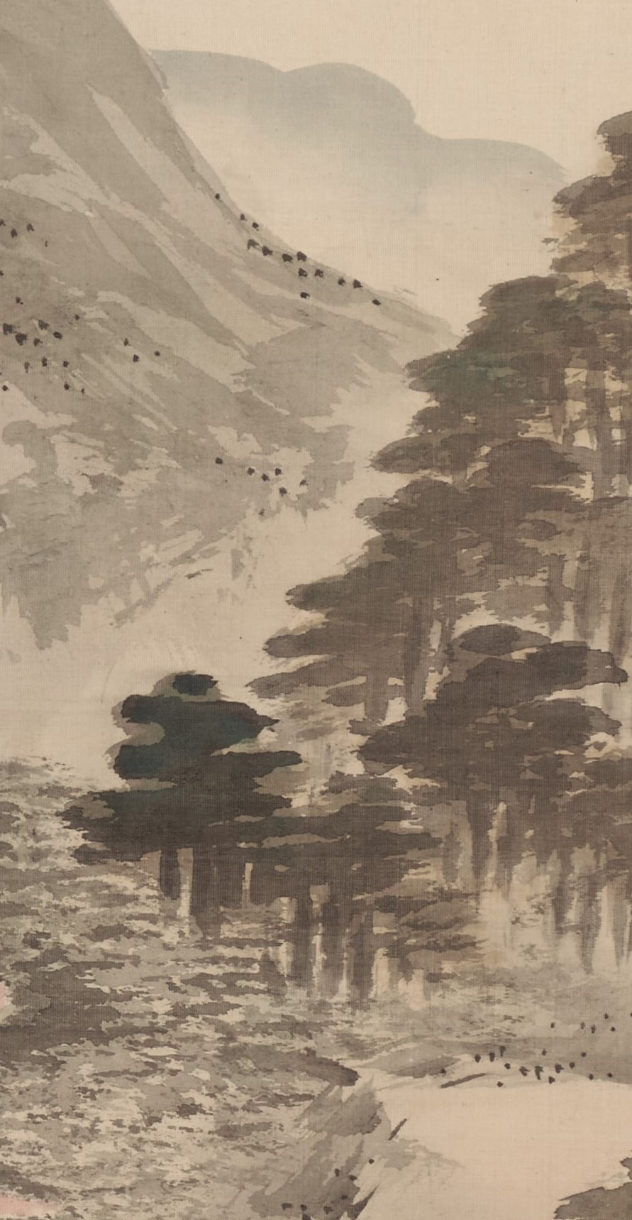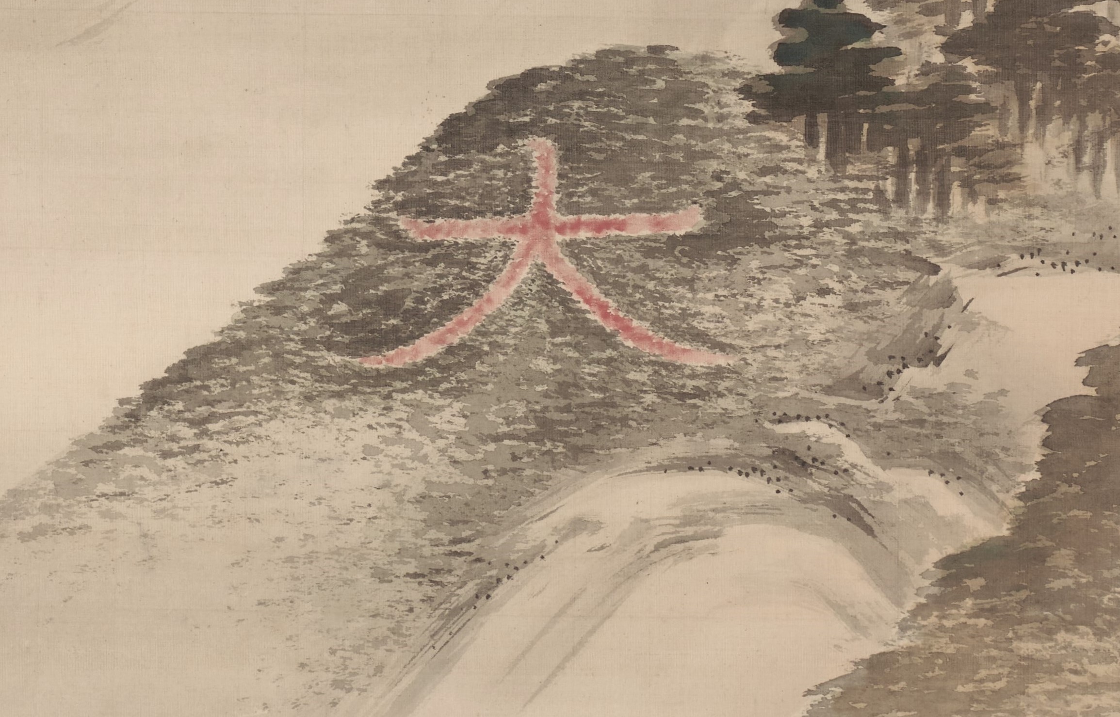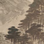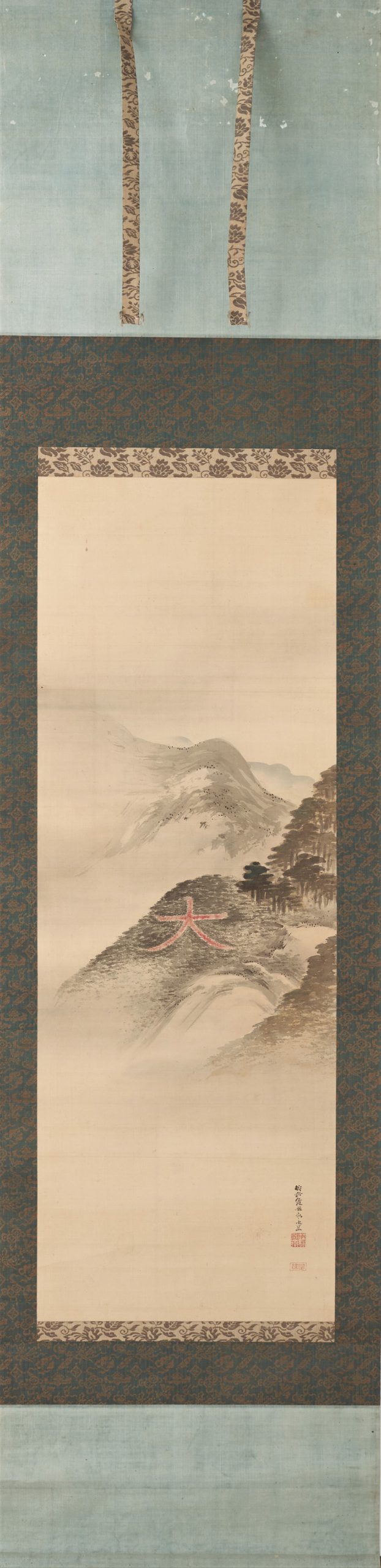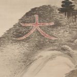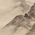 This is a rare work depicting a bonfire on Mt. Daimonji. The subject matter is unique to the artist, who was active in Kyoto. The fine brushstrokes represent the trees in the mountain. The mountains in front and behind the Mt. Daimonji are painted in white to express the texture of the mountains’ surface. The vermilion color of the “大” character has shades of gray, skillfully depicting the appearance of a blazing fire. The very light sumi ink used in the upper part of the painting expresses the dimness of a summer evening, and is a work of great artistic skill.