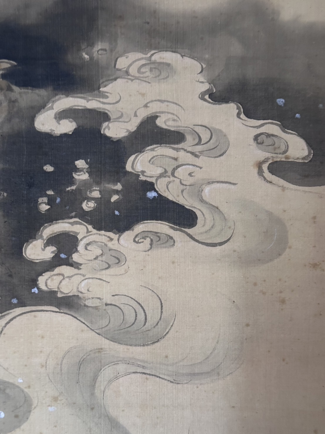 Yoshinobu’s skill can be seen in the way he maneuvered the complex composition into a coherent whole and in his skillful handling of the shades of black ink.Despite the small size of the painting, it is a masterpiece that radiates a profound presence.