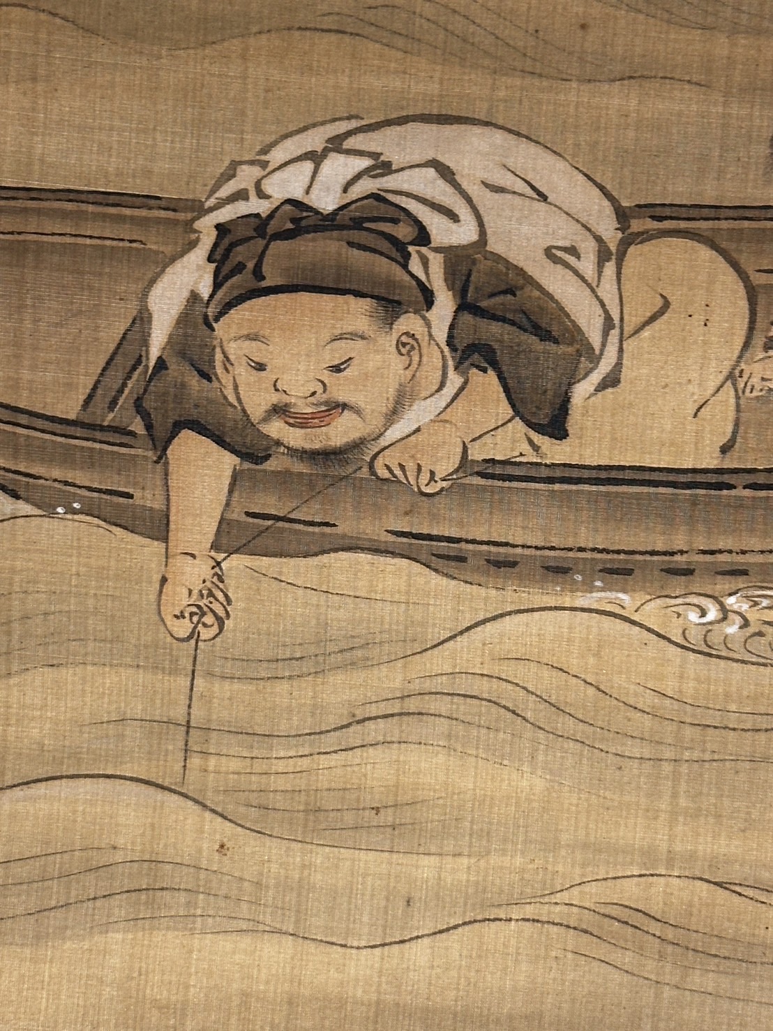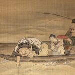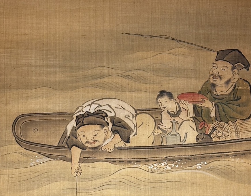 On the other hand, look at the man on the left leaning out of the boat and reeling in a fishing line. At the end of the fishing line he is dragging, you can see …… two large sea breams. You probably already know what I mean when I say “snapper” on a fishing rod. This is Ebisuten, one of the Seven Gods of Good Fortune, also known as the god of fishery.