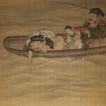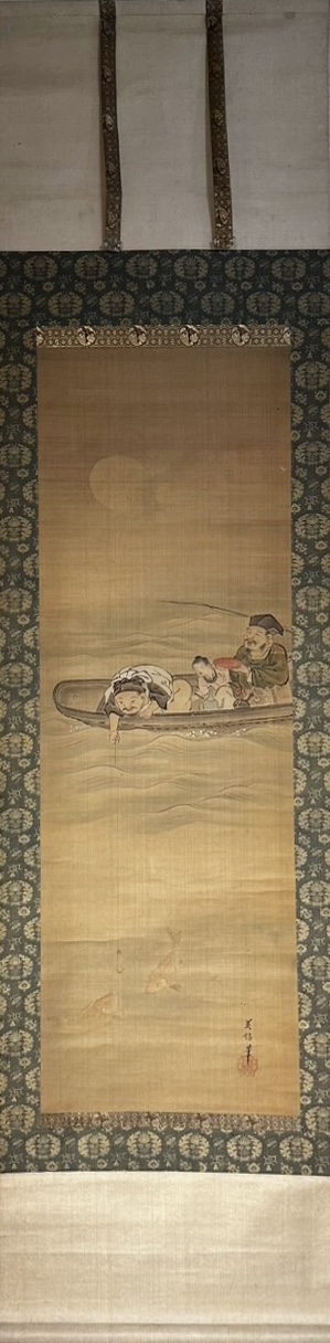 This work depicts two men and a Chinese child fishing in a boat under the moonlight.