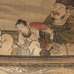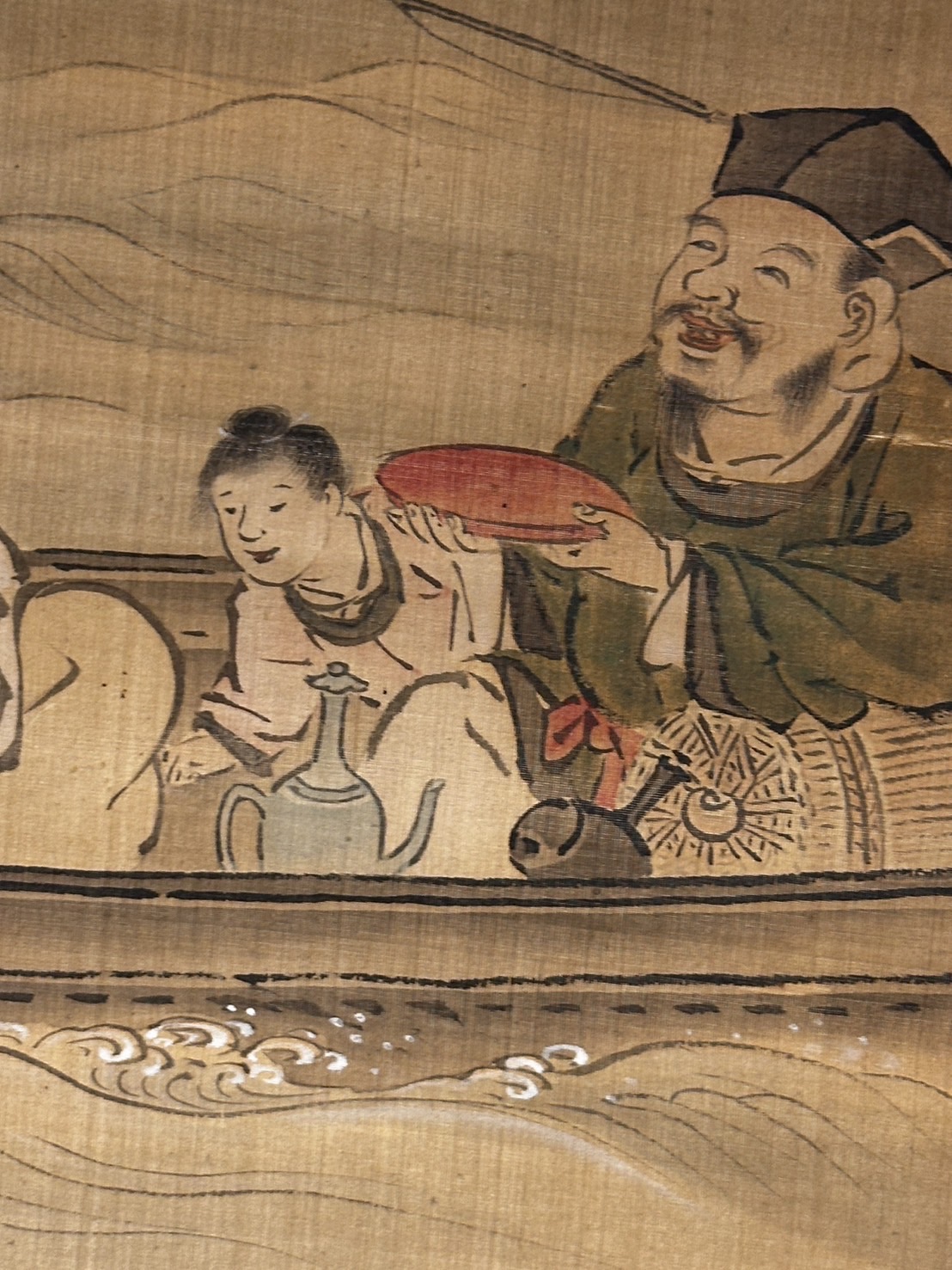 The man on the right is in a good mood, holding up a cup as large as his face. He may be saying, “How’s the fishing going?” He is Daikokuten, one of the Seven Gods of Good Fortune and known as the god of good harvest.