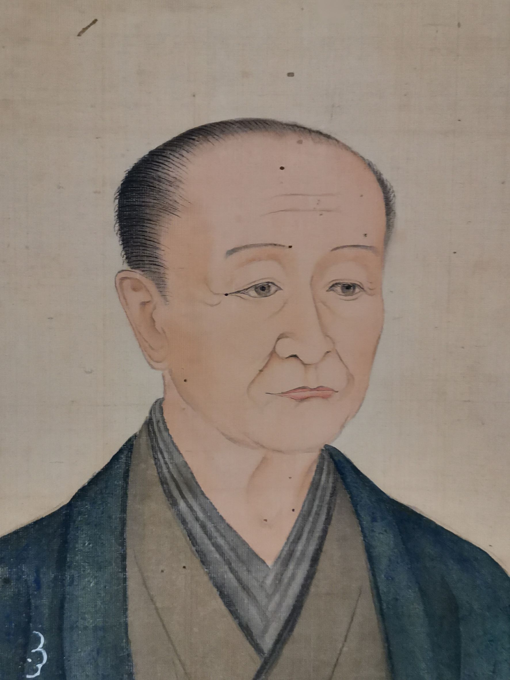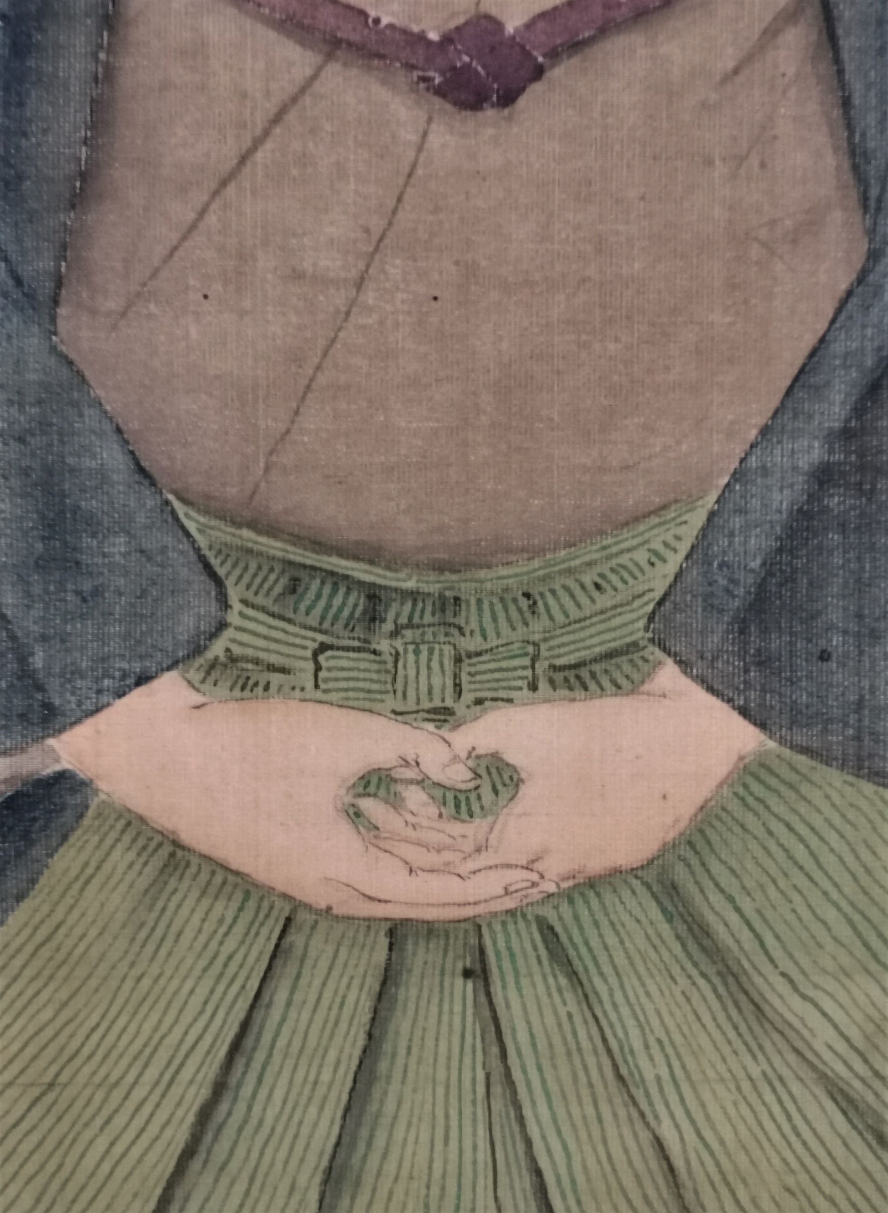 This is a very realistic portrait, especially surprising in that each eyelash is individually drawn. The wrinkles around the mouth, the hollows of the eyelids, the temples, and the hollows of the throat are all painted in relatively dark colors, creating a three-dimensional effect. The hands are folded as if to make a sign, and here again, even the joints of the fingers are accurately depicted. The artist’s keen powers of observation and attention to detail can be glimpsed in this work.