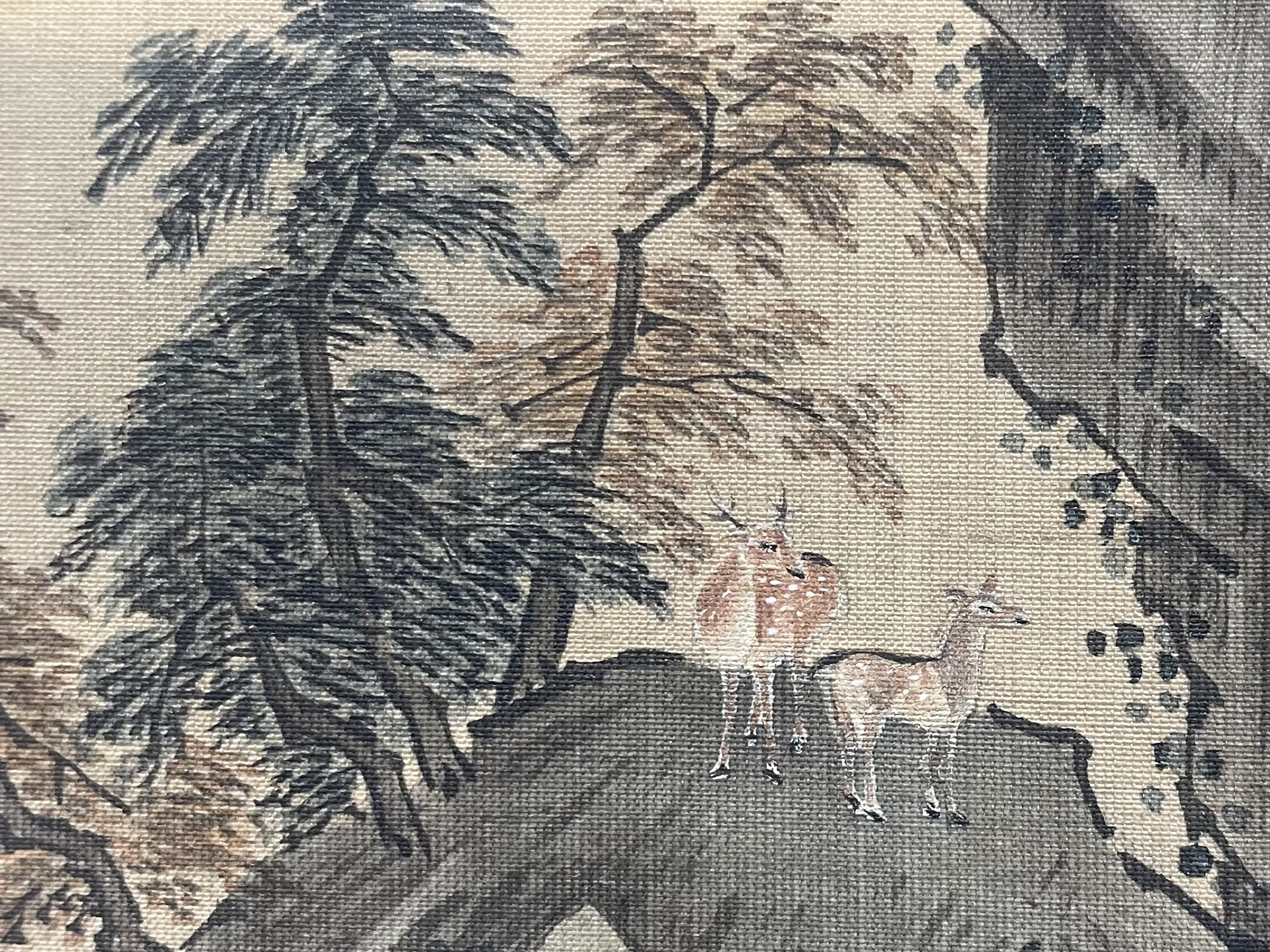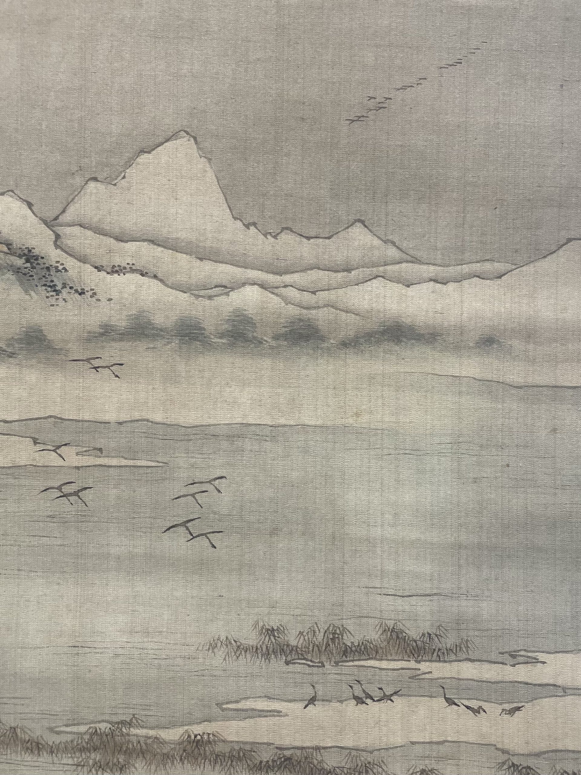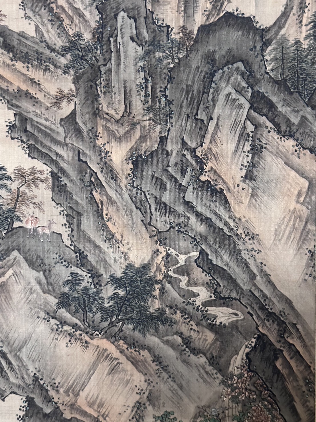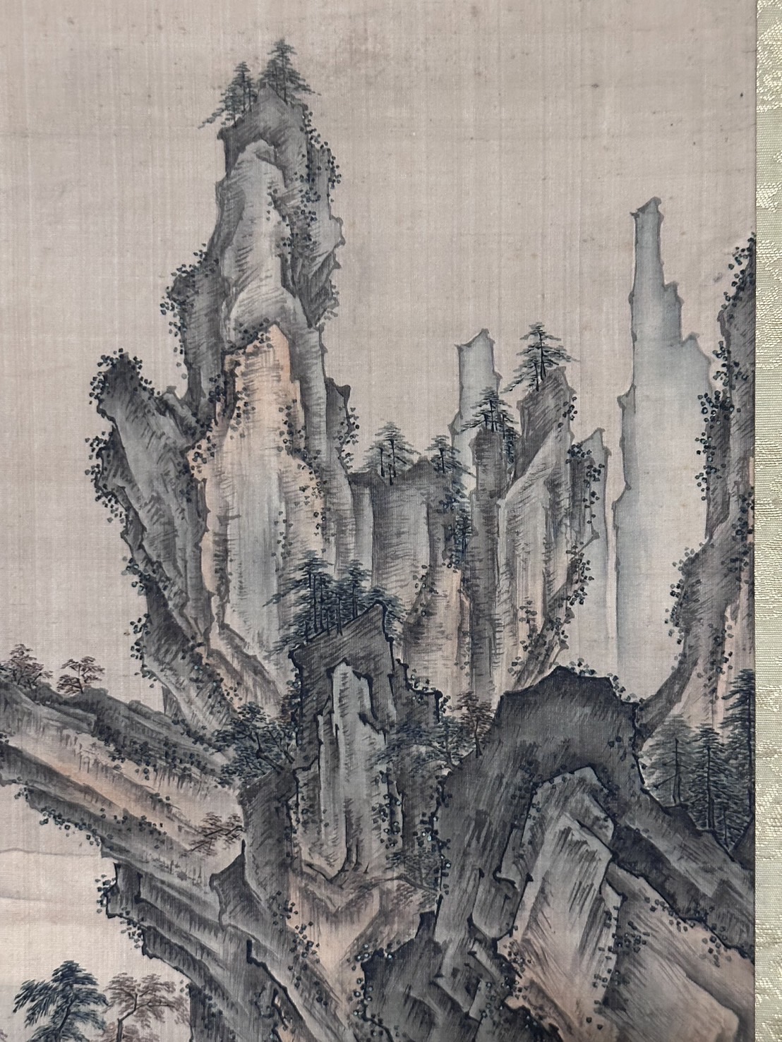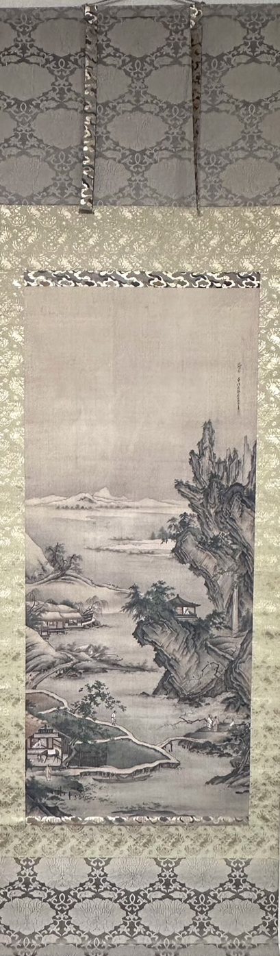 This work is a reproduction of “Landscape” by Kano Motonobu (1476-1559), whose current location is unknown.The “Landscape” was directly copied by Kano Tanyu (1602-1674), and painters around Tanyu repeatedly added their own arrangements to it, making it one of the most canonical works of the Edo Kano school.