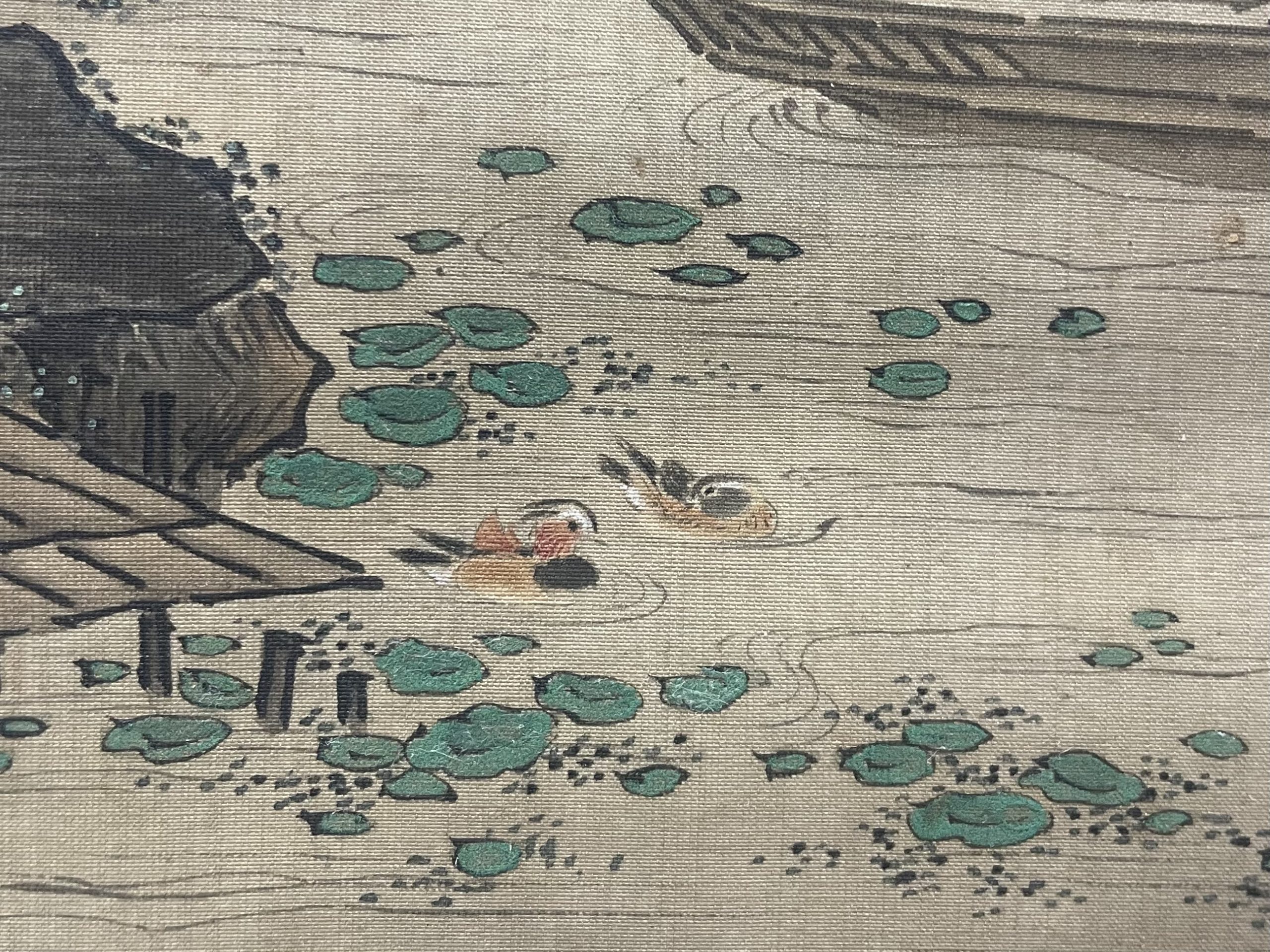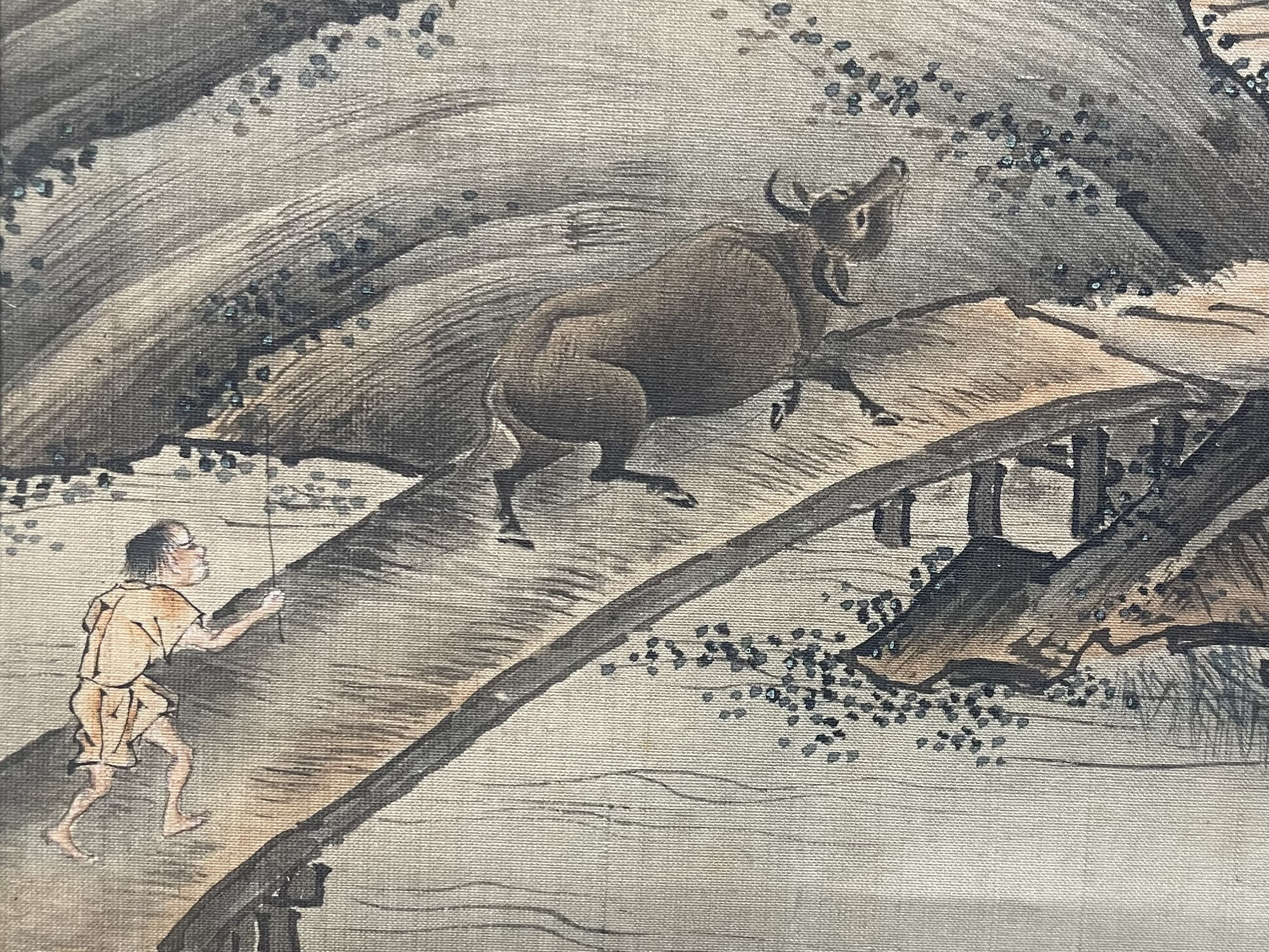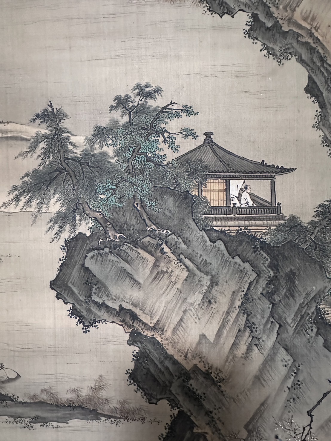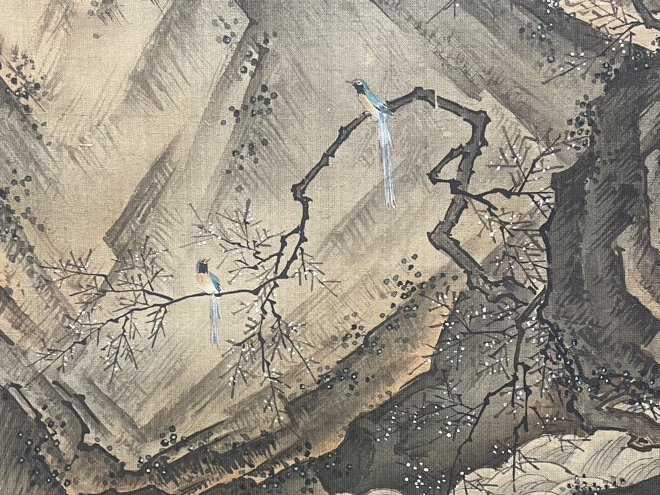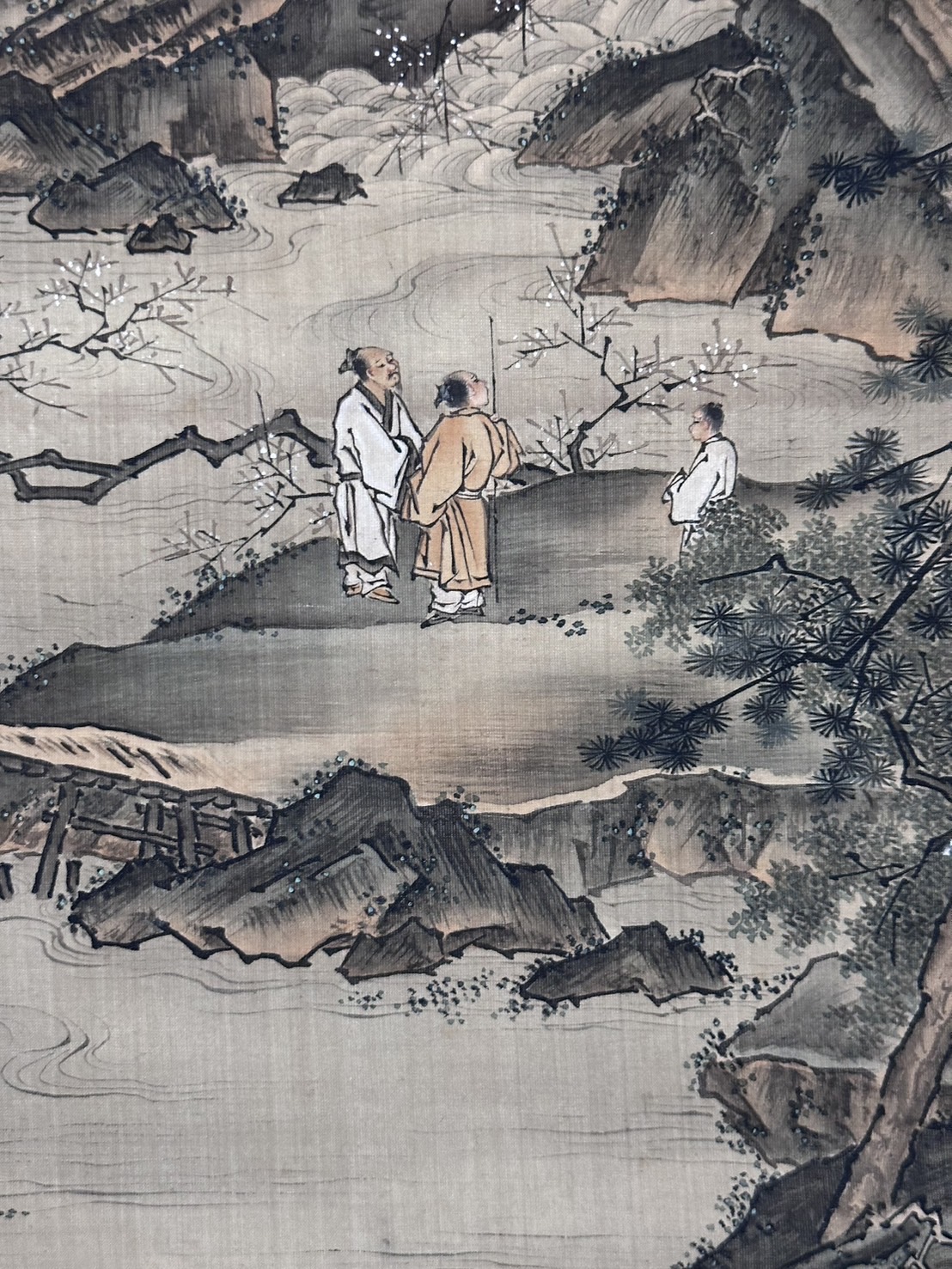 This work is a reproduction of “Landscape” by Kano Motonobu (1476-1559), whose current location is unknown.The “Landscape” was directly copied by Kano Tanyu (1602-1674), and painters around Tanyu repeatedly added their own arrangements to it, making it one of the most canonical works of the Edo Kano school.