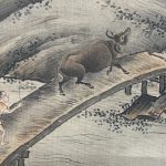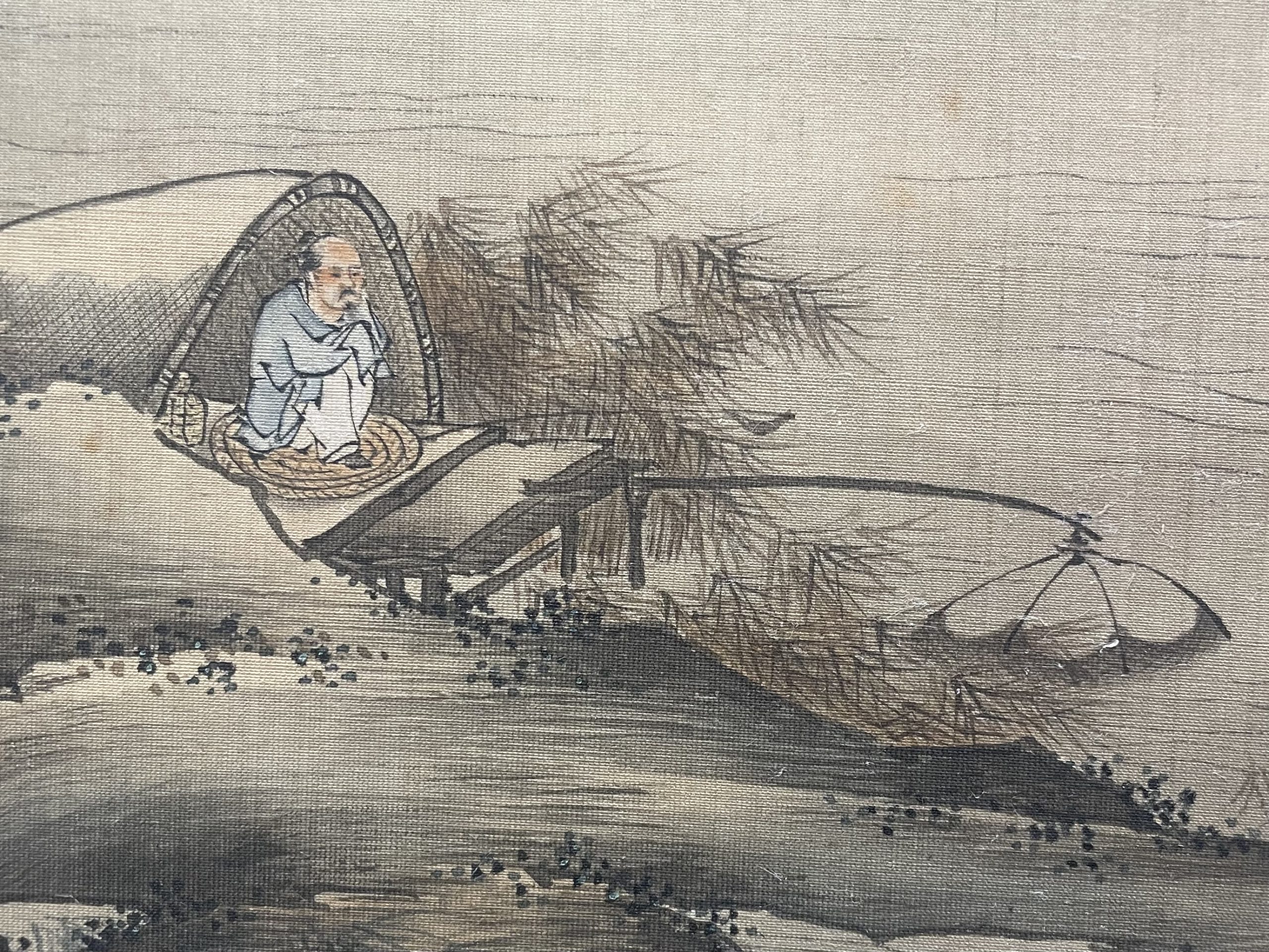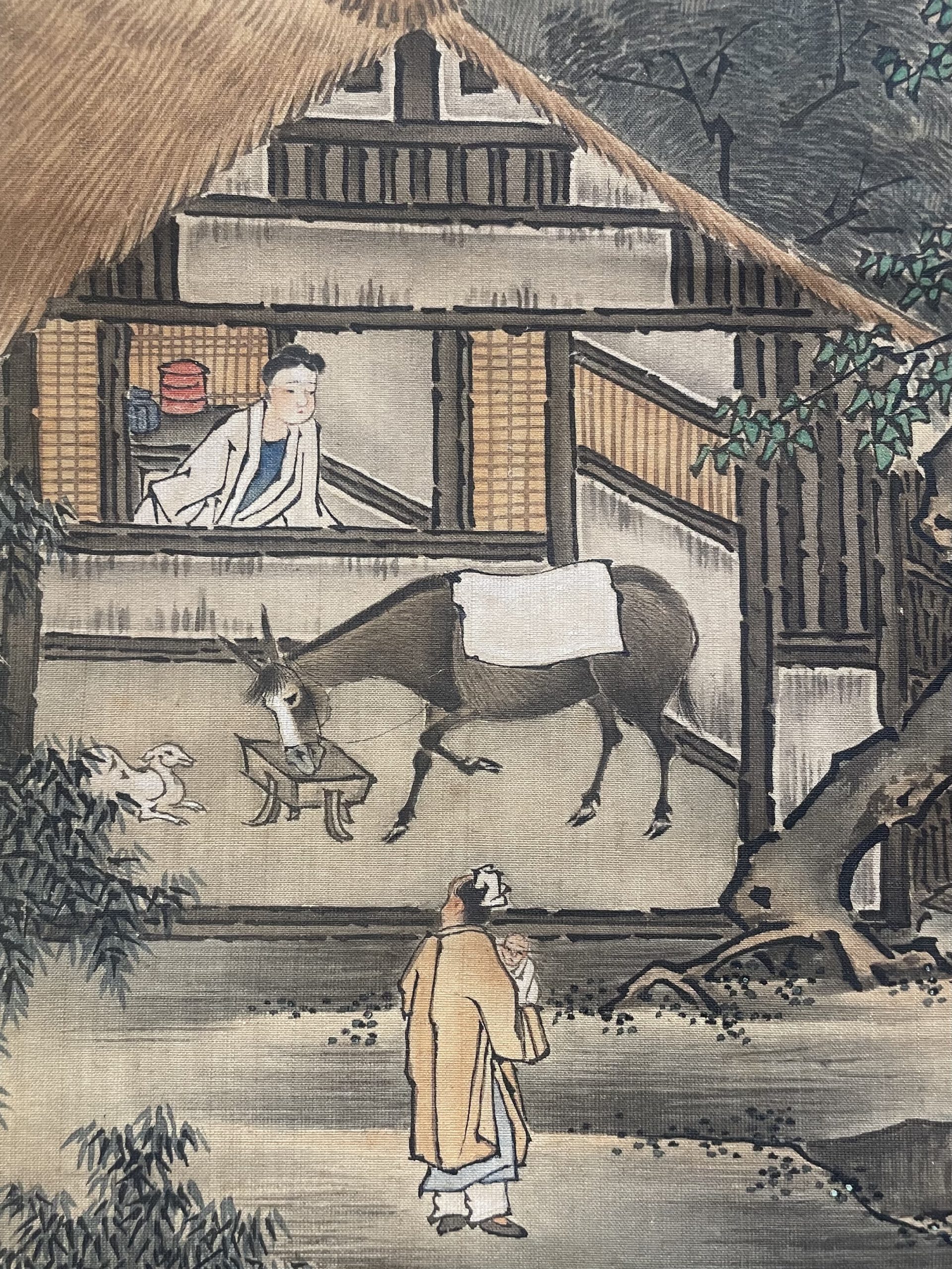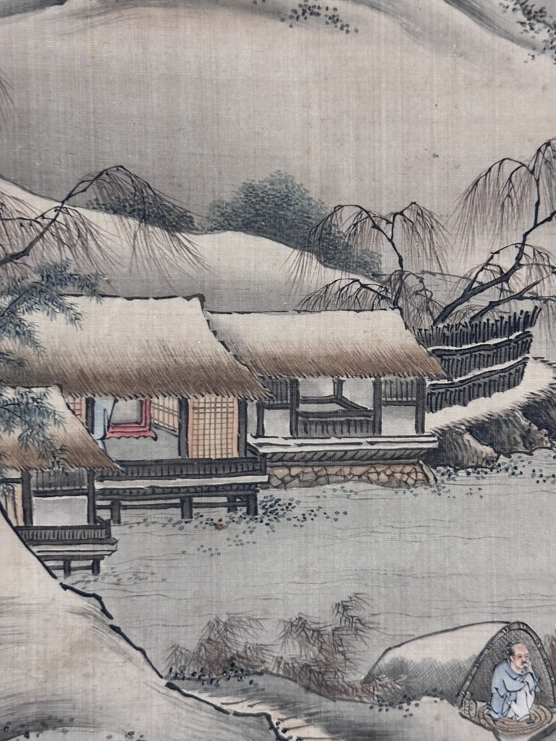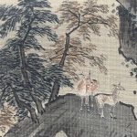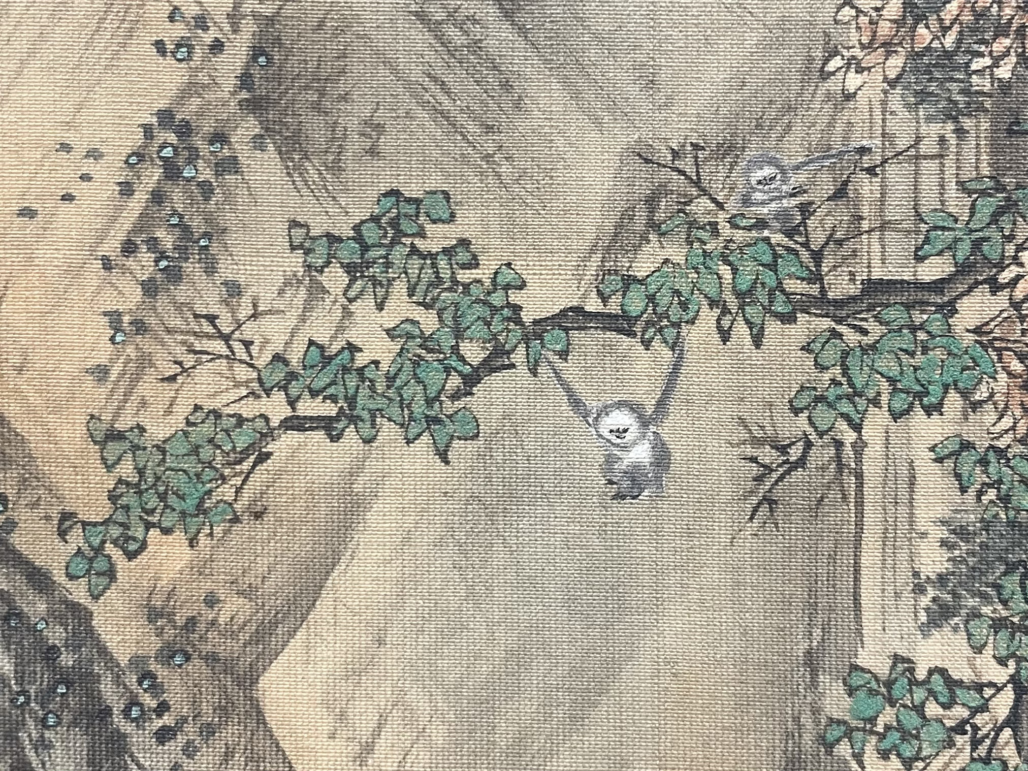This work is a reproduction of “Landscape” by Kano Motonobu (1476-1559), whose current location is unknown.The “Landscape” was directly copied by Kano Tanyu (1602-1674), and painters around Tanyu repeatedly added their own arrangements to it, making it one of the most canonical works of the Edo Kano school.