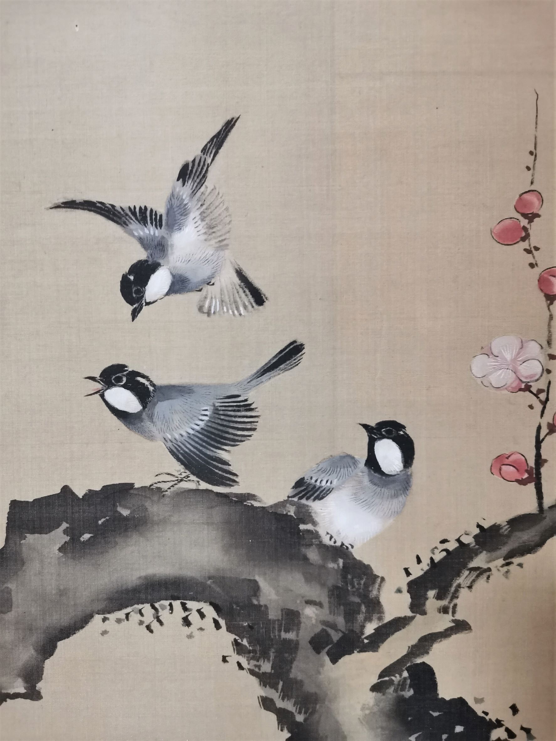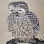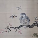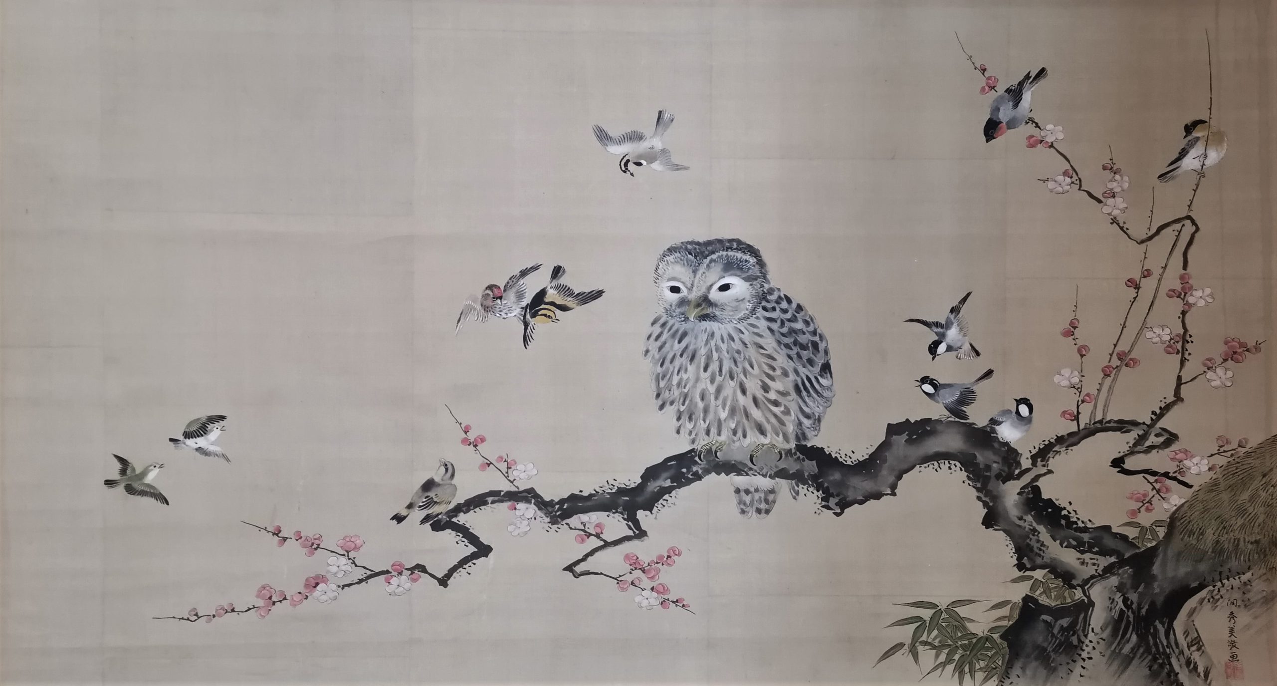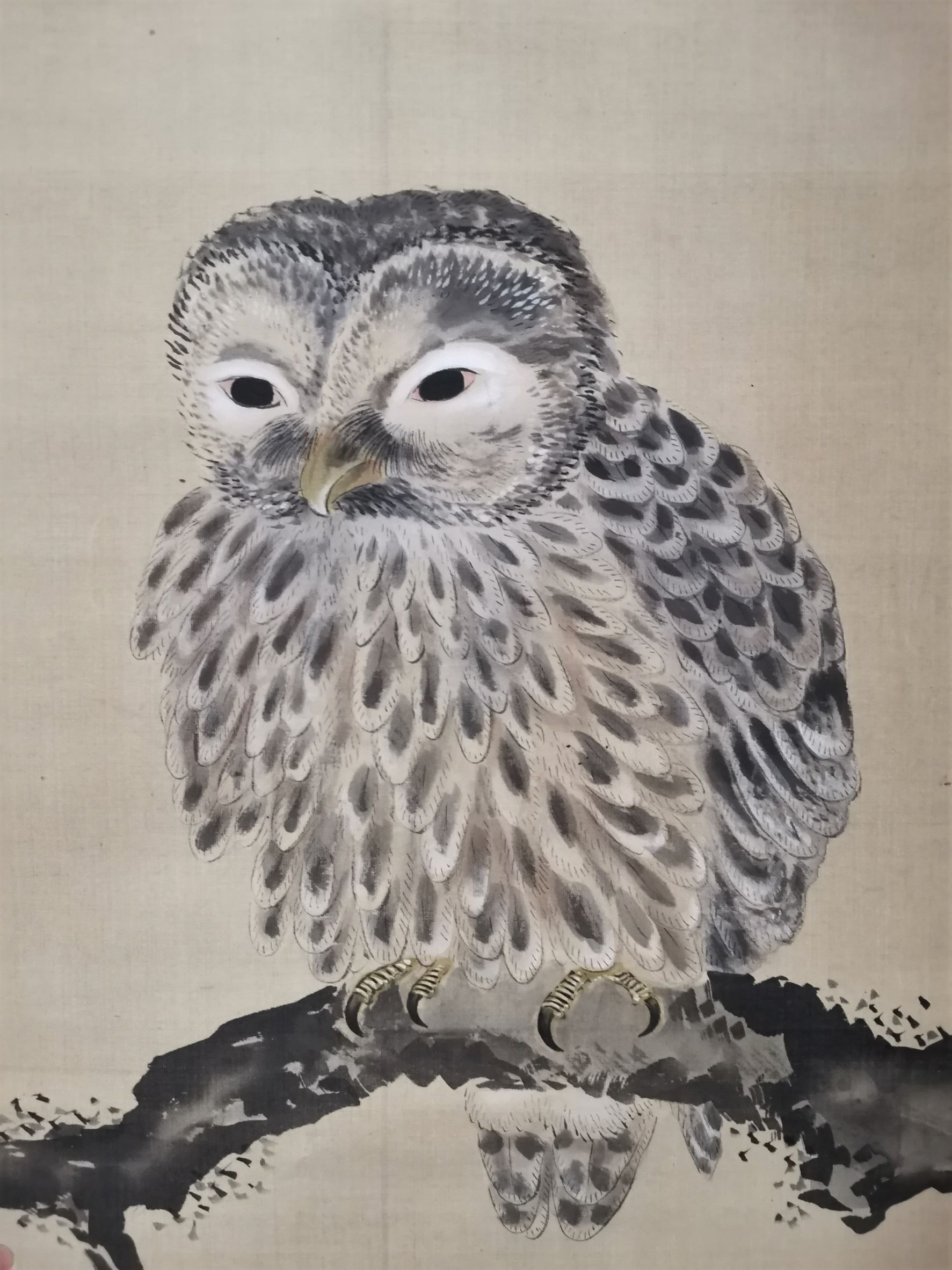 If you look closely at the ends of the zigzag flexing branches, you will see that some of them are still in bud. These plum blossoms are probably just beginning to bloom. The patterns of the birds are colored in gentle tones, and the fur of them is expressed by fine brush strokes throughout the work. On the other hand, the owl, which is resting its wings without a care in the world, has a plump, round silhouette that gives it a distinctive presence. The beak and whiskers are also faithfully depicted.